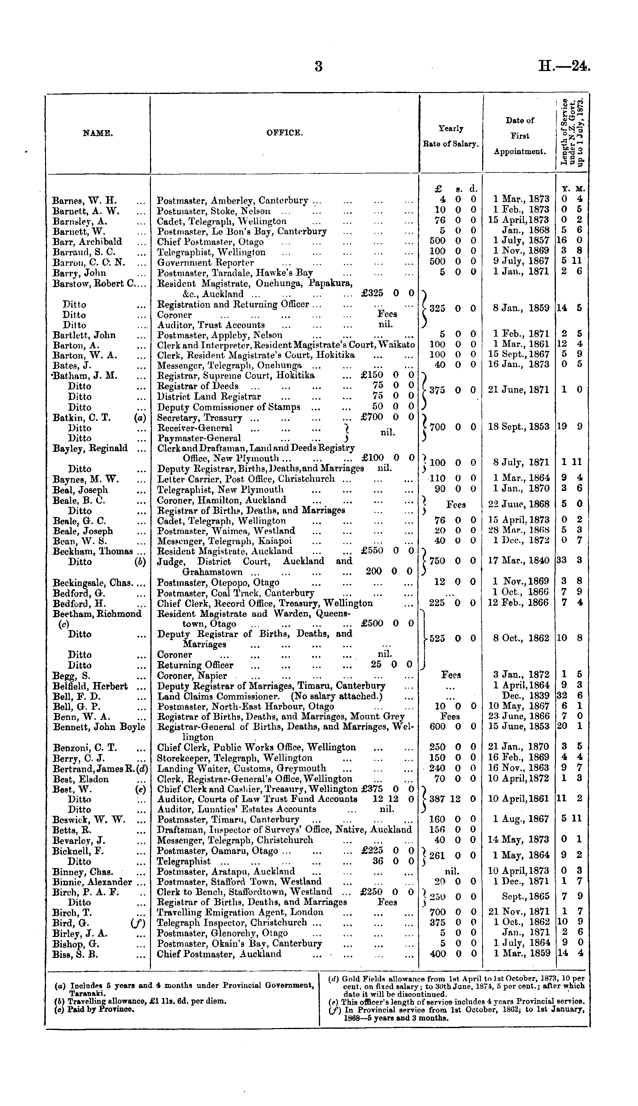 NAME. OFFICE. Yearly Date of First So . cc . t-. 3§§Rate of Salary. Appointment. Barnes, W. II. Baruett, A. W. Barnsley, A. Baruett, W. Barr, Archibald Barraud, S. C. Barren, O. O. K. ... Barry, Jolm Barst oh', Robert C Postmaster, Amberley, Canterbury Postmaster, Stoke, Nelson Cadet, Telegraph, Wellington Postmaster, Le lion's Bay, Canterbury Chief Postmaster, OtSgO Telegraphist, Wellington Government Reporter Postmaster, Taradale, Hawke's Bay Resident Magistrate, Onehunga, Papakura, &<:., Auckland £325 0 0 Registration and Returning Officer ... Coroner ... ... ... ... ... Fees Auditor, Trust Accounts ... ... ... nil. Postmaster, Appleby, Nelson Clerk and Interpreter. Resident Magistrate's Court, Waikato Clerk, Resident Magistrate's Court, Hokitika Messenger, Telegraph, Onehunga Registrar, Supreme Court, Hokitika ... £150 0 0 Registrar of Deeds 75 0 0 District Land Registrar 75 0 0 Deputy Commissioner of Stamps ... ... 50 0 0 Secretary, Treasury £700 0 0 Receiver-General ... ... ... "£ jj Paymaster-General ... ... .) Clerk and Draftsman, Land and Deeds Registry Office, New Plymouth £100 0 0 Deputy Registrar,Births,Deaths,and Marriages nil. Letter Carrier, Post Office, Christchurch ... Telegraphist, New Plymouth Coroner, Hamilton, Auckland Registrar of Births, Deaths, and Marriages Cadet, Telegraph, Wellington Postmaster, Waimea, Westhmd Messenger, Telegraph, Kaiapoi Resilient Magistrate, Auckland £550 0 0 Judge, District Court, Auckland and Grahamstown 200 0 0 Postmaster, Otepopo, Otago Postmaster, Coal Track, Canterbury Chief Clerk, Record Office, Treasury, Wellington Resident Magistrate and Warden, Queenstown, Otago £500 0 0 Deputy Registrar of Births, Deaths, and Marriages Coroner ... ... ... ... ... nil. Returning Officer 25 0 0 Coroner, Napier Deputy Registrar of Marriages, Timaru, Canterbury Land Claims Commissioner. (No salary attached.) Postmaster, North-East Harbour, Otago Registrar of Births, Deaths, and Marriages, Mount Grey Registrar-General of Births, Deaths, and Marriages, Wellington Chief Clerk, Public Works Office, Wellington Storekeeper, Telegraph, Wellington Landing Waiter, Customs, Greymouth Clerk, Registrar-General's Office, Wellington Chief Clerk and Casliier, Treasury, Wellington £375 0 0 Auditor, Courts of Law Trust Fund Accounts 12 12 O Auditor, Lunatics' Estates Accounts ... nil. Postmaster, Timaru, Canterbury Draftsman, Inspector of Surveys' Office, Native, Auckland Messenger, Telegraph, Christclmrch Postmaster, Oamaru, Otago ... ... ... £225 0 0 Telegraphist 3G 0 0 Postmaster, Aratapu, Auckland Postmaster, Stafford Town, Westland Clerk to Bench, Staffordtown, "Wcstland ... £250 0 0 Registrar of Births, Deaths, and Marriages Fees Travelling Emigration Agent, London Telegraph Inspector, Christchurch ... Postmaster, Glenorchy, Ot ago Postmaster, Okain's Bay, Canterbury Chief Postmaster, Auckland £ s. d. 4 0 0 10 0 0 76 0 0 5 0 0 500 0 0 100 0 0 500 0 0 5 0 0 1 Mar., 1873 1 Feb., 1873 15 April, 1873 Jan., 18(58 1 July, 1857 1 Nov., 1869 9 July, 1867 1 Jan., 1871 Y. M. 0 4 0 5 0 2 5 6 16 0 3 8 5 11 2 6 Ditto Ditto Ditto Bartlctt, John Barton, A. Barton, AV. A. Bates, J. •Batham, J. M. Ditto Ditto Ditto Batkin, C. T. (a) Ditto Ditto Bay ley, Reginald ... 0 0 8 Jan., 1859 14 5 5 0 0 100 0 0 100 0 0 40 0 0 "1 1 Feb., 1871 1 Mar., 1861 15 Sept., 1867 16 Jan., 1873 2 5 12 4 5 9 0 5 [375 0 0 81 June, 1871 1 0 1700 0 0 18 Sept., 1853 19 9 I 100 0 0 8 July, 1871 1 11 Ditto Baynes, M. W. Beal, Joseph Beale, B. 6. Ditto Beale, G. C. Beale, Joseph Bean, W. S. Beckham, Thomas ... Ditto (4) 110 0 0 90 0 0 Fees 76 0 0 20 0 0 40 0 0 1 Mar., 186-1 1 Jan., 1870 22 June, 1868 15 April. 1873 28 Mar.,' 1868 1 Dee., 1872 9 4 3 6 5 0 0 2 5 3 0 7 £ 750 0 0 17 Mar., 1840 33 3 Beckingsale, Chas. ... Bedford, G. Bedford, H. Beetham, Richmond w Ditto 12 0 0 225 0 0 1 Nov., 1869 1 Oct., 1866 12 Feb., 1866 3 8 7 9 7 4 1 U25 0 0 8 Oct., 1862 10 8 Ditto Ditto Begg, S. Bellield, Herbert ... Bell, F. D. Bell, G. P. Bonn, W. A. Bennett, John Boyle Fees 3 Jan., 1872 1 April, 1864 Dec, 1839 10 May, 18fi7 23 June, 1866 15 June, 1853 1 5 9 3 32 6 6 1 7 0 20 1 10 0 0 Fees 600 0 0 Benzoni, C. T. Berry, 0, J. Bert rand, James R. (rf) Best, Elsdon Best, W. (<?) Ditto Ditto Bcswiek, W. W. ... Betts, R. Bcvarlev, J. Bickneli, P. Ditto Binney, Chas. Binnie, Alexander ... Birch, P. A. F. Ditto Birch, T. Bird, G. (/) Birley, J. A. Bishop, G-. Biss, S. B. 250 0 0 150 0 0 240 0 0 70 0 0 21 Jan., 1870 16 Feb., 1869 16 Nov., 1863 10 April, 1872 3 5 4 4 9 7 1 3 i 387 12 0 10 April, 1861 11 2 160 0 0 150 0 0 40 0 0 1 Aug., 1867 5 11 14 May, 1873 0 1 1 261 0 0 1 May, 1864 9 2 nil. 20 0 0 10 April, 1873 1 Dec, 1871 0 3 1 7 '■ 25l> 0 0 Sept., 1865 7 9 700 0 0 375 0 0 5 0 0 5 0 0 400 0 0 21 Nov., 1871 1 Oct., 1862 Jan., 1871 1 July, 1864 1 Mar., 1859 1 7 10 9 2 6 9 0 14 4 (a) Includes 5 years am Taranaki. (h) Travelling allowance, \c) Paid by Province. 4 months under Provincial Government, II 11s. 6d. per diem. ((/) Gold Fields allowam cent, on fixed salary ditto it will be discoi (<■) This officer's length c (f) In Provineial Hervii 1BB8— S years and 3 ?e from 1st April ; to 30th June, IS itinued. service include! ;e from 1st Octo months. to 1st October, 3873, 10 per 371, 5 per cent.; after which a \ years Provincial service, iber, 1802; to 1st January,