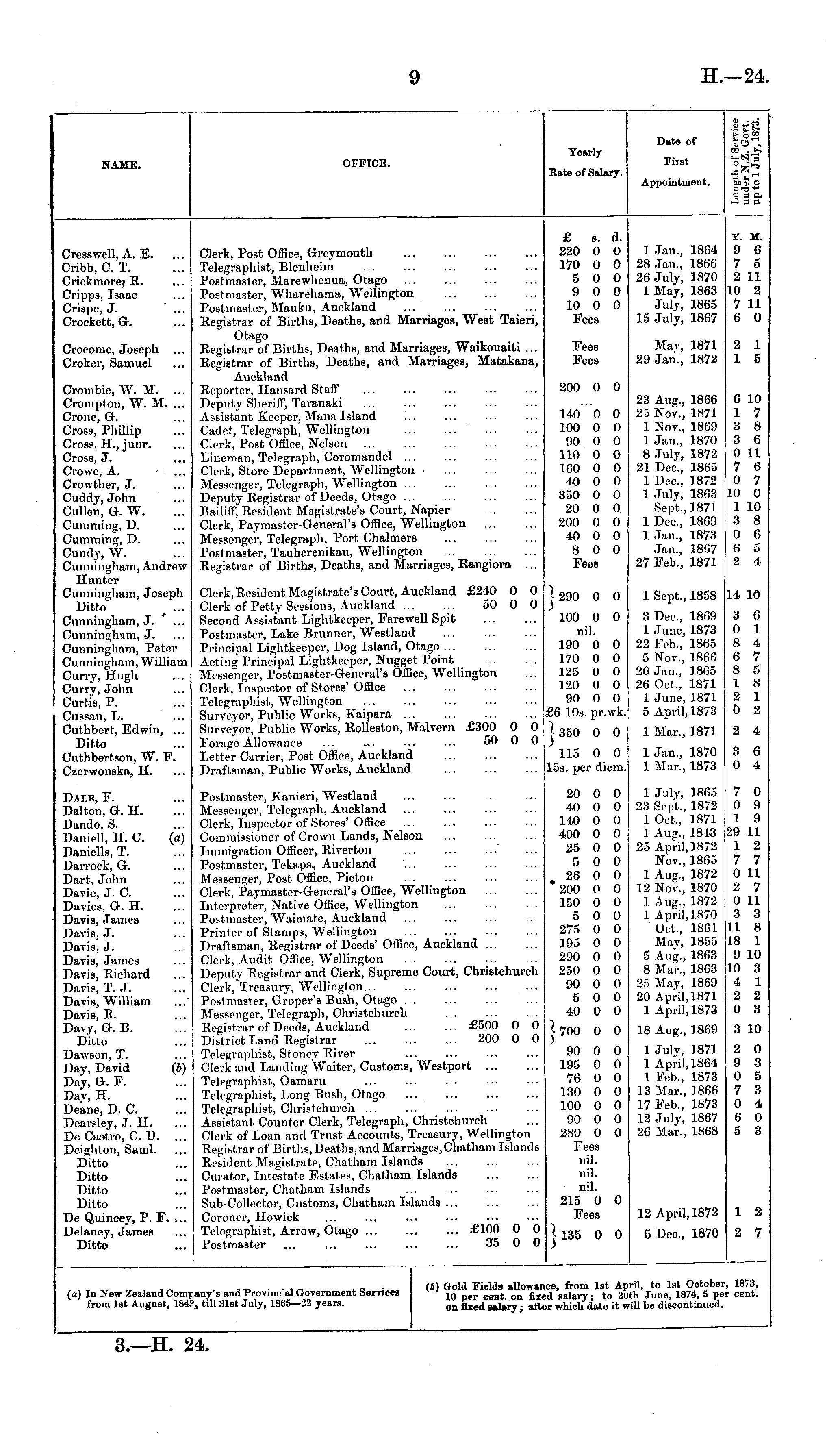 NAME. OFFICE. Yearly Date of First IIs. tX)£_O Kate of Salary. Appointment. Cresswell, A. E. Cribb, C. T. Crickmorej R. Cripps, Isaac Crispe, J. ... Crockett, Or. Cleric, Post Office, Greymouth Telegraphist, Blenheim Postmaster, Marewhenua, Otago Postmaster, Wharehanm, Wellington Postmaster, Mauku, Auckland Registrar of Births, Deaths, and Marriages, West Taieri, Otago Registrar of Births, Deaths, and Marriages, Waikouaiti ... Registrar of Births, Deaths, and Marriages, Matakana, Auckland Reporter, Hansard Staff Deputy Sheriff, Taranaki Assistant Keeper, Mana Island Cadet, Telegraph, Wellington ' Clerk, Post Office, Nelson Lineman, Telegraph, Coromandel ... Clerk, Store Department, Wellington Messenger, Telegraph, Wellington ... Deputy Registrar of Deeds, Otago Baililf, Resident Magistrate's Court, Napier Clerk, Paymaster-General's Office, Wellington Messenger, Telegraph, Port. Chalmers Postmaster, Tauherenikau, Wellington Registrar of Births, Deaths, and Marriages, Rangiora ... £ 8. d. 220 0 0 170 0 0 5 0 0 9 0 0 10 0 0 Fees 1 Jan., 1804 28 Jan., 186G 26 July, 1870 1 May, 18G3 July, 1865 15 July, 1867 Y. M. 9 6 7 5 2 11 10 2 7 11 6 0 Crocome, Joseph Croker, Samuel Fees Fees Mar, 1871 29 Jan., 1872 2 1 1 5 Croinbie, W. M. ... Crompton, W. M. ... Crone, G. Cross, Phillip Cross, H., junr. Cross, J. Crowe, A. ... Crowthcr, J. Cuddy, John Cullen, G. W. dimming, D. Camming, D. dandy, W. Cunningham, Andrew Hunter Cunningham, Joseph Ditto ... Cunningham, J. Cunningham, J. Cunningham, Peter Cunningham, William Curry, Hugh Curry, John Curtis, P. Cussan, L. Cuthbert, Edwin, ... Ditto Cuthbertson, W. F. Czerwonska, II. 200 0 0 23 Aug., 1866 25 Nov., 1871 1 Nov., 1869 1 Jan., 1870 8 July, 1872 21 Dec, 1865 1 Dee., 1872 1 July, 1863 Sept., 1871 1 Dec, 1869 1 Jan., 1873 Jan., 1867 27 Feb., 1871 6 10 1 7 3 8 3 6 0 11 7 t> 0 7 10 0 1 10 3 8 0 6 « 5 2 4 140 0 0 100 0 0 90 0 0 110 0 0 160 0 0 40 0 0 350 0 0 20 0 0 200 0 0 40 0 0 8 0 0 Fees Clerk, Resident Magistrate's Court, Auckland £240 0 0 Clerk of Petty Sessions, Auckland 50 0 0 Second Assistant Lightkeeper, Farewell Spit Postmaster, Lake Brunner, Westland Principal Lightkeeper, Dog Island, Otago Acting Principal Lightkeeper, Nugget Point Messenger, Postmaster-General's Office, Wellington Clerk, Inspector of Stores' Office Telegraphist, Wellington Surveyor, Public Works, Kaipara Surveyor, Public Works, Rolleston, Malvern £300 0 0 Forage Allowance ... ~. ... ■■■ 50 0 0 Let tcr Carrier, Post Office, Auckland Draftsman, Public Works, Auckland ', t- 290 0 0 1 Sept., 1858 14 10 100 0 0 nil. 190 0 0 170 0 0 125 0 0 120 0 0 90 0 0 £6 10s. pr.wk. | 350 0 0 3 Dec, 1869 1 June, 1873 22 Feb., 1865 5 Nov., 1866 20 Jan., 1865 26 Oct., 1871 1 June, 1871 5 April, 1873 3 G 0 1 8 4 6 7 8 5 1 8 2 1 0 2 1 Mar., 1871 2 4 115 0 0 15s. per diem. 1 Jan., 1870 1 Mar., 1873 3 6 0 4 DAI.13, F. Dal ton, a. II. Dando, S. Daniell, H. C. (a) Paniells, T. Darrock, Gr. Dart, John Davie, J. C. Davies. G. II. Davis, James Davis, J. Davis, J. Davis, James Davis, Richard Davis, T. J. Davis, William Davis, R. Davy, G. B. Ditto Dawson, T. Day, David (J) Day, G. F. Day, H. Deane, D. C. Dearsley, J. H. De Castro, C. D. ... Deighton, Sftml. Ditto Ditto Ditto Ditto De Quineey, P. F. ... Delanoy, James Ditto Postmaster, Kanieri, Westland Messenger, Telegraph, Auckland Clerk, Inspector of Stores'Office Commissioner of Crown Lands, Nelson Immigration Officer, Riverton Postmaster, Tekapa, Auckland Messenger, Post Office, Picton Clerk, Paymaster-General's Office, Wellington Interpreter, Native Office, Wellington Postmaster, Waimate, Auckland Printer of Stamps, Wellington Draftsman, Registrar of Deeds' Office, Auckland Clerk, Audit Office, Wellington Deputy Registrar and Clerk, Supreme Court, Christchureh Clerk, Treasury, Wellington Postmaster, Groper's Bush, Otago ... Messenger, Telegraph, Christchureh Registrar of Deeds, Auckland £500 0 0 District Land Registrar 200 0 0 Telegraphist, Stoney River Clerk and Landing Waiter, Customs, Westport Telegraphist, Oamaru Telegraphist, Long Bush, Otago Telegraphist, Christehurch ... Assistant Counter Clerk, Telegraph, Christchureli Clerk of Loan and Trust Accounts, Treasury, Wellington Registrar of Births,Deaths.and Marriages,Chatham Islands Resident Magistrate, Chatham Islands Curator, Intestate Estates, Chatham Islands Postmaster, Chatham Islands Sub-Collector, Customs, Chatham Islands ... Coroner, Howick Telegraphist, Arrow, Otago £100 0 0 Postmaster 35 0 0 20 0 0 40 0 0 140 0 0 400 0 0 25 0 0 5 0 0 26 0 0 * 200 0 0 150 0 0 5 0 0 275 0 0 195 0 0 290 0 0 250 0 0 90 0 0 5 0 0 40 0 0 1 July, 1805 23 Sept., 1872 1 Oct., 1871 1 Aug., 1813 25 April, 1872 Nov., 1865 1 Aug., 1872 12 Nor., 1870 1 Aug., 1872 1 April, 1870 Oct., 1861 May, 1855 5 Aug., 1863 8 Mai-., 1863 23 May, 1869 20 April,1871 1 April, 1873 7 0 0 9 1 9 29 11 1 2 7 7 0 11 2 7 0 11 3 3 11 8 18 1 9 10 10 3 4 1 2 2 0 3 | 700 0 0 18 Aug., 1869 3 10 90 0 0 195 0 0 76 0 0 130 0 0 100 0 0 90 0 0 280 0 0 Fees nil. nil. ■ nil. 215 0 0 Fees 1 July, 1871 1 April, 1864 1 Feb., 1873 13 Mar., 1866 17 Feb., 1873 12 July, 1867 26 Mar., 1868 2 0 9 3 0 5 7 3 0 4 6 0 5 3 12 April, 1872 1 2 | 135 0 0 5 Dee., 1870 2 7 (a) In New Zealand Com from 1st August, 184 ._...,,, ie , (5) Gold Fields allowam any sand Provincal Government Services ' ln _„_ „„» n _ «,„, >, til olst July, 1806-22 years. ™ &^try" lite ;e, from 1st Api 1 salary; to 301 r which date it w ril, to lat October th June, 1874, 5 pe] ■ill be discontinued. 1873, cent. 3.—H. 24