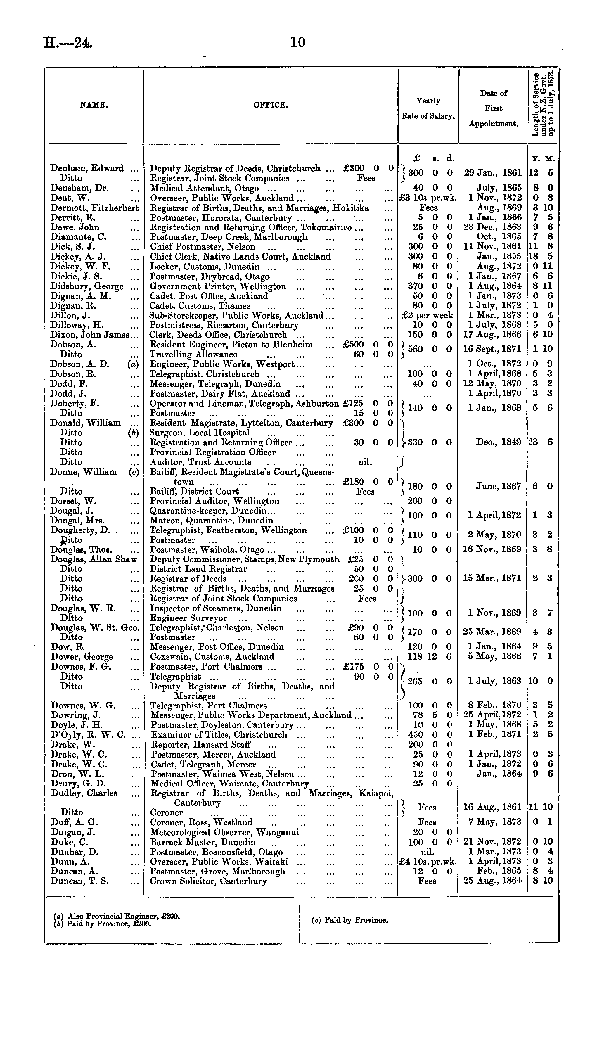 NAME. OFFICE. Yearly Date of First <D .CO as p Rate of Salary. Appointment. £ s. d. T. It. Denham, Edward ... Ditto Densham, Dr. . . Dent, W. Dermott, Fitzherbert Derritt, E. Dewe, John Diamante, C. Dick, S. J. Dickey, A. J. Dickey, W. F. Dickie, J. S. Didsbury, George ... Dignan, A. M. Dignan, R. Dillon, J. Dilloway, H. Dixon, John James... Dobson, A. Ditto Dobson, A. D. (a) Dobson, R. Dodd, F. Dodd, J. Doherty, F. Ditto Donald, William ... Ditto (6) Ditto Ditto Ditto Donne, William (c) Deputy Registrar of Deeds, ChriBtchurch ... £300 0 0 Registrar, Joint Stock Companies ... ... Fees Medical Attendant, Otago ... Overseer, Public Works, Auckland ... Registrar of Births, Deaths, and Marriages, Hokitika Postmaster, Hororata, Canterbury ... Registration and Returning Officer, Tokomairiro ... Postmaster, Deep Creek, Marlborough Chief Postmaster, Nelson Chief Clerk, Native Lands Court, Auckland Locker, Customs, Dunedin ... Postmaster, Drvbread, Otago Government Printer, Wellington ... Cadet, Post Office, Auckland Cadet, Customs, Thames Sub-Storekeeper, Public Works, Auckland... Postmistress, Riccarton, Canterbury Clerk, Deeds Office, Christehureh ... Resident Engineer, Pieton to Blenheim ... £500 0 0 Travelling Allowance ... ... ... 60 0 0 Engineer, Public Works, Westport... Telegraphist, Christehureh ... Messenger, Telegraph, Dunedin Postmaster, Dairy Flat, Auckland ... Operator and Lineman, Telegraph, Ashburton £125 0 0 Postmaster 15 0 0 Resident Magistrate, Lyttelton, Canterbury £300 0 0 Surgeon, Local Hospital Registration and Returning Officer ... ... 30 0 0 Provincial Registration Officer Auditor, Trust Accounts ... ... ... nil. Bailiff, Resident Magistrate's Court, Queenstown £180 0 0 Bailiff, District Court Fees Provincial Auditor, Wellington Quarantine-keeper, Dunedin... Matron, Quarantine, Dunedin Telegraphist, Featherston, Wellington ... £100 O 0 Postmaster 10 0 0 Postmaster, Waihola, Otago ... Deputy Commissioner, Stamps,New Plymouth £25 0 0 District Land Registrar 50 O 0 Registrar of Deeds 200 0 0 Registrar of Births, Deaths, and Marriages 25 0 0 Registrar of Joint Stock Companies ... Fees Inspector of Steamers, Dunediu Engineer Surveyor Telegraphist,'Charles.ton, Nelson £90 0 0 Postmaster 80 0 0 Messenger, Post Office, Dunedin Coxswain, Customs, Auckland Postmaster, Port Chalmers £175 0 0 Telegraphist 90 0 0 Deputy Registrar of Births, Deaths, and Marriages Telegraphist, Port Chalmers Messenger,Public Works Department, Auckland ... Postmaster, Doyleston, Canterbury ... Examiner of Titles, Christehureh ... Reporter, Hansard Staff Postmaster, Mercer, Auckland Cadet, Telegraph, Mercer Postmaster, Waimea West, Nelson ... Medical Officer, Wiiimate, Canterbury Registrar of Birthl, Deaths, and Marriages, Kaiapoi, Canterbury 1 300 0 0 29 Jan., 1861 12 5 40 0 0 £3 10s. pr.wk. Fees 5 0 0 25 0 0 6 0 0 300 0 0 300 0 0 80 0 0 6 0 0 370 0 0 50 0 0 80 0 0 £2 per week 10 0 0 150 0 0 July, 1865 1 Nov., 1872 Aug., 1869 1 Jan., 1866 23 Dec, 18G3 Oct., 1865 11 Nov., 1861 Jan., 1855 Aug., 1872 1 Jan., 1867 1 Aug., 1864. 1 Jan., 1873 1 July, 1872 1 Mur., 1873 1 July, 1868 17 Aug., 1866 8 0 0 8 3 10 7 5 9 6 7 8 U 8 18 5 0 11 6 6 8 11 0 6 1 0 0 4 5 0 6 10 | 560 0 0 16 Sept., 1871 1 10 100 0 0 40 0 0 1 Oct., 1872 1 April, 1868 12 May, 1870 1 April, 1870 1 Jan., 1868 0 9 5 3 3 2 3 3 -\ ] 140 0 0 "I 5 6 I330 0 0 ] Dec, 1849 23 6 I 180 0 0 June, 1867 Ditto Dorset, W. Dougal, J. Dougal, Mrs. Dougherty, D. JJitto Douglas, Thos. Douglas, Allan Shaw Ditto Ditto Ditto Ditto Douglas, W. R. Ditto Douglas, W. St. Geo. Ditto Dow, R. Dower, George Downes, F. G. Ditto Ditto 200 0 0 100 0 0 1 110 0 0 10 0 0 1 j>300 0 0 1 April, 1872 2 May, 1870 16 Nov., 1869 15 Mar., 1871 6 0 1 3 3 2 3 8 2 3 | 100 0 0 1 Nov., 1869 3 7 '■ 170 0 0 25 Mar., 1869 4 3 120 0 0 118 12 6 1 Jan., 1864 5 May, 1866 9 5 7 1 V 265 0 0 1 July, 1863 10 0 Downes, W. G. Dowring, J. Doyle, J. H. D'Oyly, R. W. C. ... Drake, W. Drake, W. C. Drake, W. C. Dron, W. L. Drury, G. D. Dudley, Charles ; 100 0 0 78 5 0 10 0 0 450 0 0 200 0 0 25 0 0 90 0 0 12 0 0 25 0 0 8 Feb., 1870 25 April, 1872 1 May, 1868 1 Feb., 1871 3 5 1 2 5 2 2 5 1 April, 1873 1 Jan., 1872 Jan., 1864 0 3 0 6 9 6 * Fees 1G Aug., 1861 Ditto Duff, A. G. Duigan, J. Duke, C. Dunbar, D. Dunn, A. Duncan, A. Duncan, T. S. Coroner Coroner, Ross, Westland Meteorological Observer, Wangauui Barrack Master, Dunedin Postmaster, Beaeonsfield, Otago Overseer, Public Works, Waitaki ... Postmaster, Grove, Marlborough Crown Solicitor, Canterbury Fees 20 0 0 100 0 0 nil. £4 10s. pr.wk. 12 0 0 Fees 7 May, 1873 21 Nov., 1872 1 Mar., 1873 1 April, 1873 Feb., 18G5 25 Aug., 1864 11 10 0 1 0 10 0 4 0 3 8 4 8 10 (a) Also Provincial Engi] (4) Paid by Province, £» ieer, £200. m (c) Paid by Province. K).