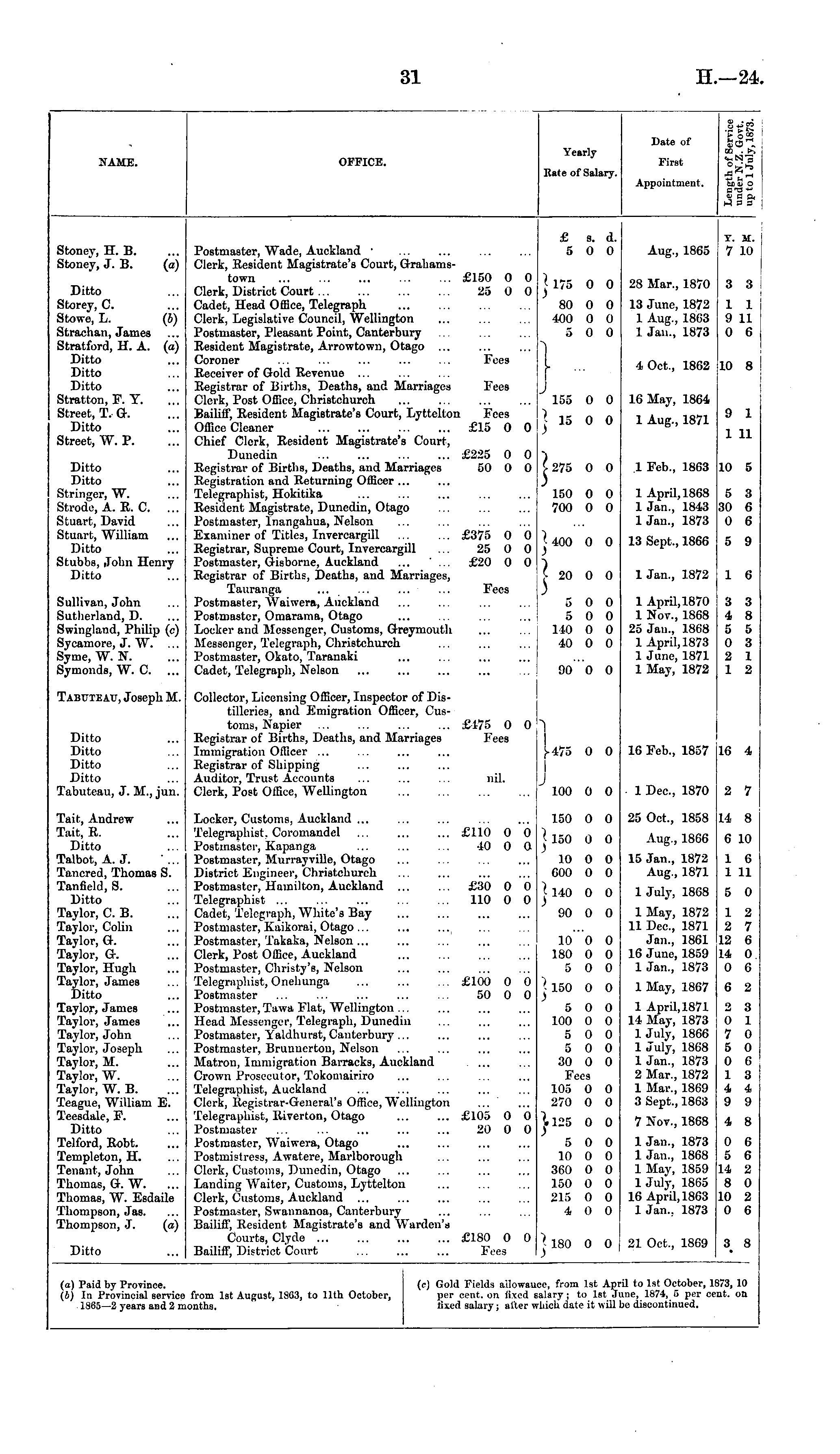NAME. OFFICE. Yearly Date of First •-SI'S SB tJO 01 O fl^fift h-3 3 3 Hate of Salary. Appointment. Stoney, H. B. Stoney, J. B. (a) Postmaster, Wade, Auckland ' Clerk, Resident Magistrate's Court, Grahamstown £150 0 0 Clerk, District Court 25 0 0 Cadet, Head Office, Telegraph Clerk, Legislative Council, Wellington Postmaster, Pleasant Point, Canterbury Resident Magistrate, Arrowtown, Otago ... Coroner ... ... ... ... ... Fees Receiver of Gold Revenue ... Registrar of Births, Deaths, and Marriages Fees Clerk, Post Office, Christchurch Bailiff, Resident Magistrate's Court, Lyttelton Fees Office Cleaner £15 0 0 Chief Clerk, Resident Magistrate's Court, Dunedin £225 0 0 Registrar of Births, Deaths, and Marriages 50 0 0 Registration and Returning Officer ... Telegraphist, Hokitika Resident Magistrate, Dunedin, Otago Postmaster, Inangahua, Nelson Examiner of Titles, Invercargill £375 0 0 Registrar, Supreme Court, Invercargill ... 25 0 0 Postmaster, Gisborne, Auckland ... ' ... £20 0 0 Registrar of Births, Deaths, and Marriages, Tauranga ... ... ... ... Fees Postmaster, Waiwera, Auckland Postmaster, Omarama, Otago Locker and Messenger, Customs, Greymouth Messenger, Telegraph, Christchurch Postmaster, Okato, Taranaki Cadet, Telegraph, Nelson £ s. d. 5 0 0 Aug., 1865 T. II. 7 10 Ditto Storey, C. Stowe, L. (b) Strachan, James Stratford, H. A. (a) Ditto Ditto Ditto Stratton, F. Y. Street, T.G. Ditto Street, W. P. | 175 0 0 28 Mar., 1870 3 3 80 0 0 400 0 0 5 0 0 13 June, 1872 1 Aug., 1863 1 Jan., 1873 1 1 9 11 0 6 } 4 Oct., 1862 10 8 155 0 0 16 May, 1864 9 1 | 15 0 0 1 Aug., 1871 1 11 Ditto Ditto Stringer, W. Strode, A. R. C. ... Stuart, David Stuart, William Ditto Stubbs, John Henry Ditto 1 275 0 0 .1 Feb., 1863 10 5 150 0 0 700 0 0 1 April, 1868 1 Jan., 1843 1 Jan., 1873 5 3 30 6 0 6 1 400 0 0 I 20 0 0 13 Sept., 1866 Uan., 1872 5 9 1 6 Sullivan, John Sutherland, D. Swingland, Philip (c) Sycamore, J. W. ... Syme, W. N. Symonds, W. C. ... 5 0 0 5 0 0 i 140 0 0 40 0 0 1 April, 18 70 1 Nov., 1868 25 Jan., 1868 1 April, 1873 1 June, 1871 1 May, 1872 3 3 4 8 5 5 0 3 2 1 1 2 90 0 0 Tabuteau, Joseph M. Ditto Ditto Ditto Ditto Tabuteau, J. M., jun. Collector, Licensing Officer, Inspector of Distilleries, and Emigration Officer, Customs, Napier ... ... ... ... £475 0 0 Registrar of Births, Deaths, and Marriages Fees Immigration Officer ... Registrar of Shipping Auditor, Trust Accounts ... ... ... nil. Clerk, Post Office, Wellington 1 J-475 0 0 16 Feb., 1857 16 4 100 0 0 1 Dec, 1870 2 7 Tait, Andrew Tait, R. Ditto Talbot, A. J. Tanered, Thomas S. Tanfield, S. Ditto Taylor, C. B. Taylor, Colin Taylor, 6. Taylor, G. Taylor, Hugh Taylor, James Ditto Taylor, James Taylor, James Taylor, John Taylor, Joseph Taylor, M. Taylor, W. Taylor, W. B. Teague, William E. Tcesdale, F. Ditto Telford, Robt. Templeton, H. Tenant, John Thomas, G. W. Thomas, W. Esdaile Thompson, Jas. Thompson, J. (a) Locker, Customs, Auckland ... Telegraphist, Coromandel £110 0 0 Postmaster, Kapanga ... ... ... 40 0 O Postmaster, Murray ville, Otago District Engineer, Christchureh Postmaster, Hamilton, Auckland £30 0 0 Telegraphist 110 0 0 Cadet, Telegraph, White's Bay Postmaster, Kaikorai, Otago ... Postmaster, Takaka, Nelson ... Clerk, Post Office, Auckland Postmaster, Christy's, Nelson Telegraphist, Onehunga £100 0 0 Postmaster 50 0 0 Postmaster, Tuwa Flat, Wellington ... Head Messenger, Telegraph, Dunedin Postmaster, Yaldhurst, Canterbmy ... Postmaster, Brunnerton, Nelson Matron, Immigration Barracks, Auckland ... Crown Prosecutor, Tokomairiro Telegraphist, Auckland Clerk, Registrar-General's Office, Wellington Telegraphist, Riverton, Otago £105 0 0 Postmaster 20 0 0 Postmaster, Waiwera, Otago Postmistress, Awatere, Marlborough Clerk, Customs, Dunedin, Otago Landing Waiter, Customs, Lyttelton Clerk, Customs, Auckland Postmaster, Swaimanoa, Canterbury Bailiff, Resident Magistrate's and Warden's Courts, Clyde £180 0 0 Bailiff, District Court Fees 150 0 0 25 Oct., 1858 14 8 | 150 0 0 Aug., 1866 6 10 10 0 0 600 0 0 15 Jan., 1872 Aug., 1871 1 July, 1868 1 6 1 11 | 140 0 0 5 0 90 0 0 10 0 0 180 0 0 5 0 0 1 May, 1872 11 Dec, 1871 Jan., 1861 16 June, 1859 1 Jan., 1873 1 2 2 7 12 6 14 O 0 G • 150 0 0 1 May, 1867 6 2 5 0 0 100 0 0 5 0 0 5 0 0 30 0 0 Fees 105 0 0 270 0 0 1 April, 1871 14 May, 1873 1 July, 1866 1 July, 1868 1 Jan., 1873 2 Mar., 1872 1 Mar., 1869 3 Sept., 1863 2 3 0 1 7 0 5 0 0 6 1 3 4 4 9 9 | 125 0 0 7 Nov., 1868 4 8 5 0 0 10 0 0 360 0 0 150 0 0 215 0 0 4 0 0 1 Jan., 1873 1 Jan., 1868 1 May, 1859 1 July, 1865 16 April, 1863 1 Jan.. 1873 0 6 5 6 14 2 8 0 10 2 0 6 Ditto '■ 180 0 0 21 Oct., 1869 3. 8 (a) Paid by Province. (&) In Provincial servict 1S65— 2 years and 2 i from 1st August, 18G3, to 11th October, loutha. (<•) Gold Fields ailowaui per cent, on fixed s iixed salary; alter \v co, from 1st Ap ialary ; to 1st J rhioh date it will ril to 1st October, IE uue, 1874, 5 per ce] be discontinued. i73, 10 at. on