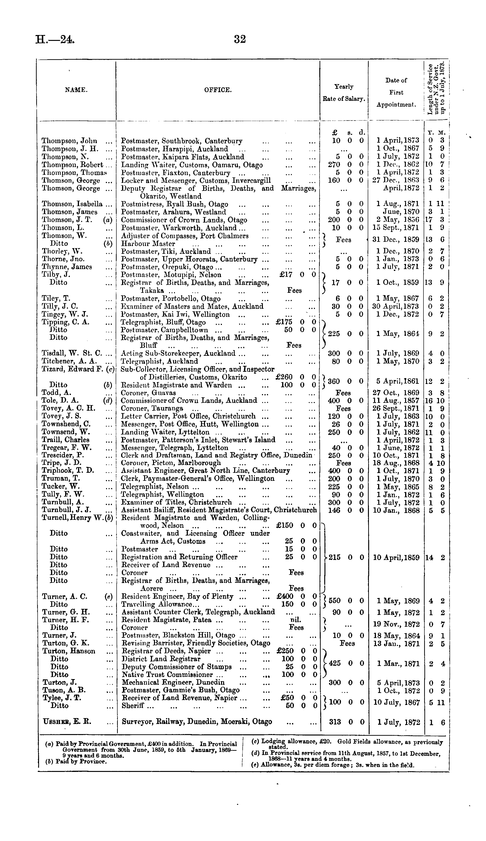 N \ M I OFFICE. Yearly Date of First I * ■•£ SO - en .2? s-N 3 sit l-f 3 S Rate of Salary. Appointment. Thompson, John ... Thompson, .7. II. ... Thompson, US. Thompson, Robert... Thompson, TlionmThomson, George- ... Thomson, George ... Postmaster, Southbrook, Canterbury Postmaster, Harapipi, Auckland Postmaster, Kaipara Flats, Auckland Landing Waiter, Customs, Oamaru, Otago Postmaster, Flaxton, Canterbury ... Locker and Messenger, Customs, Invercargill Deputy Registrar of Births, Deaths, and Marriages, Okarito, Westland Postmistress, Ryall Bush, Otago Postmaster, Arahura, Westland Commissioner of Crown Lands, Otago Postmaster, Warkworth, Auckland... ... ... ... Adjuster of Compasses, Port Chalmers Harbour Master Postmaster, Tiki, Auckland ... Postmaster, Upper Hororata, Canterbury ... Postmaster, Orepuki, Otago ... Postmaster, Motupipi, Nelson ... ... £17 0 0 I rar of Births, Deaths, and Marriages, Takska Fees Postmaster, Portobello, Otago Examiner of Masters and Mates, Auckland Postmaster, Kai Iwi, Wellington ... ... ... "... Telegraphist, Bluff, Otago £175 0 0 Postmaster. Campbelltown 50 0 0 Registrar of Births, Deaths, and Marriages, Bluff Fees Acting Sub-Storekeeper, Auckland Telegraphist, Auckland Sub-Collector, Licensing Officer, and Inspector of Distilleries, Customs, Okarito ... £260 0 0 Resident Magistrate and Warden 100 0 0 Coroner, Guavas Commissioner of Crown Lands, Auckland ... Coroner, Tauranga Letter Carrier, Post Office, Chvistchurch ... Messenger, Post Office, Hutt, Wellington ... Landing Waiter, Lyttelton ... Postmaster, Patterson's Inlet, Stewart's Island Messenger, Telegraph, Lyttelton Clerk and Draftsman, Land and Registry Office, Duncdin Coroner, Picton, Marlborough Assistant Engineer, Great North Line, Canterbury Clerk, Paymaster-General's Office, Wellington Telegraphist, Nelson ... Telegraphist, Wellington Examiner of Titles, Christchureh ... Assistant Bailiff, Resident Magistrate's Court, Christchureh Resident Magistrate and Warden, Collingwood, Nelson £150 0 0 Coastwaiter, and Licensing Officer under Arms Act, Customs ... ... ... 25 0 0 Postmaster 15 0 0 Registration and Returning Officer ... 25 0 0 Receiver of Land Revenue ... Coroner ... ... ... ... ... Fees Registrar of Births, Deaths, and Marriages, Aorere ... ... ... ... ... Fees Resident Engineer, Bay of Plenty £400 0 0 Travelling Allowance 150 0 0 Assistant Counter Clerk, Telegraph, Auckland Resident Magistrate, Patea nil. Coroner ... ... ... ... ... I'Yes Postmaster, Blackston Hill, Otago ... Revising Barrister, Friendly Societies, Otago Registrar of Deeds, Napier £250 0 0 District Land Registrar 100 0 0 Deputy Commissioner of Stamps 25 0 0 Native Trust Commissioner ... ... ... 100 0 0 Mechanical Engineer, Dunedin Postmaster, Gammie's Bush, Otago Receiver of Land Revenue, Napier £50 0 0 Sheriff 50 0 0 £ s. <J. 10 0 0 5 0 0 270 0 0 5 0 0 160 0 0 1 April, 1873 1 Oct., 1867 Uuly, 1872 1 Dec, 1862 1 April,1872 27 Dec, 1863 April, 1872 Y. M. 0 3 5 9 1 0 10 7 1 3 9 6 1 2 Thomson, Isabella ... Thomson, James Thomson, J. T. (a) Thomson, L. Thomson, \\~. Ditto (4) Thorley, W. Thome, Jno. Thynne, James Tilby, J. Ditto 5 0 0 5 0 0 200 0 0 10 0 0 j Fees 1 Aug., 1871 June, 1870 2 May, 1866 15 Sept., 1871 31 Dec, 1859 1 11 3 1 17 3 1 9 13 6 5"o 0 5 0 0 1 Dec, 1870 1 Jan., 1873 1 July, 1871 2 7 0 6 2 0 I 17 0 0 1 Oct., 1859 13 9 Tiley, T. Tilly, J. C. Tingey, W. J. Tipping, C. A. Jntto Ditto 6 0 0 30 0 0 5 0 0 1 May, 18G7 30 April, 1873 1 Dec, 1872 6 2 0 2 0 7 >225 0 0 1 May, 1861 9 2 Tisdall, W. St. C. ... Titchener, A. A. Tizard, Edward F. (c) 300 0 0 80 0 0 1 Julr, 1869 1 May, 1870 4 0 3 2 Ditto (J) Todd, A. Tole, D. A. (rf) Tovey, A. C. II. ... Torey, J. S. Townshend, C. Townsend, W. Traill, Charles Tregear, F. W. Treseider, P. Tripe, J. D. Triphook, T. D. ... Truman, T. Tucker, W. Tully, F. W. Tumbull, A. Turnbull, J. J. Turnell, Henry W.(/<) | 360 0 0 5 April, 1861 12 2 Fees 400 0 0 Fees 120 0 0 26 0 0 250 0 0 40 0 0 250 0 0 Fees 400 0 0 200 0 0 225 0 0 90 0 0 300 0 0 146 0 0 27 Oct., 1869 11 Aug., 1857 26 Sept., 1871 1 July, 1863 1 July, 1871 1 July, 18fi2 1 April, 1872 1 June, 1872 10 Oct., 1871 18 Aug., 1868 1 Oct., 1871 1 July, 1870 1 May, 1865 1 Jan., 1872 1 July, 1872 10 Jan., 1868 3 8 16 10 1 9 10 0 2 0 11 0 1 3 1 1 1 8 4 10 1 9 3 0 8 2 1 6 I 1 0 5 5 Ditto Ditto Ditto Ditto Ditto Ditto 10 April, 1859 14 2 215 0 0 Turner, A. C. (f) Ditto Turner, G. H. Turner, II. F. Ditto Turner, J. Turton, G. K. Tniion, Hanson Ditto Ditto Ditto Turton, J. Tuson, A. B. Tylee, J. T. Ditto 1 May, 1869 4 2 550 0 0 90 0 0 1 May, 1872 1 2 19 Not., 1872 0 7 10 0 0 Fees 18 May, 1864 13 Jan., 1871 9 1 2 5 425 0 0 1 Mar., 1871 2 A 300 0 0 5 April, 1873 1 Oct., 1872 0 2 0 9 100 0 0 10 July, 1867 5 11 Ubsheb, E. E. Surveyor, Railway, Dunedin, Moeraki, Otago 313 0 0 1 July, 1872 1 6 (a) Paid by Provincial Go Government from 9 years and 6 montl (I) Paid by Province. rornment, £100 in addition. In Provincial M Lodging allowance, , JOtll June, 1859, to 5th January, 1869- fc'SSL&J service 8- 1868—11 years ant ; («) Allowance, 3a. per di £20. Gold Fieli > from 11th Augi 1 4 months, iem forage; 3s. 3 allowance, as pre-v it, 1857, to 1st Dcee: 'iously mber, ■lien in the fie'd.