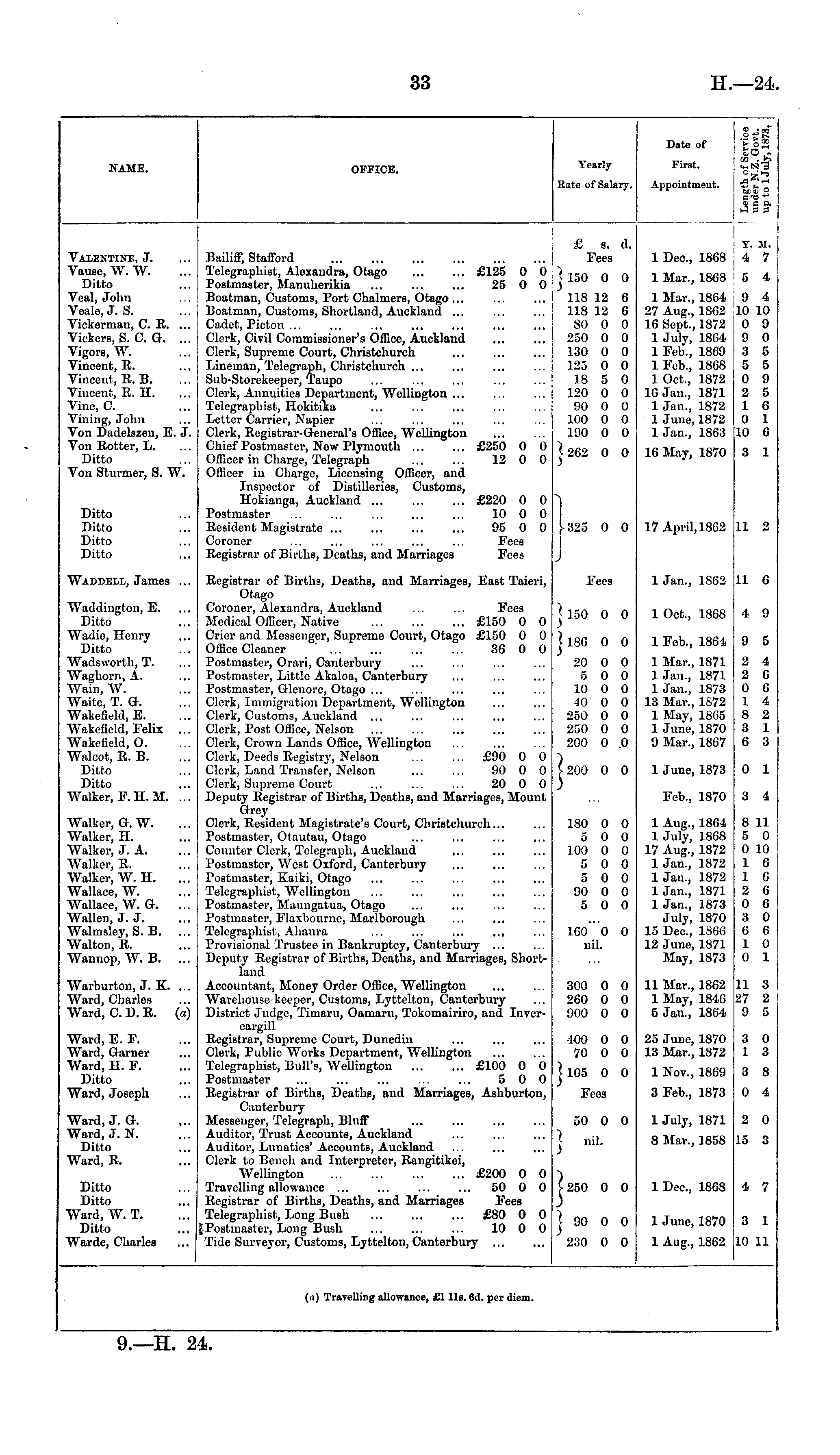 NAME. OFFICE. Yearly Date of First. gjrf is 1"5 ■Su EX 0J ° as? Kate of Salary. Appointmeut. £ s. d. Fees I Y. M. 4 7 Valentine, J. Vausc, W. W. Ditto Veal, John Veale, J. S. Vickorman, C. R. ... Viekers, S. C. G. ... Vigors, W. Vincent, R. Vincent, R. B. Vincent, R. H. Vine, C. Vining, John Von Dadelszen, E. J. Von Rotter, L. Ditto Von Stunner, S. W. Bailiff, Stafford Telegraphist, Alexandra, Otago £125 0 0 Postmaster, Manuherikia 25 0 0 Boatman, Customs, Port Chalmers, Otago... , Boatman, Customs, Shortland, Auckland Cadet, Picton Clerk, Civil Commissioner's Office, Auckland Clerk, Supreme Court, Christchurch Lineman, Telegraph, Christehurch ... Sub-Storekeeper, Taupo Clerk, Annuities Department, Wellington Telegraphist, Hokitika Letter Carrier, Napier Clerk, Registrar-General's Office, Wellington Chief Postmaster, New Plymouth £250 0 0 Officer in Charge, Telegraph 12 0 0 Officer in Charge, Licensing Officer, and Inspector of Distilleries, Customs, Hokianga, Auckland £220 0 0 Postmaster 10 0 0 Resident Magistrate 95 0 0 Coroner ... ... ... ... ... Fees Registrar of Births, Deaths, and Marriages Fees | 150 0 0 ! 118 12 6 118 12 6 80 0 0 250 0 0 130 0 0 125 0 0 18 5 0 120 0 0 90 0 0 100 0 0 190 0 0 1 Dec., 1868 1 Mar., 1868 1 Mar., 18G4 27 Aug., 1862 16 Sept., 1872 1 July, 18G4 1 Feb., 1869 1 Feb., 1868 1 Oct., 1872 1G Jan., 1871 1 Jan., 1872 1 June, 1872 1 Jan., 1863 5 4 9 4 10 10 I 0 0 ! 9 0 I 3 5 5 5 0 9 2 5 1 6 0 1 10 6 1 262 0 0 16 May, 1870 3 1 Ditto Ditto Ditto Ditto {•325 0 0 J 17 April, 1862 11 2 Waddeli, James ... Registrar of Births, Deaths, and Marriages, East Taieri, Otago Coroner, Alexandra, Auckland ... ... Fees Medical Officer, Native £150 0 0 Crier and Messenger, Supreme Court, Otago £150 0 0 Office Cleaner 36 0 0 Postmaster, Orari, Canterbury Postmaster, Little Akaloa, Canterbury Postmaster, Glenore, Otago ... Clerk, Immigration Department, Wellington Clerk, Customs, Auckland ... Clerk, Post Office, Nelson Clerk, Crown Lands Office, Wellington Clerk, Deeds Registry, Nelson £90 0 0 Clerk, Land Transfer, Nelson 90 0 0 Clerk, Supreme Court 20 0 0 Deputy Registrar of Births, Deaths, and Marriages, Mount Grey Clerk, Resident Magistrate's Court, Christehurch... Postmaster, Olautau, Otago Counter Clerk, Telegraph, Auckland ... Postmaster, West Oxford, Canterbury Postmaster, Kaiki, Otago Telegraphist, Wellington Postmaster, Maungatua, Otago Postmaster, Flaxbourne, Marlborough Telegraphist, Ahaura ... ... ... ... Provisional Trustee in Bankruptcy, Canterbury ... Deputy Registrar of Births, Deaths, and Marriages, Shortland Accountant, Money Order Office, Wellington Warehouse keeper, Customs, Lyttelton, Canterbury District Judge, Timaru, Oamaru, Tokomairiro, and Invercargill Registrar, Supreme Court, Dunedin Clerk, Public Works Department, Wellington Telegraphist, Bull's, Wellington £100 0 0 Postmaster ... ... ... ... ... 5 00 Registrar of Births, Deaths, and Marriages, Ashburton, Canterbury Messenger, Telegraph, Bluff Auditor, Trust Accounts, Auckland Auditor, Lunatics'Accounts, Auckland Clerk to Bench and Interpreter, Rangitikei, Wellington £200 0 0 Travelling allowance ... ... ... ... 50 0 0 Registrar of Births, Deaths, and Marriages Fees Telegraphist, Long Bush £80 0 0 I Postmaster, Long Bush 10 0 0 Tide Surveyor, Customs, Lyttelton, Canterbury Fees 1 Jan., 1862 U G Waddington, E. Ditto Wadie, Henry Ditto Wadsworth, T. Waghorn, A. Wain, W. Waile. T. G. WakefUd, E. Wakefield, Felix ... Wakefield.O. Waleot, R, B. Ditto Ditto Walker, F. H. M. ... < 150 0 0 ] 18G 0 0 1 Oct., 1868 4 9 1 Feb., 1861. 9 5 20 0 0 5 0 0 10 0 0 40 0 0 250 0 0 250 0 0 200 0 0 1 Mar., 1871 1 Jan., 1871 1 Jan., 1873 13 Mar., 1S72 1 May, 18G5 1 June, 1870 9 Mar., 1867 2 4 2 6 0 G 1 4 8 2 3 1 6 3 V 200 0 0 1 June, 1873 0 1 Feb., 1870 3 4 Walker, G.W. Walker, II. Walker, J. A. Walker, R. Walker, W. H. ... Wallace, W. Wallace, W. G. ... Wallen, J. J. Walmsley, S. B. ... Walton, R. Wannop, W. B. ... 180 0 0 5 0 0 100 0 0 5 0 0 5 0 0 90 0 0 5 0 0 1 Aug., 1861 1 July, 1868 17 Aug., 1872 1 Jan., 1872 1 Jan., 1872 Uan., 1871 1 Jan., 1873 July, 1870 15 Dee., 1866 12 Juno, 1871 May, 1873 8 11 5 0 0 10 1 6 1 G 2 6 0 6 3 0 G 6 1 0 0 1 160 "o 0 nil. Warburton, J. K. ... Ward, Charles Ward, C. D. R. (a) 300 0 0 260 0 0 900 0 0 11 Alar., 1862 1 May, 1846 5 Jan., 1864 11 3 27 2 9 5 Ward, E. F. AVard, Garner Ward, H. F. Ditto Ward, Joseph 400 0 0 70 0 0 25 June, 1870 13 Mar., 1872 3 0 1 3 1 105 0 0 1 Nov., 1869 3 8 Fees 3 Feb., 1873 0 4 Ward, J. a. Ward, J. N. Ditto Ward, R, 50 0 0 Uuly, 1871 2 0 J nil. 8 Mar., 1858 15 3 Ditto Ditto Ward, W. T. Ditto Warde, Charles >250 0 0 | 90 0 0 1 Dec., 1868 4 7 1 June, 1870 3 1 230 0 0 1 Aug., 1862 10 11 (d) Travelling allowance, £111s. 6d. per diem. 9.—H. 24.