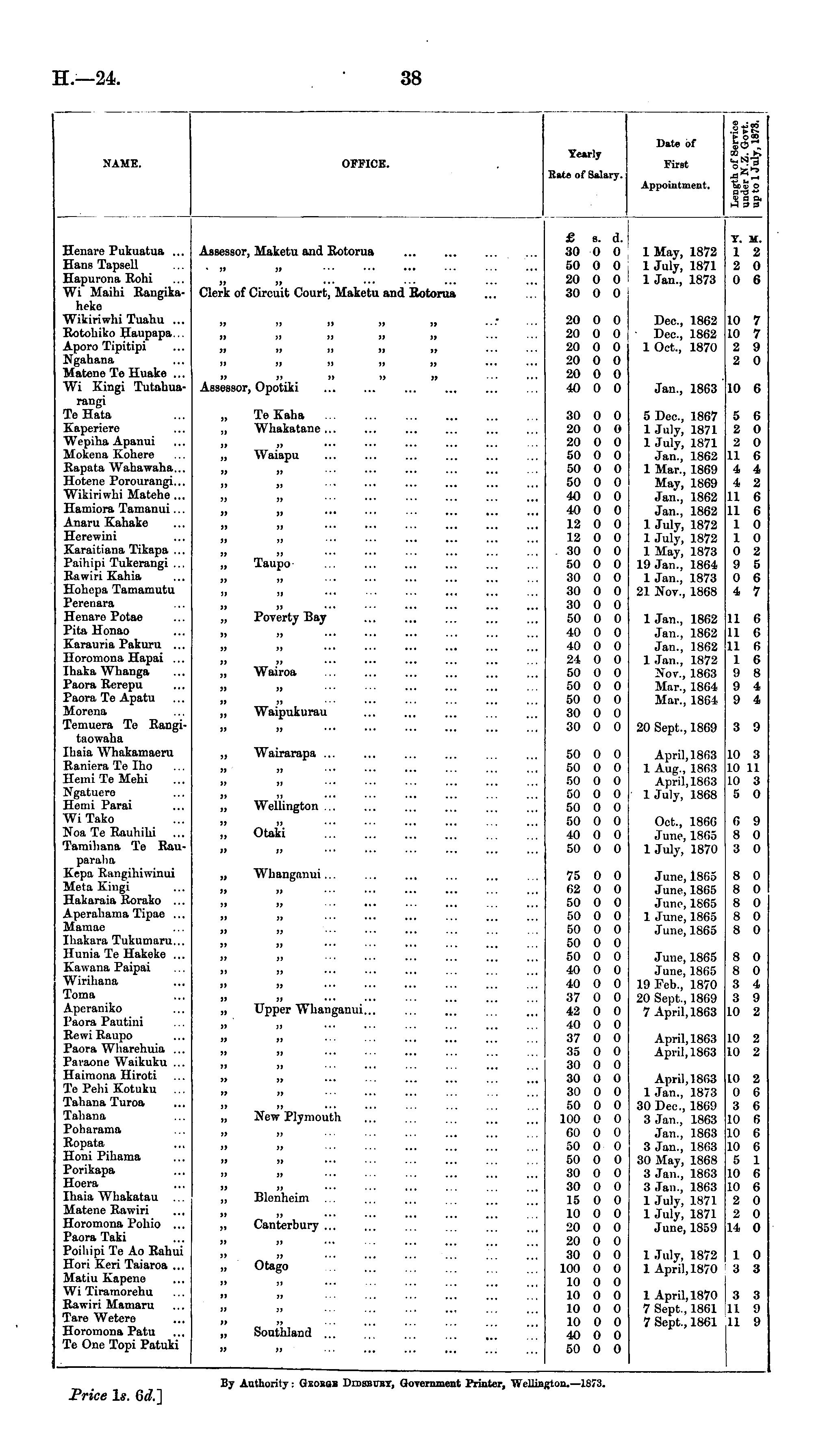 NAME. OFFICE. Yearly Date of First '> o °° So1*2 US o Rate of Salary. Appointment. Henare Pukuatua ... Hans Tapsell Hapurona Rohi Wi Maibi Rangikaheke Wikiriwlii Tuahu ... Eotohiko Haupapa .. Aporo Tipitipi \ : ■: i 1 1:; : Matene Te Huake ... Wi Kingi Tutahuarangi Te Hata Kaperiere Wepilia Apanui Mokena Koliere Rapata Wahawaha... Hotene Porourangi... Wikiriwhi Matehe ... Hamiora Tamanui... Anaru Kahake Herewini Karaitiana Tikapa ... Paihipi Tukerangi ... Rawiri Kahia Hokepa '.I'miiiiiiniil u Perenara Henaro Potae Pita Honao Karauria Pakuru ... lloromona Hapai ... Ihaka Whanga Paora Rerepu Paora Te Apatu Morena Temuera To Rangitaowalia Iliaia Whakamaoru Raniera Te Iho HemiTeMehi Ngatuere Hemi Parai Wi Tako Noa Te Rauhilii Tamihana Te Raupavalia Kepa Rangihiwinui Meta Kingi Hakaraia Rorako ... Aperaliama Tipae ... Maume Ihakava Tukumaru... Hunia Te llakeke ... Kawana Paipai Wirihana Toma Aperaniko Paora Pautini RewiRaupo Paora Wharehuia ... Paraone Waikuku ... Haimona Hiroti Te Pehi Kotuku . . Tahana Turoa Tahaiia Poharama Ropata Honi Pihama Porikapa Hoera Iliaia Wliakatau Matene Rawiri Horomona Pohio ... Paora Taki Poilnpi Te Ao Rahui Hori Keri Taiaroa ... Matiu Kapene Wi Tiramorehu Rawiri Maruaru Tare Wetere Horomona Patu Te One Topi Patuki Assessor, Maketu and Rotorua ... £ 8. d. 30 0 0 50 0 0 20 0 0 30 0 0 1 May, 1872 Uuly, 1871 1 Jan., 1873 Y. M. 1 2 2 0 0 6 j| ,j ... ... *.. )J ,1 ... ... ... ... Clerk of Circuit Court, Maketu and Rotorua tt » j» » j» j» ») jj » »» 20 0 0 20 0 0 20 0 0 20 0 0 20 0 0 40 0 0 Dec, 1862 Dec, 1862 1 Oct., 1870 10 7 10 7 2 9 2 0 » jj »» j> »» JJ JJ J) JJ JJ JJ JJ )J IJ JJ Assessor, Opotiki Jan., 1863 10 6 „ Te Kaha „ Whakatane... ,, ,, ••• ... ... „ Waiapu »» n ■• ' • •* ••• n jj ■ ■• ..• ... ... jj jj -■■ ••• . •■■ ... 30 0 0 20 0 0 20 0 0 SO 0 0 50 0 0 50 0 0 40 0 0 40 0 0 12 0 0 12 0 0 30 0 0 50 0 0 30 0 0 30 0 0 30 0 0 50 0 0 40 0 0 40 0 0 24 0 0 50 0 0 50 0 0 50 0 0 30 0 0 30 0 0 5 Dec, 1867 1 July, 1871 1 July, 1871 Jan., 1862 1 Mar., 1869 May, 1869 Jan., 1862 Jan., 1862 1 July, 1872 1 July, 1872 1 May, 1873 19 Jan., 1864 1 Jan., 1873 21 IJov., 1868 5 6 2 0 2 0 11 6 4 4 4 2 11 6 11 6 1 0 1 0 0 2 9 5 0 6 4 1 jj jj •.. u u jj jj ... ... ... ... „ Taupo jj )j jj jj ••• ■■■ •• ■ „ Poverty Bay 1 Jan., 1862 Jan., 1862 Jan., 1862 1 Jan., 1872 Nov., 1863 Mar., 1864 Mar., 1861 11 0 11 6 11 6 1 6 9 8 9 4 9 4 jj jj • •• ... ... j» >» ••• ... ... ... jj j» ... ... ... „ Wairoa 31 }} ■ • ■ - ■ • ... jj )> ,, Waipukurau jj jj ■•« ••• ... ... 20 Sept., 1869 3 9 „ Wairarapa 50 0 0 50 0 0 50 0 0 50 0 0 50 0 0 50 0 0 « 0 0 50 0 0 April, 18fi3 1 Aug., 1863 April, 1803 1 July, 1868 10 3 10 11 10 3 5 0 jj jj ■.. ... ... jj jj jj jj ... ... ... „ Wellington jj jj ■•• •■■ ... „ Otaki Oct., 186G June, 1865 1 July, 1870 6 9 8 0 3 0 JJ |J „ "Whangamri 75 0 0 62 0 0 50 0 0 50 0 0 50 0 0 50 0 0 50 0 0 40 0 0 40 0 0 37 0 0 42 0 0 40 0 0 37 0 0 35 0 0 30 0 0 30 0 0 30 0 0 50 0 0 100 0 0 60 0 0 50 0 0 50 0 0 30 0 0 30 0 0 15 0 0 10 0 0 20 0 0 20 0 0 30 0 0 100 0 0 10 0 0 10 0 0 10 0 0 10 0 0 40 0 0 50 0 0 June, 1865 June, 1865 Juno, 1865 1 June, 1865 June, 1865 8 0 8 0 8 0 8 0 8 0 jj jj )j jj - ■. ■•. ... ... j> jj ■ ■ • ... ... j) jj '■ • • ... ... jj u ••. ... ... June, 1865 June, 1865 19 Feb., 1870 20 Sept., I860 7 April, 1863 8 0 8 0 3 4 3 9 10 2 JJ M JJ || •• • •• • ... jj jj . •• )J jj •>• „ Upper Whanganui... jj jj ••• ... April, 1863 April, 1863 10 2 10 2 jj jj •■ ■ ... ... » jj ... -■■ ... ?j u • ■ ■ ... April, 1863 1 Jan., 1873 30 Dec, 1869 3 Jan., 1863 Jan., 1863 3 Jan., 1863 30 May, 1868 3 Jan., 1863 3 Jan., 1863 1 July, 1871 1 July, 1871 June, 1859 10 2 0 6 3 6 10 6 10 6 10 6 5 1 10 6 10 6 2 0 2 0 14 0 jj n ••• jj jj jj jj „ New Plymouth jj jj a jj • ■ • ... ... ... )t jj jj j> 3) N • '• ■ ■ • ... ,, Blenheim 9) JJ ••■ „ Canterbury ... 3) JJ 1 July, 1872 1 April, 1870 1 0 3 3 jj Otago >> jj 1 April, 1870 7 Sept., 1861 7 Sept., 1861 3 3 11 9 11 9 jj jj ... ... ... .., » 'j „ Southland it jj Price Is. Gd.~] By Authority: 0ioege Didsbuet, Government Printer, Wellington.—1873.