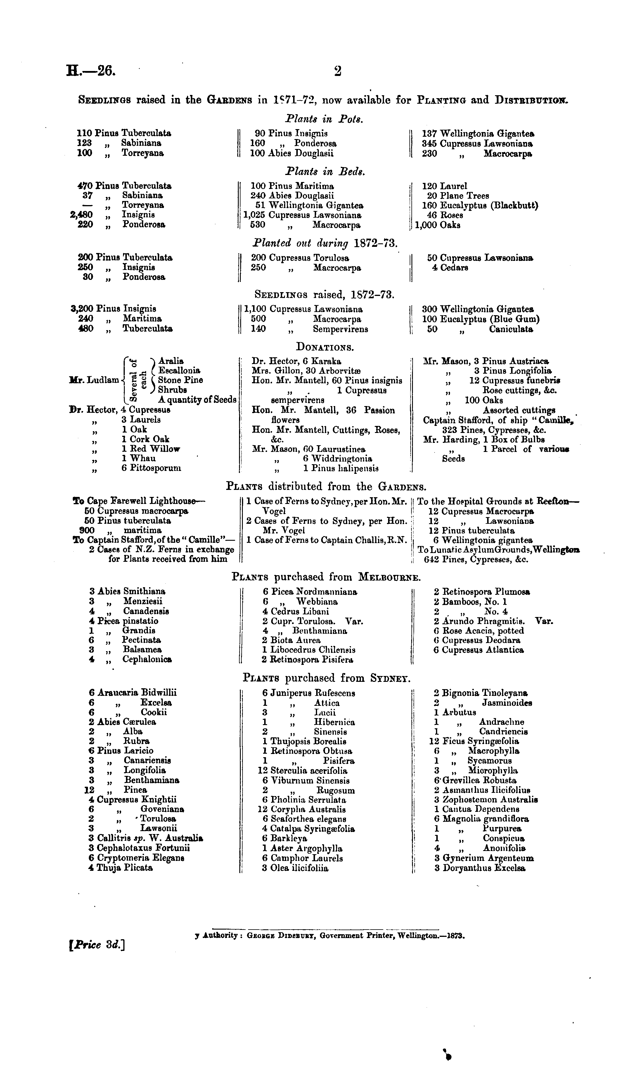 Seedlings raised in the Garde On in 1?71-72, now available for or Planting and Distribution. 110 Pinus Tubereulata 123 ,, Sabiniana 100 „ Torreyana Plants in Pots. 137 Wellingtonia Gigantea 345 Cupressus Lawsoniana 230 „ Macroearpa 90 Pinus Insignis 160 „ Ponderosa 100 Abies Douglasii 470 Pinus Tubereulata 37 „ Sabiniana — „ Torreyana 2,480 „ Insignia 220 „ Ponderosa Plants in Beds. 100 Pinus Maritima 240 Abies Douglasii 51 Wellingtonia Gigantea 11,025 Cupressus Lawsoniana | 530 „ Macroearpa 120 Laurel 20 Plane Trees 160 Eucalyptus (Blackbutt) 46 Roses 1,000 Oaks 200 Pinus Tubereulata 250 ,, Insignis 30 „ Ponderosa Planted out during 1872-73. 50 Cupressus Lawsoniana 4 Cedars 200 Cupressus Torulosa 250 ,, Macroearpa I I 3,200 Pinus Insignis 240 „ Maritima 480 „ Tubereulata Seedlinos raised, 1872-73. 1,100 Cupressus Lawsoniana 500 „ Macroearpa 140 „ Sempervirens 300 Wellingtonia Gigantea 100 Eucalyptus (Blue Gum) 50 „ Caniculata '*o Aralia „ j- ' Eecallouia Mr. Ludlam •{ £ jj I Stone Pine g * ) Shrubs oo A quantity of Seeds Dr. Hector, 4 Cupressus „ 3 Laurels 1 Oak 1 Cork Oak „ 1 Red Willow 1 Whau „ 0 Pittosporum Donations. Mr. Mason, 3 Pinus Austriaca ,, 3 Pinus Longifolia „ 12 Cupressus funebris „ Rose cuttings, &c. „ 100 Oaks „ Assorted cuttings Captain Stafford, of Bhip " Camille, 323 Pines, Cypresses, &c. Mr. Harding, 1 Box of Bulbs „ 1 Parcel of various Seeds Dr. Hector, 6 Karaka Mrs. Gillon, 30 Arborvitrc Hon. Mr. Mantell, 60 Pinus insignis „ . 1 Cupressus sempervirens Hon. Mr. Mantell, 36 Passion flowers Hon. Mr. Mantell, Cuttings, Roses, &c. Mr. Mason, 60 Laurustinea ,, 6 Widdringtonia ,, 1 Pinus halipcnsis Pl ,ants distributed from the Garde: era. To Cape Farewell Lighthouse— 50 Cupressus macroearpa 50 Pinus tubereulata 900 ,, maritima To Captain Stafford,of the " Camille"— 2 Cases of N.Z. Ferns in exchange for Plants received from him 1 Case of Ferns to Sydney, per Hon. Mr. Vogel 2 Cases of Ferns to Sydney, per Hon. Mr. Yogel 1 CaBe of Ferns to Captain Challis, R.N. ! ii To the Hospital Grounds at Reeflon— 12 Cupressus Macroearpa 12 ,, Lawsoniana 12 Pinus tubereulata 6 Wellingtonia gigantea ! ToLuiraticAsylumGround9,Wcllingtoi» ! 642 Pines, Cypresses, &c. I il P: 'lants purchased from Melbourn: 6 Picca Nordmanniana 6 ,, Webbiana 4 Cedrus Libani 2 Cupr. Torulosa. Var. 4 ,, Benthamiana 2 Biota Aurea 1 Liboeedrus Chilensis 2 Retinospora Pisifera E. 3 Abies Smithiana 3 „ Menziesii 4 „ Canadensis 4 Pkca pinstatio 1 ,, Grandis 6 ,, Pectinata 3 ,, Baleamea 4 „ Cephalonica 2 Retinospora Plumosa 2 Bamboos, No. 1 2 „ No. 4 2 Arundo Phragmitis. Var. 6 Rose Acacia, potted 6 Cupressus Deodara 6 Cupressus Atlantica 6 Araucaria Bidwillii 6 „ Excelsa 6 ,, Cookii 2 Abies Crjcrulea 2 „ Alba 2 „ Rubra 6 Pinus Laricio 3 „ Canariensis 3 „ Longifolia 3 „ Benthamiana 12 „ Pinea 4 Cupressus Knightii 6 „ Goveniana 2 „ Torulosa 3 „ Lawsonii 3 Callitris sp. W. Australia 3 Cephalotaxus Fortunii 6 Cryptomeria Elegane 4 Thuja Plicata Plants purchased from Sydney. 6 Junipcrus Rufescens 1 „ Attica 3 „ Lucii 1 ,, Hibernica 2 „ Sinensis 1 Thujopsis Borealis 1 Retinospora Obtccsa 1 „ Pisifera 12 Sterculia acerifolia 6 Viburnum Sinensis 2 „ Rugosum 8 Pholinia Serrulata 12 Corypha Australis 6 Seaforthea elegans 4 Catalpa Syringaefolia 6 Barkleya 1 Aster Argophylla 6 Camphor Laurels 3 Olea ilicifoliia i 2 Bignonia Tinolcyana 2 „ Jasminoides 1 Arbutus 1 ,, Andrachne 1 „ Candriencis 12 Ficus Syringsefolia 6 ,, Macrophylla 1 „ Sycamorus 3 „ Microphylla 6'Grevillea Robusta 2 Asmanthus llicifolius 3 Zophostemon Australis 1 Cantua Dependens 6 Magnolia grandi flora 1 ,, Purpurea 1 ,, Conspieua 4 „ Anonifolia 3 Gynerium Argenteum 3 Doryanthus Excelsa Price 3d.] y Authority : Geobge Didebuky, Government Printer, Wellington.—1873.
