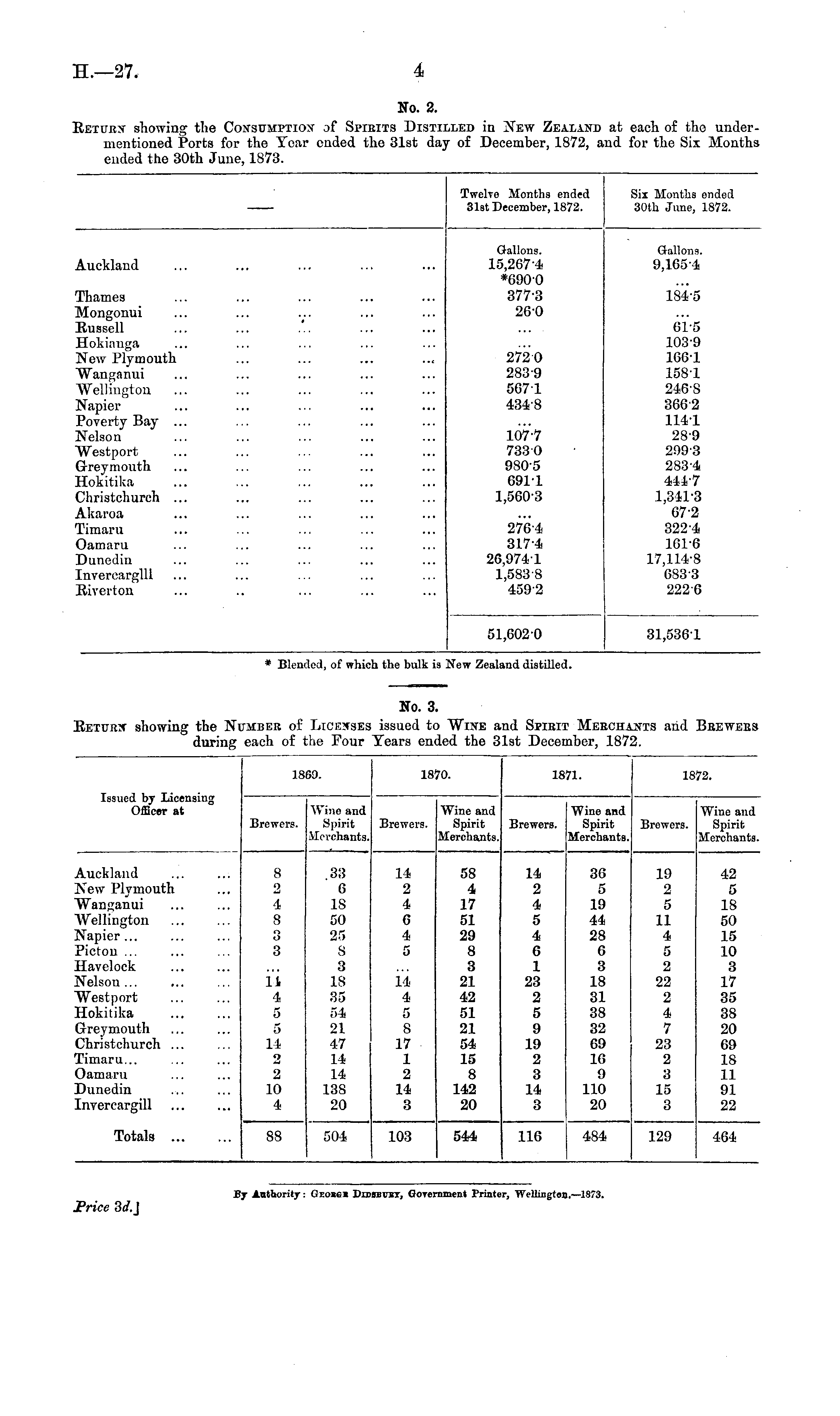 No. 2. RETURN showing the CONSUMPTION of SPIRITS DISTILLED in NEW ZEALAND at each of the undermentioned Ports for the Year ended the 31st day of December, 1872, and for the Six Months ended the 30th June, 1873.