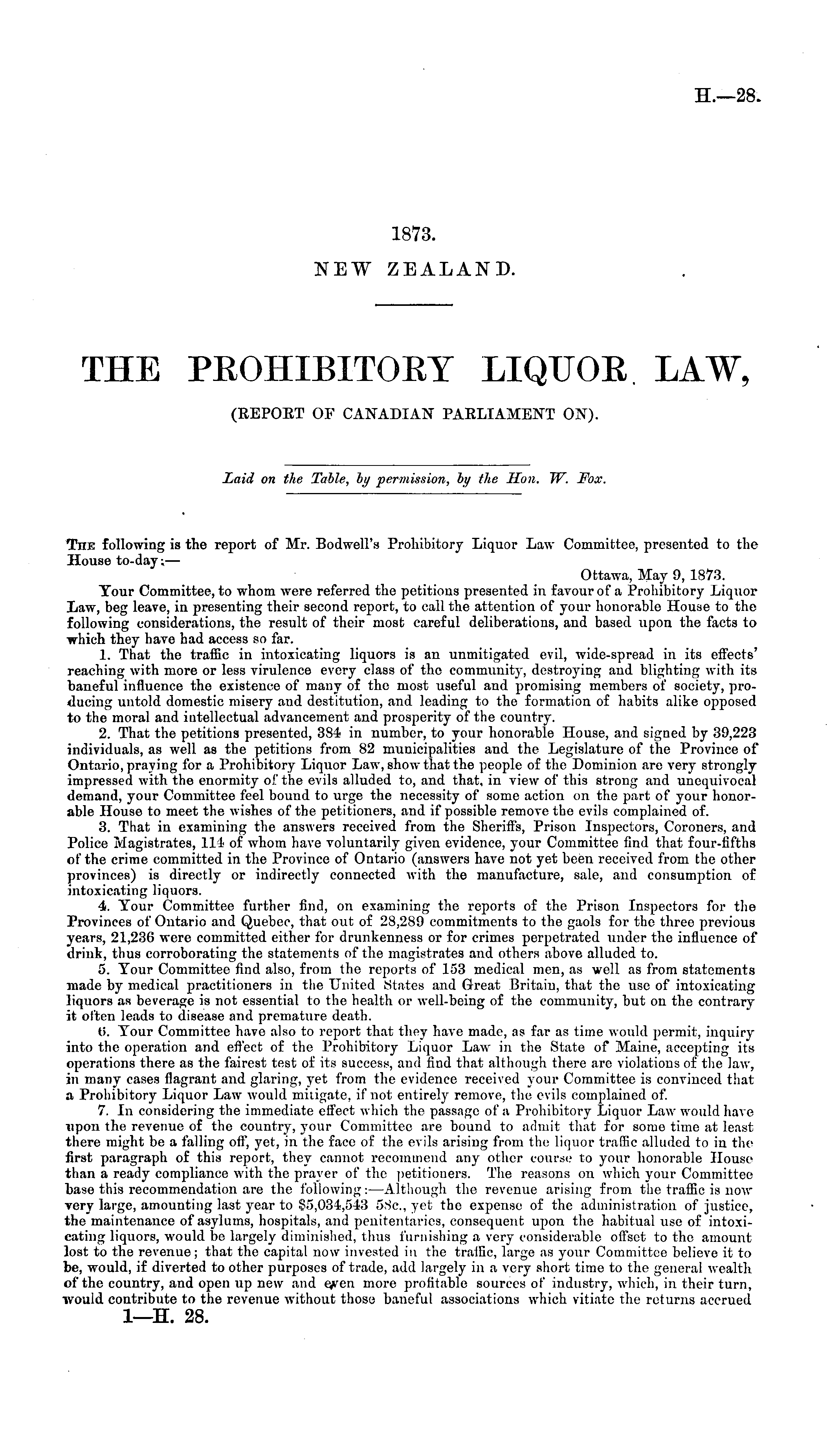Laid on the Table, by permission, by the Son. TV. Fox. • TnE following is the report of Mr. Bodwell's Prohibitory Liquor Law Committee, presented to the House to-day; — Ottawa, May 9, 1873. Your Committee, to whom were referred the petitions presented in favour of a Prohibitory Liquor Law, beg leave, in presenting their second report, to call the attention of your honorable House to the following considerations, the result of their most careful deliberations, and based upon the facts to which they have had access so far. 1. That the traffic in intoxicating liquors is an unmitigated evil, wide-spread in its effects' reaching with more or less virulence every class of the community, destroying and blighting with its baneful influence the existence of many of the most useful and promising members of society, producing untold domestic misery and destitution, and leading to the formation of habits alike opposed to the moral and intellectual advancement and prosperity of the country. 2. That the petitions presented, 384 in number, to your honorable House, and signed by 39,223 individuals, as well as the petitions from 82 municipalities and the Legislature of the Province of Ontario, praying for a Prohibitory Liquor Law, show that the people of the Dominion are very strongly impressed with the enormity of the evils alluded to, and that, in view of this strong and unequivocal demand, your Committee feel bound to urge the necessity of some action on the part of your honorable House to meet the wishes of the petitioners, and if possible remove the evils complained of. 3. That in examining the answers received from the Sheriffs, Prison Inspectors, Coroners, and Police Magistrates, 114 of whom have voluntarily given evidence, your Committee find that four-fifths of the crime committed in the Province of Ontario (answers have not yet been received from the other provinces) is directly or indirectly connected with the manufacture, sale, and consumption of intoxicating liquors. 4. Your Committee further find, on examining the reports of the Prison Inspectors for the Provinces of Ontario and Quebec, that out of 28,289 commitments to the gaols for the three previous years, 21,236 were committed either for drunkenness or for crimes perpetrated under the influence of drink, thus corroborating the statements of the magistrates and others above alluded to. 5. Your Committee find also, from the reports of 153 medical men, as well as from statements made by medical practitioners in the United States and Great Britain, that the use of intoxicating liquors as beverage is not essential to the health or well-being of the community, but on the contrary it often leads to disease and premature death. 0. Your Committee have also to report that they have made, as far as time would permit, inquiry into the operation and effect of the Prohibitory Liquor Law in the State of Maine, accepting its operations there as the fairest test of its success, and find that although there arc violations of the law, in many cases flagrant and glaring, yet from the evidence received your Committee is convinced that a Prohibitory Liquor Law would mitigate, if not entirely remove, the evils complained of. 7. In considering the immediate effect which the passage of a Prohibitory Liquor Law would have upon the revenue of the country, your Committee are bound to admit that for some time at least there might be a falling oft", yet, in the face of the evils arising from the liquor traffic alluded to in the first paragraph of this report, they cannot recommend any other course to your honorable House than a ready compliance with the prayer of the petitiouers. The reasons on which your Committee base this recommendation are the following:—Although the revenue arising from the traffic is now very large, amounting last year to §5,034,543 58c, yet the expense of the administration of justice, the maintenance of asylums, hospitals, and penitentaries, consequent upon the habitual use of intoxicating liquors, would be largely diminished, thus furnishing a very considerable offset to the amount lost to the revenue; that the capital now invested in the traffic, largo as your Committee believe it to be, would, if diverted to other purposes of trade, add largely in a very short time to the general wealth of the country, and open up new and eyven more profitable sources of industry, which, in their turn, would contribute to the revenue without those baneful associations which vitiate the returns accrued I—H. 28.