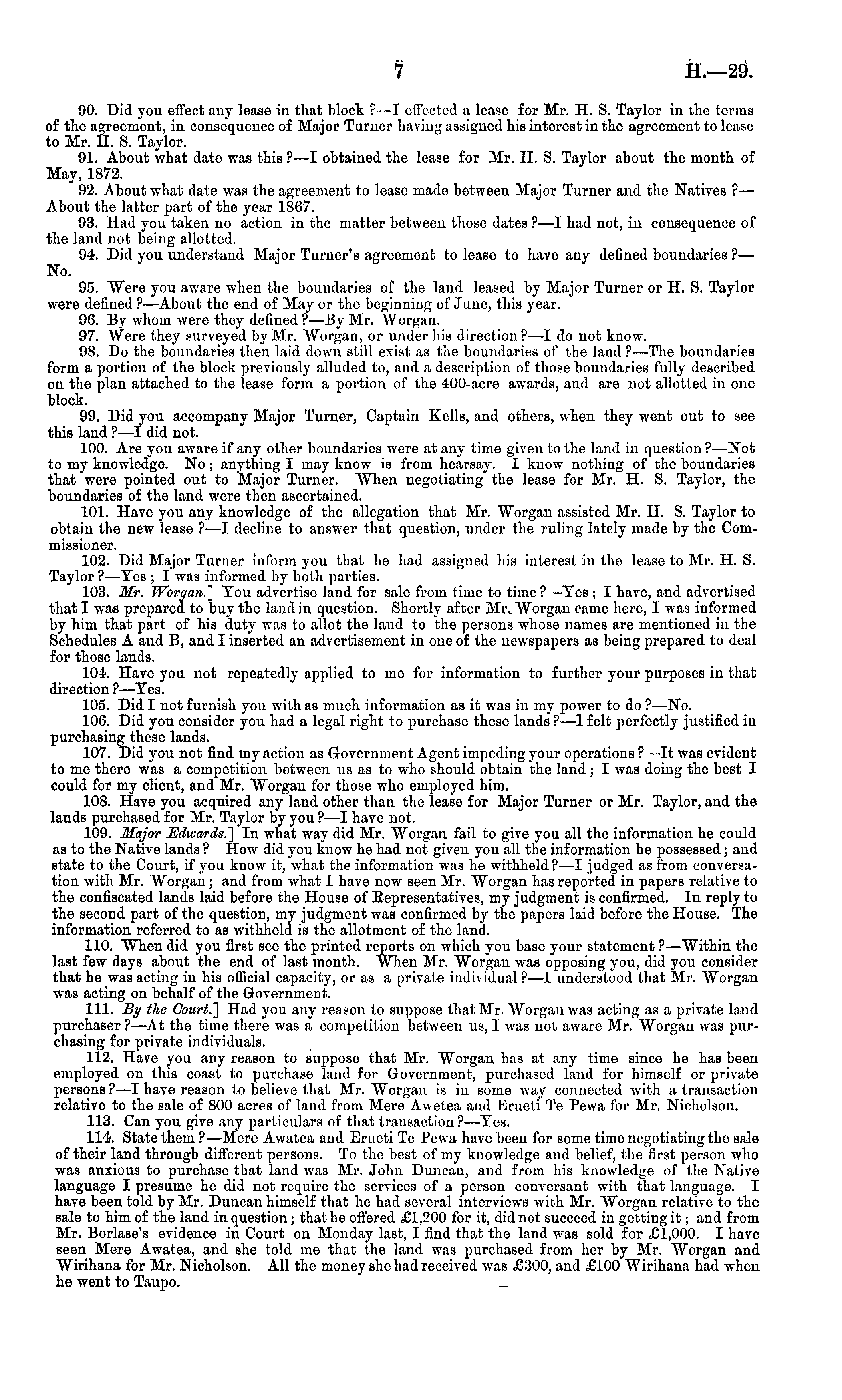 90. Did you effect any lease in that block ?—I effected a lease for Mr. H. S. Taylor in the terms of the agreement, in consequence of Major Turner having assigned his interest in the agreement to lease to Mr. H. S. Taylor. 91. About what date was this ? —I obtained the lease for Mr. H. S. Taylor about the month of May, 1872. 92. About what date was the agreement to lease made between Major Turner and the Natives ?— About the latter part of the year 1867. 93. Had you taken no action in the matter between those dates ? —I had not, in consequence of the land not being allotted. 94. Did you understand Major Turner's agreement to lease to have any defined boundaries ? — No. 95. Were you aware when the boundaries of the land leased by Major Turner or H. S. Taylor were defined ?—About the end of May or the beginning of June, this year. 96. By whom were they defined ? —By Mr. AVorgan. 97. Were they surveyed by Mr. AVorgan, or under his direction ?—I do not know. 98. Do the boundaries then laid down still exist as the boundaries of the land ?—The boundaries form a portion of the block previously alluded to, and a description of those boundaries fully described on the plan attached to the lease form a portion of the 400-acre awards, and are not allotted in one block. 99. Did you accompany Major Turner, Captain Kells, and others, when they went out to see this laud ? —I did not. 100. Are you aware if any other boundaries were at any time given to the land in question ? —Not to my knowledge. No ; anything I may know is from hearsay. I know nothing of the boundaries that were pointed out to Major Turner. AVhen negotiating the lease for Mr. 11. S. Taylor, the boundaries of the land were then ascertained. 101. Have you any knowledge of the allegation that Mr. Worgan assisted Mr. H. S. Taylor to obtain the new lease ? —I decline to answer that question, under the ruling lately made by the Commissioner. 102. Did Major Turner inform you that he had assigned his interest in the lease to Mr. IT. S. Taylor ? —Yes ; I was informed by both parties. 103. Mr. Worgan] You advertise land for sale from time to time? —Yes ; I have, and advertised that I was prepared to buy the land in question. Shortly after Mr. Worgan came here, I was informed by him that part of his duty was to allot the land to the persons whose names are mentioned in the Schedules A aud B, and I inserted an advertisement in one of the newspapers as being prepared to deal for those lands. 101. Have you not repeatedly applied to me for information to further your purposes in that direction ? —-Yes. 105. Did I not furnish you with as much information as it was in my power to do ?—No. 100. Did you consider you had a legal right to purchase these lands ? —1 felt perfectly justified iv purchasing these lands. 107. Did you not find my action as Government Agent impeding your operations ?—lt was evident to me there was a competition between us as to who should obtain the land; I was doing the best I could for my client, and Mr. AVorgan for those who employed him. 108. Have you acquired any land other than the lease for Major Turner or Mr. Taylor, and the lands purchased for Mr. Taylor by you ?—I have not. 109. Major Edwards] In what w ray did Mr. AVorgan fail to give you all the information he could as to the Native lands ? How did you know he had not given you all the information he possessed ; and state to the Court, if you know it, what the information was he withheld?—l judged as from conversation with Mr. AVorgan ; and from what I have now seen Mr. AVorgan has reported in papers relative to the confiscated lands laid before the House of Representatives, my judgment is confirmed. In reply to the second part of the question, my judgment was confirmed by the papers laid before the House. The information referred to as withheld is the allotment of the land. 110. AVhen did you first see the printed reports on which you base your statement ?—Within the last few days about tho end of last month. AVhen Mr. AVorgan was opposing you, did you consider that he was acting iv his official capacity, or as a private individual ?—I understood that Mr. AVorgan was acting on behalf of the Government. 111. By the Court] Had you any reason to suppose that Mr. AVorgan was acting as a private land purchaser ? —At the time there was a competition between us, I was not aware Mr. Worgan was purchasing for private individuals. 112. Have you any reason to suppose that Mr. AVorgan has at any time since he has been employed on this coast to purchase land for Government, purchased land for himself or private persons ? —I have reason to believe that Mr. AVorgan is in some way connected with a transaction relative to the sale of 800 acres of land from Mere Awetea and Erueti Te Pewa for Mr. Nicholson. 113. Can you give any particulars of that transaction ?—Yes. 114. State them ?—Mere Awatea and Erueti Te Pewa have been for some time negotiating the sale of their land through different persons. To tho best of my knowledge and belief, the first person who was anxious to purchase that land was Mr. John Duncan, and from his knowledge of the Native language I presume he did not require the services of a person conversant with that language. I have been told by Mr. Duncan himself that he had several interviews with Mr. AVorgan relative to the sale to him of the land in question ; that he offered £1,200 for it, did not succeed in getting it; and from Mr. Borlase's evidence in Court on Monday last, I find that tho land was sold for £1,000. I have seen Mere Awatea, and she told me that the land was purchased from her by Mr. AVorgan and Wirihana for Mr. Nicholson. All the money she had received was £300, and £100 AVirihana had when he went to Taupo. _