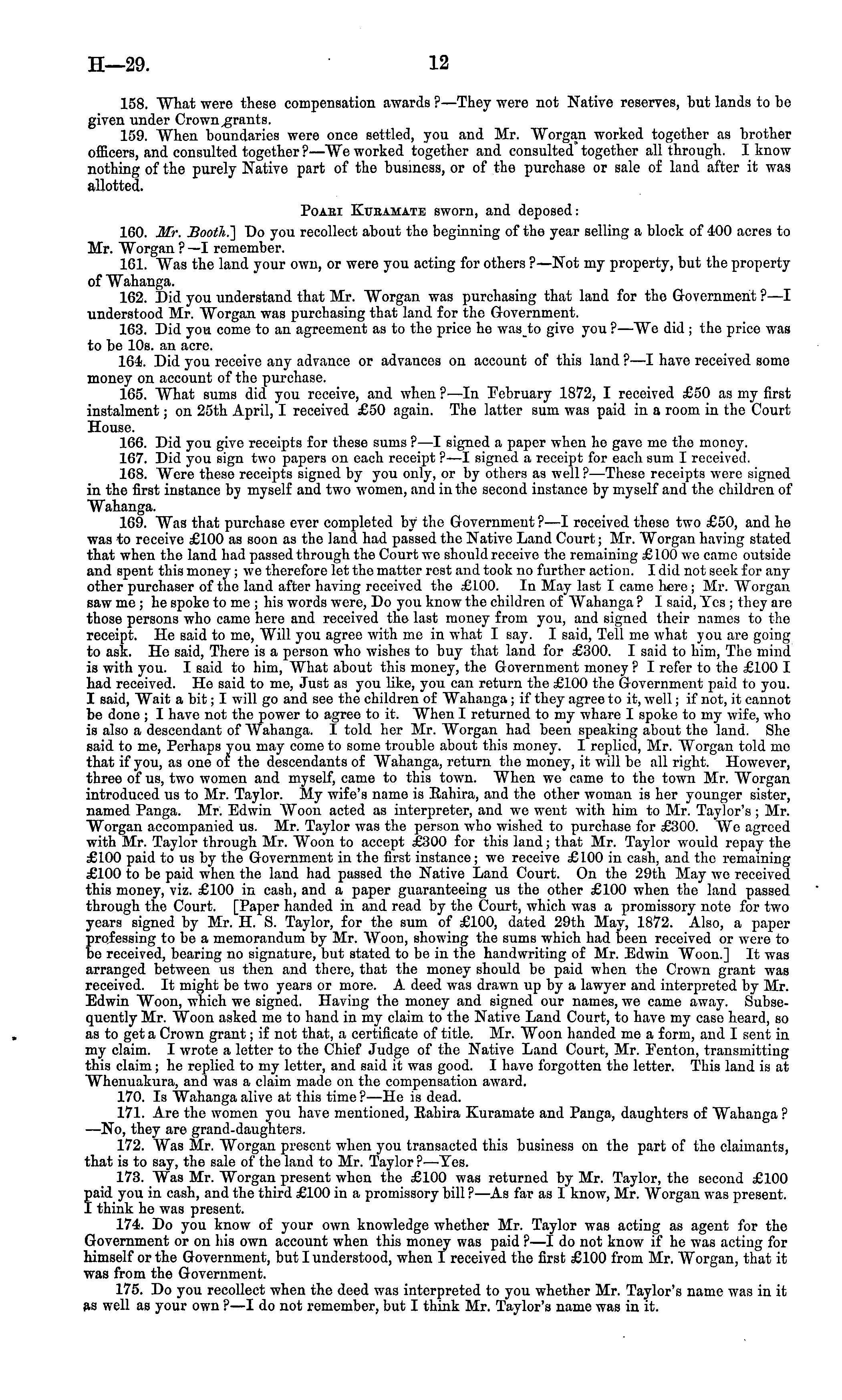 158. What were these compensation awards ?—They were not Native reserves, but lands to be given under Crown .grants. 159. AVhen boundaries were once settled, you and Mr. Worgan worked together as hrother officers, and consulted together ?—We worked together and consulted together all through. I know nothing of the purely Native part of the business, or of the purchase or sale of land after it was allotted. Poaei Kueamate sworn, and deposed: 160. Mr. Booth] Do you recollect about the beginning of tho year selling a block of 400 acres to Mr. Worgan ? —I remember. 161. AVas the land your own, or were you acting for others ?—Not my property, but the property of Wahanga. 162. Did you understand that Mr. Worgan was purchasing that land for the Government ?—I understood Mr. AVorgan was purchasing that land for tho Government. 163. Did you come to an agreement as to the price he wasto give you ? —AVe did ; tho price was to be 10s. an acre. 164. Did you receive any advance or advances on account of this land ? —I have received some money on account of the purchase. 165. What sums did you receive, and when ? —ln February 1872, I received £50 as my first instalment; on 25th April, I received £50 again. The latter sum was paid in a room in the Court House. 166. Did you give receipts for these sums ? —I signed a paper when ho gave me the money. 167. Did you sign two papers on each receipt ?—I signed a receipt for each sum I received. 168. AVere these receipts signed by you only, or by others as well ? —These receipts were signed in the first instance by myself and two women, and in the second instance by myself and the children of Wahanga. 169. Was that purchase ever completed by the Government?—l received these two £50, and he was to receive £100 as soon as the land had passed the Native Land Court; Mr. Worgan having stated that when the land had passed through the Court we should receive the remaining £ 100 we came outside and spent this money; we therefore let the matter rest and took no further action. I did not seek for any other purchaser of the land after having received the £100. In May last I came here ; Mr. Worgan saw me ; ho spoke to me ; his words were, Do you know the children of AVahanga ? I said, Yes ; they are those persons who came here and received the last money from you, and signed their names to the receipt. He said to me, Will you agree with me in what I say. I said, Tell me what you are going to ask. He said, There is a person who wishes to buy that land for £300. I said to him, The mind is with you. I said to him, What about this money, the Government money ? I refer to the £100 I had received. Ho said to me, Just as you like, you can return the £100 the Government paid to you. I said, AVait a bit; I will go and see the children of Wahanga; if they agree to it, well; if not, it cannot be done ; I have not the power to agree to it. When I returned to my whare I spoke to my wife, who is also a descendant of AVahanga. 1 told her Mr. Worgan had been speaking about the land. She said to me, Perhaps you may come to some trouble about this money. I replied, Mr. Worgan told mo that if you, as one of the descendants of AVahanga, return the money, it will be all right. However, three of us, two women and myself, came to this town. AVhen we came to the town Mr. Worgan introduced us to Mr. Taylor. My wife's name is Rahira, and the other woman is her younger sister, named Panga. Mr. Edwin Woon acted as interpreter, and we went with him to Mr. Taylor's ; Mr. Worgan accompanied us. Mr. Taylor was the person who wished to purchase for £300. We agreed with Mr. Taylor through Mr. AVoon to accept £300 for this land; that Mr. Taylor would repay the £100 paid to us by the Government in the first instance; we receive £100 in cash, and the remaining £100 to be paid when the land had passed the Native Land Court. On the 29th May wo received this money, viz. £100 in cash, and a paper guaranteeing us the other £100 when the land passed through the Court. [Paper handed in and read by the Court, which was a promissory note for two years signed by Mr. H. S. Taylor, for the sum of £100, dated 29th May, 1872. Also, a paper professing to be a memorandum by Mr. AVoon, showing the sums which had been received or were to be received, bearing no signature, but stated to be in the handwriting of Mr. Edwin Woon.] It was arranged between us then and there, that the money should be paid when the Crown grant was received. It might be two years or more. A deed was drawn up by a lawyer and interpreted by Mr. Edwin AVoon, which we signed. Having the money and signed our names, we came away. Subsequently Mr. AVoon asked me to hand in my claim to the Native Land Court, to have my case heard, so as to get a Crown grant; if not that, a certificate of title. Mr. AVoon handed me a form, and I sent in my claim. I wrote a letter to the Chief Judge of the Native Land Court, Mr. Fenton, transmitting this claim; he replied to my letter, and said it was good. I have forgotten the letter. This land is at Whenuakura, and was a claim made on the compensation award. 170. Is Wahanga alive at this time? —He is dead. 171. Are the women you have mentioned, Rahira Kuramate and Panga, daughters of Wahanga ? —No, they are grand-daughters. 172. AVas Mr. AVorgan present when you transacted this business on the part of the claimants, that is to say, the sale of the land to Mr. Taylor ?—Yes. 173. Was Mr. Worgan present when the £100 was returned by Mr. Taylor, the second £100 paid you in cash, and the third £100 in a promissory bill ? —As far as I know, Mr. AVorgan was present. I think he was present. 174. Do you know of your own knowledge whether Mr. Taylor was acting as agent for the Government or on his own account when this money was paid ?—I do not know if he was acting for himself or the Government, but I understood, when I received the first £100 from Mr. AVorgan, that it was from the 
