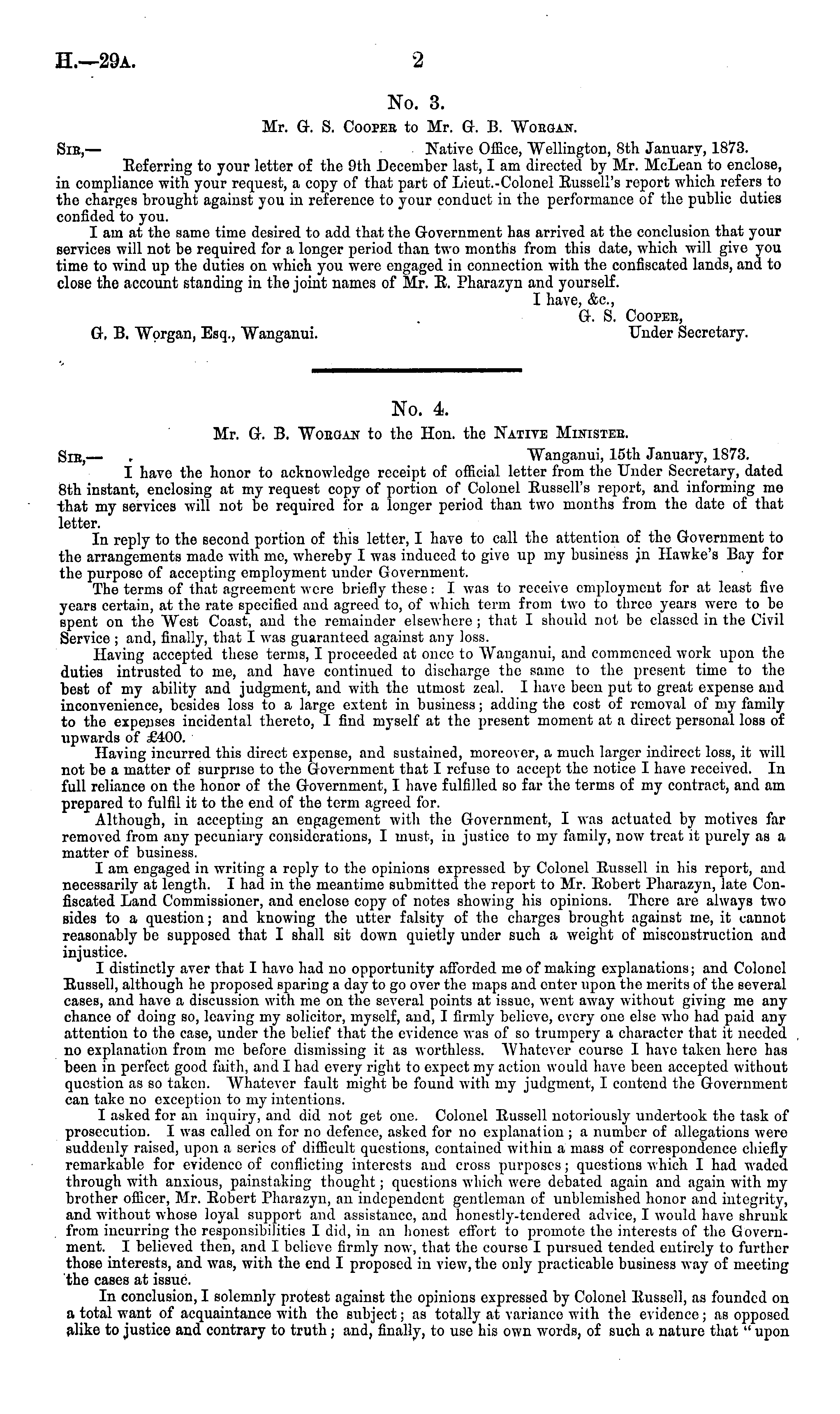 No. 3. Mr. G. S. Coopee to Mr. G. B. Wobgan. Sic,— Native Office, Wellington, Bth January, 1873. Referring to your letter of the 9th December last, I am directed by Mr. McLean to enclose, in compliance with your request, a copy of that part of Lieut.-Colonel Russell's report which refers to the charges brought against you in reference to your conduct in the performance of the public duties confided to you. I am at the same time desired to add that the Government has arrived at the conclusion that your services will not be required for a longer period than two months from this date, which will give you time to wind up the duties on which you were engaged in connection with the confiscated lands, and to close the account standing in the joint names of Mr. R. Pharazyn and yourself. I have, &c., G. S. Coopee, G, B. Worgan, Esq., Wanganui. Under Secretary.