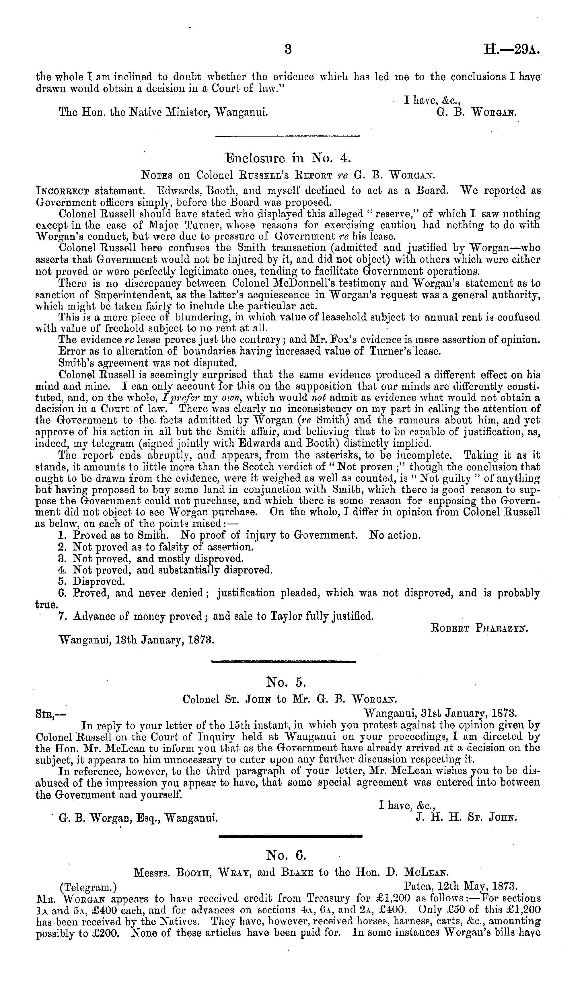 No. 5. Colonel St. John to Mr. G-. B. Woeoan. Sic, — "Wanganui, 31st January, 1873. In reply to your letter of the 15th instant, in which you protest against the opinion given by Colonel Russell on the Court of Inquiry held at "Wanganui on your proceedings, I am directed by the Hon. Mr. McLean to inform you that as the Government have already arrived at a decision on tho subject, it appears to him unnecessary to enter upon any further discussion respecting it. In reference, however, to tho third paragraph of your letter, Mr. McLean wishes you to be disabused of the impression you appear to have, that some special agreement was entered into between the Government and yourself. I have, &c, G-. B. Worgan, Esq., Wanganui. J. H. H. St. John.