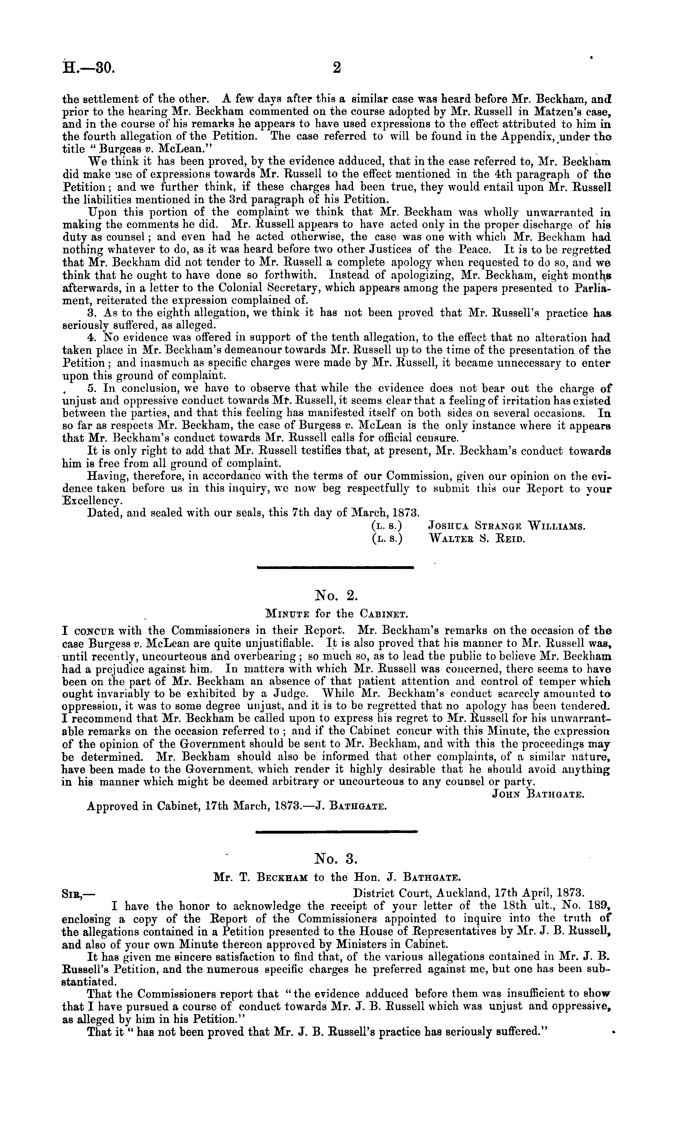 No. 3. Mr. T. Beckham to the Hon. J. Bathgate. Sic,— District Court, Auckland, 17th April, 1873. I have the honor to acknowledge the receipt of your letter of the 18th ult., No. 189, enclosing a copy of the Report of the Commissioners appointed to inquire into the truth of the allegations contained ia a Petition presented to the House of Representatives by Mr. J. B. Russell, and also of your own Minute thereon approved by Ministers in Cabinet. It has given me sincere satisfaction to find that, of the various allegations contained in Mr. J. B. Russell's Petition, and the numerous specific charges he preferred against me, but one has been substantiated. That the Commissioners report that "the evidence adduced before them was insufficient to showthat I have pursued a course of conduct towards Mr. J. B. Russell which was unjust and oppressive, as alleged by him in his Petition." That it " has not been proved that Mr. J. B. Russell's practice has seriously suffered." «