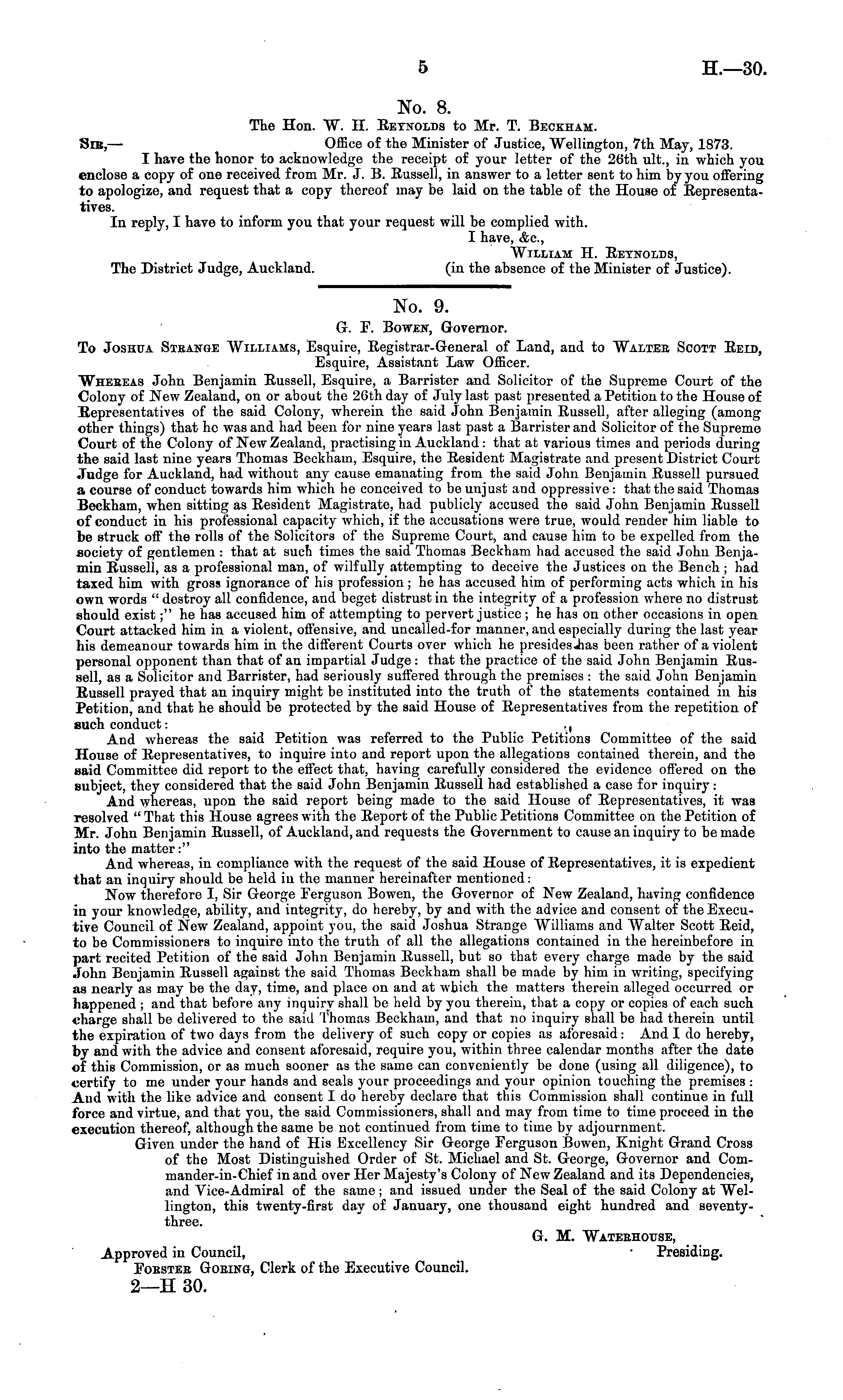 No. 9. G. F. Bowen, Governor. To Joshua Strange Williams, Esquire, Registrar-General of Land, and to Walter Scott Reid, Esquire, Assistant Law Officer. Whereas John Benjamin Russell, Esquire, a Barrister and Solicitor of the Supreme Court of tho Colony of New Zealand, on or about the 26th day of July last past presented a Petition to the House of Representatives of the said Colony, wherein the said John Benjamin Russell, after alleging (among other things) that he was and had been for nine years last past a Barrister and Solicitor of the Supreme Court of the Colony of New Zealand, practising in Auckland : that at various times and periods during the said last nine years Thomas Beckham, Esquire, the Resident Magistrate and present District Court Judge for Auckland, had without any cause emanating from the said John Benjamin Russell pursued a course of conduct towards him which he conceived to be unjust and oppressive: that the said Thomas Beckham, when sitting as Resident Magistrate, had publicly accused the said John Benjamin Russell of conduct in his professional capacity which, if the accusations were true, would render him liable to be struck off the rolls of the Solicitors of the Supreme Court, and cause him to be expelled from the society of gentlemen : that at such times the said Thomas Beckham had accused the said John Benjamin Russell, as a professional man, of wilfully attempting to deceive the Justices on the Bench ; had taxed him with gross ignorance of his profession; he has accused him of performing acts which in his own words " destroy all confidence, and beget distrust in the integrity of a profession where no distrust should exist;" he has accused him of attempting to pervert justice ;he has on other occasions in open Court attacked him in a violent, offensive, and uncalled-for manner, and especially during the last year his demeanour towards him in the different Courts over which he presides .has been rather of a violent personal opponent than that of an impartial Judge : that the practice of the said John Benjamin Russell, as a Solicitor and Barrister, had seriously suffered through the premises : the said John Benjamin Russell prayed that an inquiry might be instituted into the truth of the statements contained iv his Petition, and that he should be protected by the said House of Representatives from the repetition of such conduct: ~ And whereas the said Petition was referred to the Public Petitions Committee of the said House of Representatives, to inquire into and report upon the allegations contained therein, and the said Committee did report to the etfect that, having carefully considered the evidence offered on the subject, they considered that the said John Benjamin Russell had established a case for inquiry: And whereas, upon the said report being made to the said House of Representatives, it was resolved " That this House agrees with the Report of the Public Petitions Committee on the Petition of Mr. John Benjamin Russell, of Auckland, and requests the Government to cause an inquiry to be made into the matter:" And whereas, in compliance with the request of the said House of Representatives, it is expedient that an inquiry should be held in the manner hereinafter mentioned: Now therefore I, Sir George Ferguson Bowen, the Governor of New Zealand, having confidence iv your knowledge, ability, and integrity, do hereby, by and with the advice and consent of the Executive Council of New Zealand, appoint you, the said Joshua Strange Williams and Walter Scott Reid, to be Commissioners to inquire iuto the truth of all the allegations contained in the hereinbefore in part recited Petition of the said John Benjamin Russell, but so that every charge made by the said John Benjamin Russell against the said Thomas Beckham shall be made by him in writing, specifying as nearly as may be the day, time, and place on and at which the matters therein alleged occurred or happened ; and that before any inquiry shall be held by you therein, that a copy or copies of each such charge shall be delivered to the said Thomas Beckham, and that no inquiry shall be had therein until the expiration of two days from the delivery of such copy or copies as aforesaid: And Ido hereby, by and with the advice and consent aforesaid, require you, within three calendar months after the date of this Commission, or as much sooner as the same can conveniently be done (using all diligence), to certify to me under your hands and seals your proceedings and your opinion touching the premises : And with the like advice and consent I do hereby declare that this Commission shall continue in full force and virtue, and that you, the said Commissioners, shall and may from time to time proceed in the execution thereof, although the same be not continued from time to time by adjournment. Given under the hand of His Excellency Sir George Ferguson Bowen, Knight Grand Cross of the Most Distinguished Order of St. Michael and St. George, Governor and Com-mander-in-Chief in and over Her Majesty's Colony of New Zealand and its Dependencies, and Vice-Admiral of the same; and issued under the Seal of the said Colony at Wellington, this twenty-first day of January, one thousand eight hundred and seventythree. G. M. Waterhouse, Approved in Council, Presiding. Forster Goring, Clerk of the Executive Council. 2—H 30.