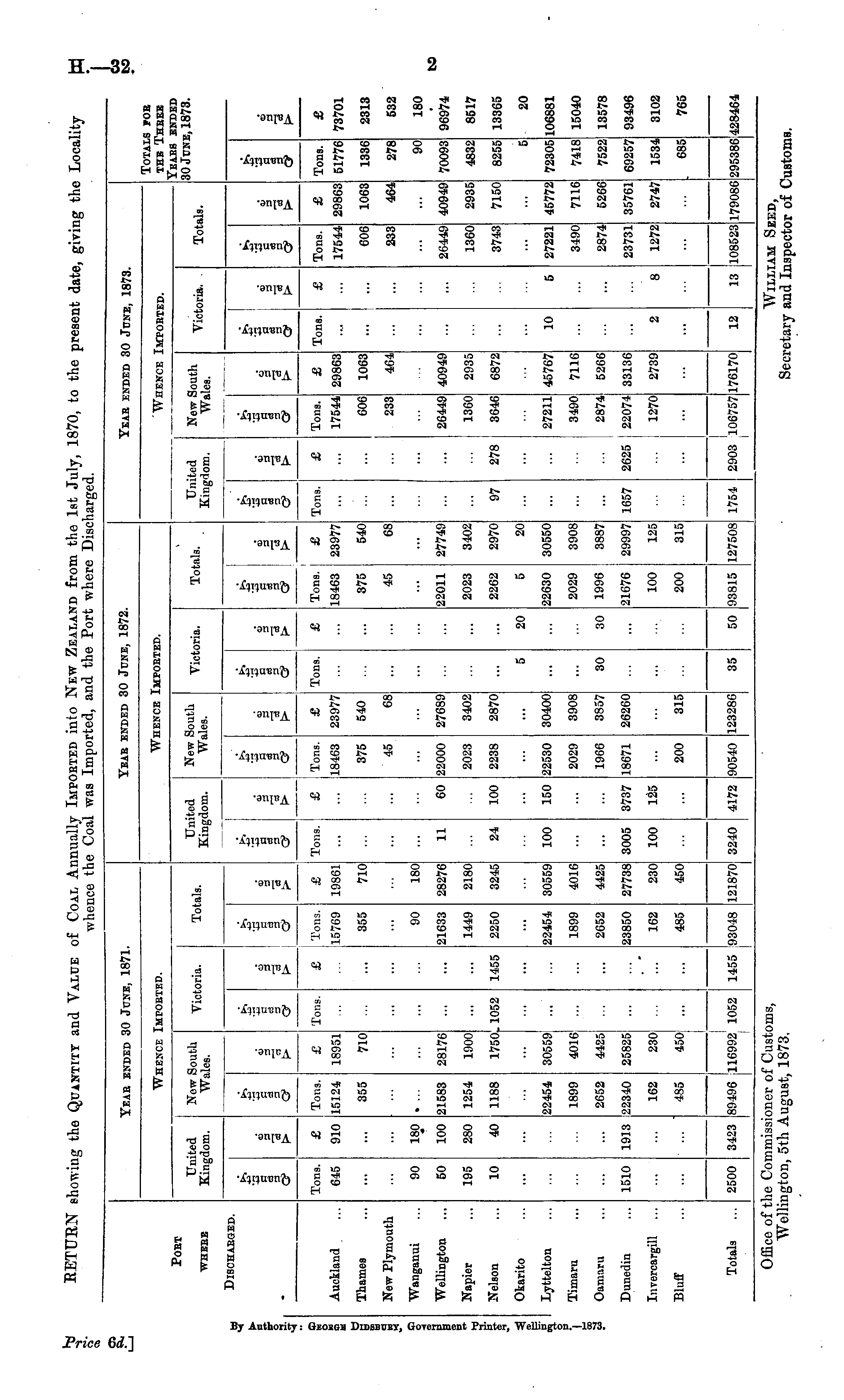 RETURN showing the QUANTITY and VALUE of COAL Annually IMPORTED into NEW ZEALAND from the 1st July, 1870, to the present date, giving the Locality whence the Coal was Imported, and the Port where Discharged.