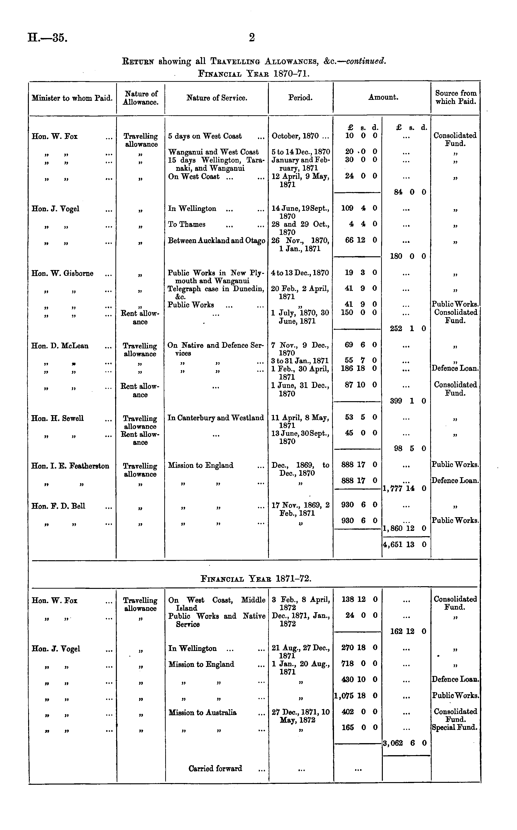 Eetukn s' towing all Travelling Allowances, :. — continue! Financial Tkae 1870-71. Minister to whom Paid. Nature of Allowance. Nature of Service. Period. Ami mnt. Source from which Paid. £ a. d. 10 0 0 £ b. d. Hon. W. Fox Travelling allowance 5 days on West Coast October, 1870 ... Consolidated Fund. JJ tt ••• i» Wanganui and West Coast 15 days Wellington, Taranaki, and Wanganui On West Coast ... 5 to 14 Dec, 1870 January and February, 1871 12 April, 9 May, 1871 20 0 0 30 0 0 >} 11 it •" D j) It 1} ••• H 24 0 0 a In Wellington ... 84 0 0 Hon. J. Yogel II 14 June, 19 Sept., 1870 28 and 29 Oct., 1870 26 Nov., 1870, 1 Jan., 1871 109 4 0 a II To Thames 4 4 0 it it >t n Between Auckland and Otago 66 12 0 ii 180 0 0 Hon. "W. Gisborne tt jt ••• », n Public Works in New Plymouth and Wanganui Telegraph case in Dunedin, &c. Public Works 4 to 13 Dec, 1870 20 Feb., 2 April, 1871 19 3 0 41 9 0 a ii it >j ••• ii Rent allow1 July, 'l87O, 30 June, 1871 41 9 0 150 0 0 Public Works. Consolidated Fund. t* a ••• ance 252 1 0 Hon. D. McLean Travelling allowance On Native and Defence Services 7 Nov., 9 Dec, 1870 3 to 31 Jan., 1871 1 Feb., 30 April, 1871 1 June, 31 Dec, 1870 69 6 0 ii >! 9 ••• n n ii 55 7 0 186 18 0 Defence Loan. it it n ii ii ••• it it Rent allowance 87 10 0 Consolidated Fund. In Canterbury and Westland 399 1 0 Hon. H. Sewell Travelling allowance Rent allowance 11 April, 8 May, 1871 13 June, 30Sept., 1870 53 5 0 )) » it 45 0 0 n Mission to England 98 5 0 Public Works. Hon. I. E. Featherston Travelling allowance Dec, 1869, to Dec, 1870 888 17 0 n it ii ii 888 17 0 1,997*14 0 Defence Loan. n it Hon. F. D. Bell it ii ii 17 Nov., 1869, 2 Feb., 1871 930 6 0 j» ii ii ••• n ii ii 930 6 0 1,860 12 0 4,651 13 0 Public Works. ti Financial Yeab 1871-72. Hon. W. Fox 11 » Travelling allowance ii On West Coast, Middle Island Public Works and Native Service 3 Feb., 8 April, 1872 Dec, 1871, Jan., 1872 138 12 0 24 0 0 Consolidated Fund. ii 162 12 0 Hon. J. Vogel ii In Wellington 21 Aug., 27 Dec, 1871 1 Jan., 20 Aug., 1871 270 18 0 ii it it M Mission to England 718 0 0 ii if it II ii ii )) 430 10 0 Defence Loan. it it If ii iy It 1,075 18 0 PublicWorks. n it II Mission to Australia 27 Dec, 1871, 10 May, 1872 402 0 0 Consolidated Fund. Special Fund. it 1* II ii ii ••■ 165 0 0 » 3,062 6 0 Carried forward