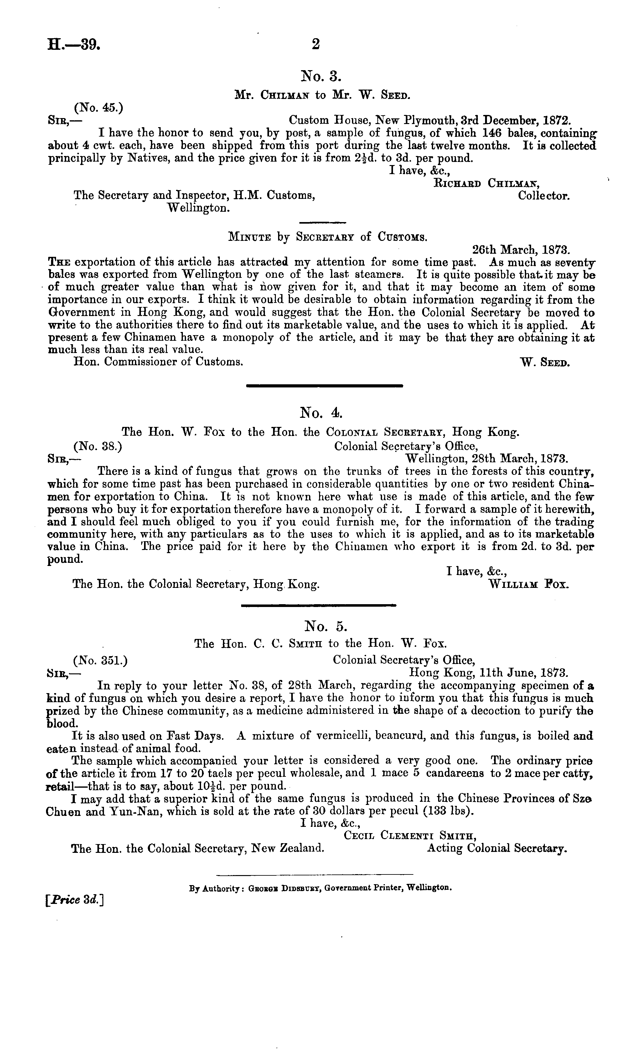 No. 5. The Hon. C. C. Smith to the Hon. W. Fox. (No. 351.) Colonial Secretary's Office, Sib, — Hong Kong, 11th June, 1873. In reply to your letter No. 38, of 28th March, regarding the accompanying specimen of a kind of fungus on which you desire a report, I have the honor to inform you that this fungus is much prized by the Chinese community, as a medicine administered in the shape of a decoction to purify the blood. It is also used on Fast Days. A mixture of vermicelli, beancurd, and this fungus, is boiled and eaten instead of animal food. The sample which accompanied your letter is considered a very good one. The ordinary price of the article it from 17 to 20 taels per pecul wholesale, and 1 mace 5 candareens to 2 mace per catty, retail —that is to say, about 10_d. per pound. I may add that a superior kind of the same fungus is produced in the Chinese Provinces of Sze Chuen and Yun-Nan, which is sold at the rate of 30 dollars per pecul (133 lbs). I have, &c, Cecil Clementi Smith, The Hon. the Colonial Secretary, New Zealand. Acting Colonial Secretary.