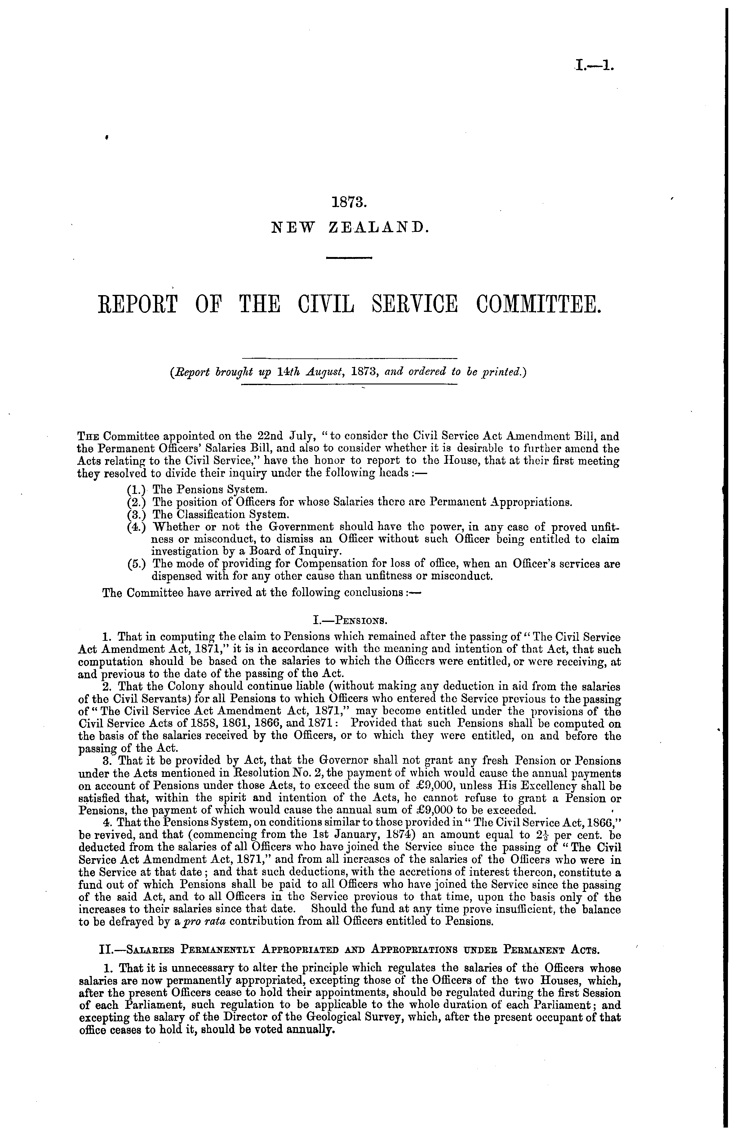 The Committee appointed on the 22nd July, " to consider the Civil Service Act Amendment Bill, and the Permanent Officers' Salaries Bill, and also to consider whether it is desirable to further amend the Acts relating to the Civil Service," have the honor to report to the House, that at their first meeting they resolved to divide their inquiry under the following heads : — (1.) The Pensions System. (2.) The position of Officers for whose Salaries there arc Permanent Appropriations. (3.) The Classification System. (4.) Whether or not the Government should have the power, in any case of proved unfitness or misconduct, to dismiss an Officer without such Officer being entitled to claim investigation by a Board of Inquiry. (5.) The mode of providing for Compensation for loss of office, when an Officer's services are dispensed with for any other cause than unfitness or misconduct. The Committee have arrived at the following conclusions : — I.—Pensions. 1. That in computing the claim to Pensions which remained after the passing of" The Civil Service Act Amendment Act, 1871," it is in accordance with the meaning and intention of that Act, that such computation should be based on the salaries to which the Officers were entitled, or were receiving, at and previous to the date of the passing of the Act. 2. That the Colony should continue liable (without making any deduction in aid from the salaries of the Civil Servants) for all Pensions to which Officers who entered the Service previous to the passing of "The Civil Service Act Amendment Act, 1871," may become entitled under the provisions of the Civil Service Acts of 1858, 1861, 1866, and 1871: Provided that such Pensions shall be computed on the basis of the salaries received by tho Officers, or to which they wore entitled, on and before the passing of the Act. 3. That it be provided by Act, that tho Governor shall not grant any fresh Pension or Pensions under the Acts mentioned in Resolution No. 2, the payment of which would cause the annual payments on account of Pensions under those Acts, to exceed the sum of £9,000, unless His Excellency shall be satisfied that, within the spirit and intention of the Acts, he cannot refuse to grant a Pension or Pensions, tho payment of which would cause tho annual sum of £9,000 to be exceeded. 4. That the Pensions System, on conditions similar to those provided in " The Civil Service Act, 1866," bo revived, and that (commencing from tho Ist January, 1874) an amount equal to 2-J per cent, be deducted from the salaries of all Officers who have joined the Service since the passing of "The Civil Service Act Amendment Act, 1871," and from all increases of the salaries of the Officers who were in the Service at that date ; and that such deductions, with the accretions of interest thereon, constitute a fund out of which Pensions shall be paid to all Officers who have joined the Service since the passing of the said Act, and to all Officers in the Service previous to that time, upon the basis only of the increases to their salaries since that date. Should the fund at any time prove insufficient, the balance to be defrayed by a pro rata contribution from all Officers entitled to Pensions. II. —Salaeies Pebmanentlt. Appeopbiated and Appeopeiations undee Peemanent Acts. 1. That it is unnecessary to alter the principle which regulates the salaries of the Officers whose salaries are now permanently appropriated, excepting those of the Officers of the two Houses, which, after the present Officers cease to hold their appointments, should be regulated during the first Session of each Parliament, such regulation to be applicable to the whole duration of each Parliament; and excepting the salary of the Director of the Geological Survey, which, after the present occupant of that office ceases to hold it, should be voted annually.