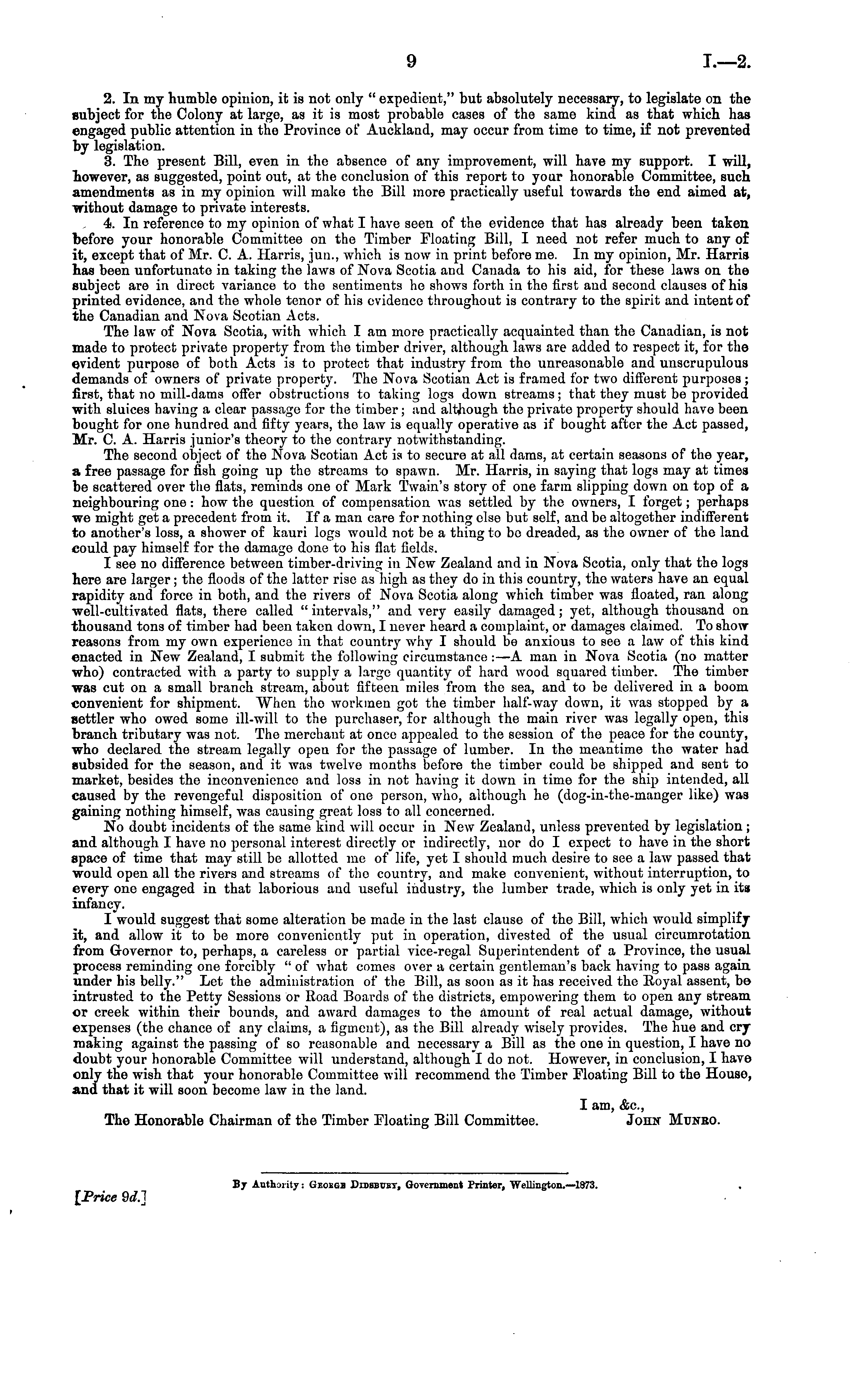 2. In my humble opinion, it is not only " expedient," but absolutely necessary, to legislate on the subject for the Colony at large, as it is most probable eases of the same kind as that which has engaged public attention iv the Province of Auckland, may occur from time to time, if not prevented by legislation. 3. The present Bill, even in the absence of any improvement, will have my support. I will, however, as suggested, point out, at the conclusion of this report to your honorable Committee, such amendments as in my opinion will make the Bill more practically useful towards the end aimed at, without damage to private interests. 4. In reference to my opinion of what I have seen of the evidence that has already been taken before your honorable Committee on the Timber Floating Bill, I need not refer much to any of it, except that of Mr. C. A. Harris, jun., which is now in print before me. In my opinion, Mr. Harris has been unfortunate in taking the laws of Nova Scotia and Canada to his aid, for these laws on the subject aro in direct variance to the sentiments he shows forth in the first and second clauses of his printed evidence, and the whole tenor of his evidence throughout is contrary to the spirit and intent of the Canadian and Nova Scotian Acts. The law of Nova Scotia, with which I am more practically acquainted than the Canadian, is not made to protect private property from the timber driver, although laws are added to respect it, for the evident purpose of both Acts is to protect that industry from the unreasonable and unscrupulous demands of owners of private property. The Nova Scotian Act is framed for two different purposes ; first, that no mill-darns offer obstructions to taking logs down streams; that they must be provided with sluices having a clear passage for the timber; and although the private property should have been bought for one hundred and fifty years, the law is equally operative as if bought after the Act passed, Mr. C. A. Harris junior's theory to the contrary notwithstanding. The second object of the Nova Scotian Act is to secure at all dams, at certain seasons of the year, a free passage for fish going up the streams to spawn. Mr. Harris, in saying that logs may at times be scattered over the flats, reminds one of Mark Twain's story of one farm slipping down on top of a neighbouring one: how the question of compensation was settled by the owners, I forget; perhaps we might got a precedent from it. If a man care for nothing else but self, and be altogether indifferent to another's loss, a shower of kauri logs would not be a thing to bo dreaded, as the owner of the land could pay himself for the damage done to his flat fields. I see no difference between timber-driving in New Zealand and in Nova Scotia, only that the logs here are larger; the floods of the latter rise as high as they do in this country, the waters have an equal rapidity and force in both, and the rivers of Nova Scotia along which timber was floated, ran along ■well-cultivated flats, there called "intervals," and very easily damaged; yet, although thousand on thousand tons of timber had been taken down, I never heard a complaint, or damages claimed. To show reasons from my own experience in that couiitry why I should bo anxious to sco a law of this kind enacted in New Zealand, I submit the following circumstance : —A man in Nova Scotia (no matter who) contracted with a party to supply a large quantity of hard wood squared timber. The timber was cut on a small branch stream, about fifteen miles from the sea, and to be delivered in a boom convenient for shipment. When tho workmen got the timber half-way down, it was stopped by a settler who owed some ill-will to the purchaser, for although the main river was legally open, this branch tributary was not. The merchant at once appealed to the session of the peace for the county, who declared the stream legally opeu for the passage of lumber. In the meantime tho water had subsided for tho season, and it was twelve months before the timber could be shipped and sent to market, besides the inconvenience and loss in not having it down in time for the ship intended, all caused by the revengeful disposition of one person, who, although he (dog-in-the-manger like) was gaining nothing himself, was causing great loss to all concerned. No doubt incidents of the same kind will occur in Now Zealand, unless prevented by legislation ; and although I have no personal interest directly or indirectly, nor do I expect to have in the short space of time that may still be allotted me of life, yet I should much desire to see a law passed that would open all the rivers and streams of tho country, and make convenient, without interruption, to every one engaged in that laborious and useful industry, the lumber trade, which is only yet in its infancy. I would suggest that some alteration be made in the last clause of the Bill, which would simplify it, and allow it to be more conveniently put in operation, divested of the usual circumrotation from Governor to, perhaps, a careless or partial vice-regal Superintendent of a Province, the usual process reminding one forcibly "of what comes over a certain gentleman's back having to pass again under his belly." Let the administration of the Bill, as soon as it has received the Royal assent, bo intrusted to the Petty Sessions or Road Boards of the districts, empowering them to open any stream or creek within their bounds, and award damages to the amount of real actual damage, without expenses (the chance of any claims, a figment), as the Bill already wisely provides. The hue and cry making against the passing of so reasonable and necessary a Bill as the one in question, I have no doubt your honorable Committee will understand, although Ido not. However, in conclusion, I have only the wish that your honorable Committee will recommend tho Timber Floating Bill to the House, and that it will soon become law in the land. I am, &c, The 