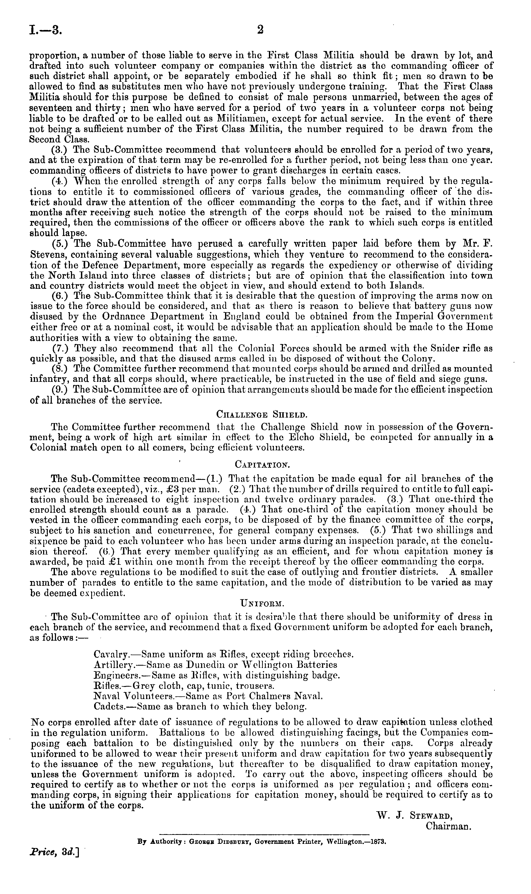proportion, a number of those liable to serve in the First Class Militia should be drawn by lot, and drafted into such volunteer company or companies within the district as tho commanding officer of such district shall appoint, or be separately embodied if he shall so think fit; men so drawn to be allowed to find as substitutes men who have not previously undergone training. That the First Class Militia should for this purpose be defined to consist of male persons unmarried, between the ages of seventeen and thirty; men who have served for a period of two years in a volunteer corps not being liable to be drafted or to be called out as Militiamen, except for actual service. In the event of there not being a sufficient number of the First Class Militia, the number required to be drawn from the Second Class. (3.) The Sub-Committee recommend that volunteers should be enrolled for a period of two years, and at the expiration of that term may be re-enrolled for a further period, not being less than one year, commanding officers of districts to have power to grant discharges in certain cases. (4.) When the enrolled strength of any corps falls below the minimum required by the regulations to entitle it to commissioned officers of various grades, the commanding officer of the district should draw the attention of the officer commanding the corps to the fact, and if within three months after receiving such notice the strength of the corps should not be raised to the minimum required, then the commissions of the officer or officers above the rank to which such corps is entitled should lapse. (5.) The Sub-Committee have perused a carefully written paper laid before them by Mr. F. Stevens, containing several valuable suggestions, which they venture to recommend to the consideration of the Defence Department, more especially as regards the expediency or otherwise of dividing the North Island into three classes of districts; but are of opinion that the classification into town and country districts would meet the object in view, and should extend to both Islands. (6.) The Sub-Committee think that it is desirable that the question of improving the arms now on issue to the force should be considered, and that as there is reason to believe that battery guns now disused by the Ordnance Department in England could be obtained from the Imperial Government cither free or at a nominal cost, it would be advisable that an application should be made to the Home authorities with a view to obtaining the same. (7.) They also recommend that all the Colonial Forces should be armed with the Snider rifle as quickly as possible, and that the disused arms called in be disposed of without the Colony. (8.) The Committee further recommend that mounted corps should be armed and drilled as mounted infantry, and that all corps should, where practicable, be instructed in the use of field and siege guns. (9.) The Sub-Committee are of opinion that arrangements should be made for the efficient inspection of all branches of the service. Challenge Shield. The Committee further recommend that the Challenge Shield now in possession of the Government, being a work of high art similar in effect to the Elcho Shield, be competed for annually in a Colonial match open to all comers, being efficient volunteers. Capitation. The Sub-Committee recommend—(l.) That the capitation be made equal for ail branches of the service (cadets excepted), viz., £3 per man. (2.) That the number of drills required to entitle to full capitation should be increased to eight inspection and twelve ordinary parades. (3.) That one-third tho enrolled strength should count as a parade. (4.) That one-third of the capitation money should be vested in the officer commanding each corps, to be disposed of by the finance committee of the corps, subject to his sanction and concurrence, for general company expenses. (5.) That two shillings and sixpence be paid to each volunteer who has been under arms during an inspection parade, at the conclusion thereof. (6.) That every member qualifying as an efficient, and for whom capitation money is awarded, be paid £l within one month from the receipt thereof by the officer commanding the corps. Tho above regulations to be modified to suit the case of outlying and frontier districts. A smaller number of parades to entitle to the same capitation, and the mode of distribution to be varied as may be deemed expedient. Uniform. The Sub-Committee are of opinion that it is desirable that there should be uniformity of dress in each branch of the service, and recommend that a fixed Government uniform be adopted for each branch, as follows: — Cavalry. —Same uniform as Eifles, except riding breeches. Artillery. —Same as Dunedin or Wellington Batteries Engineers.— Same as Eifles, with distinguishing badge. Eifles. —Grey cloth, cap, tunic, trousers. Naval Volunteers. —Same as Port Chalmers Naval. Cadets.—Same as branch to which they belong. No corps enrolled after date of issuance of regulations to be allowed to draw capitation unless clothed in tho regulation uniform. Battalions to be allowed distinguishing facings, but the Companies composing each battalion to be distinguished only by the numbers on their caps. Corps already uniformed to be allowed to wear their present uniform and draw capitation for two years subsequently to the issuance of the new regulations, but thereafter to be disqualified to draw capitation money, unless the Government uniform is adopted. To carry out the above, inspecting officers should be required to certify as to whether or not the corps is uniformed as per regulation ; and officers commanding corps, in signing their applications for capitation money, should be required to certify as to the uniform of the corps. W. J. Stewaed, Chairman. By Authority: George Didsbubt, Government Printer, Wellington.—lß73. Price, 3d.]