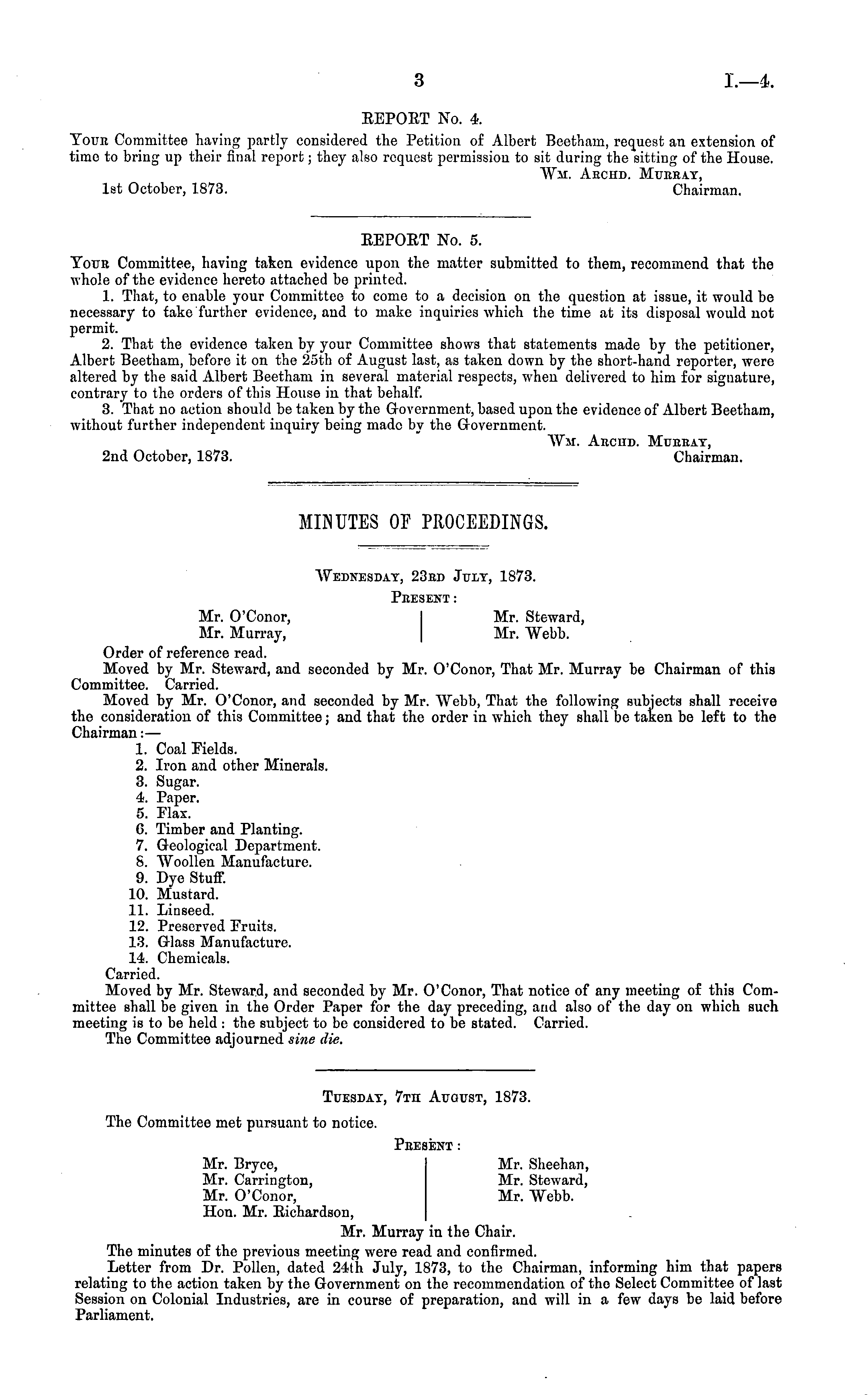 MINUTES OF PROCEEDINGS. Wednesday, 23rd July, 1873. Present s Mr. O'Conor, Mr. Steward, Mr. Murray, Mr. Webb. Order of reference read. Moved by Mr. Steward, and seconded by Mr. O'Conor, That Mr. Murray be Chairman of this Committee. Carried. Moved by Mr. O'Conor, and seconded by Mr. Webb, That the following subjects shall receive the consideration of this Committee; and that the order in which they shall be taken be left to the Chairman:—■ 1. Coal Fields. 2. Iron and other Minerals. 3. Sugar. 4. Paper. 5. Flax. G. Timber and Planting. 7. Geological Department. S. Woollen Manufacture. 9. Dye Stuff. 10. Mustard. 11. Liuseed. 12. Preserved Fruits. 18. Glass Manufacture. 14. Chemicals. Carried. Moved by Mr. Steward, and seconded by Mr. O'Conor, That notice of any meeting of this Committee shall bo given in the Order Paper for the day preceding, and also of the day on which such meeting is to be held : the subject to be considered to be stated. Carried. The Committee adjourned sine die.