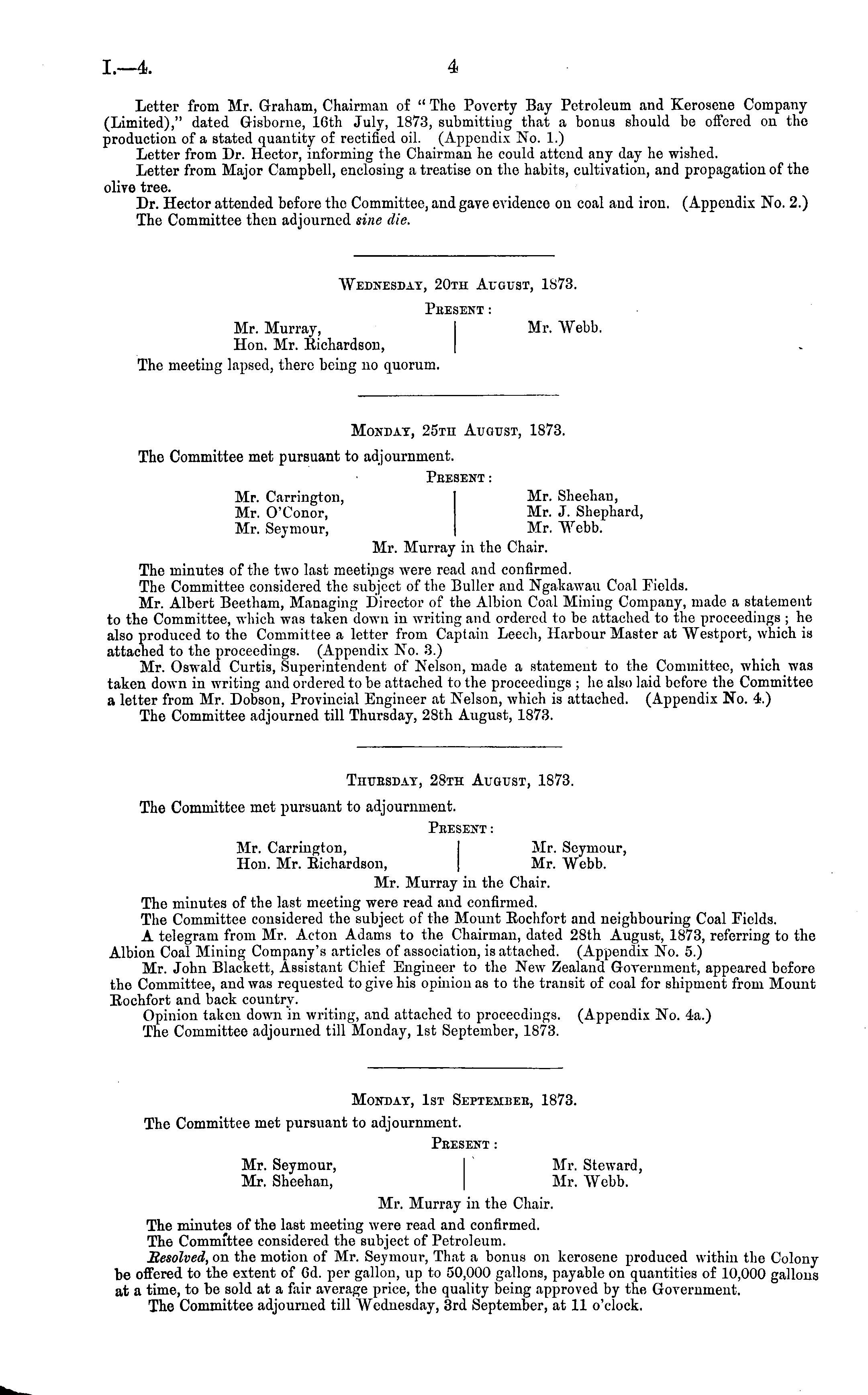 Letter from Mr. Graham, Chairman of " The Poverty Bay Petroleum and Kerosene Company (Limited)," dated Gisborne, 16th July, 1873, submitting that a bonus should be olfercd on the production of a stated quantity of rectified oil. (Appendix No. 1.) Letter from Dr. Hector, informing the Chairman he could attend any day he wished. Letter from Major Campbell, enclosing a treatise on the habits, cultivation, and propagation of the olive tree. Dr. Hector attended before the Committee, and gave evidence on coal and iron. (Appendix No. 2.) The Committee then adjourned sine die.