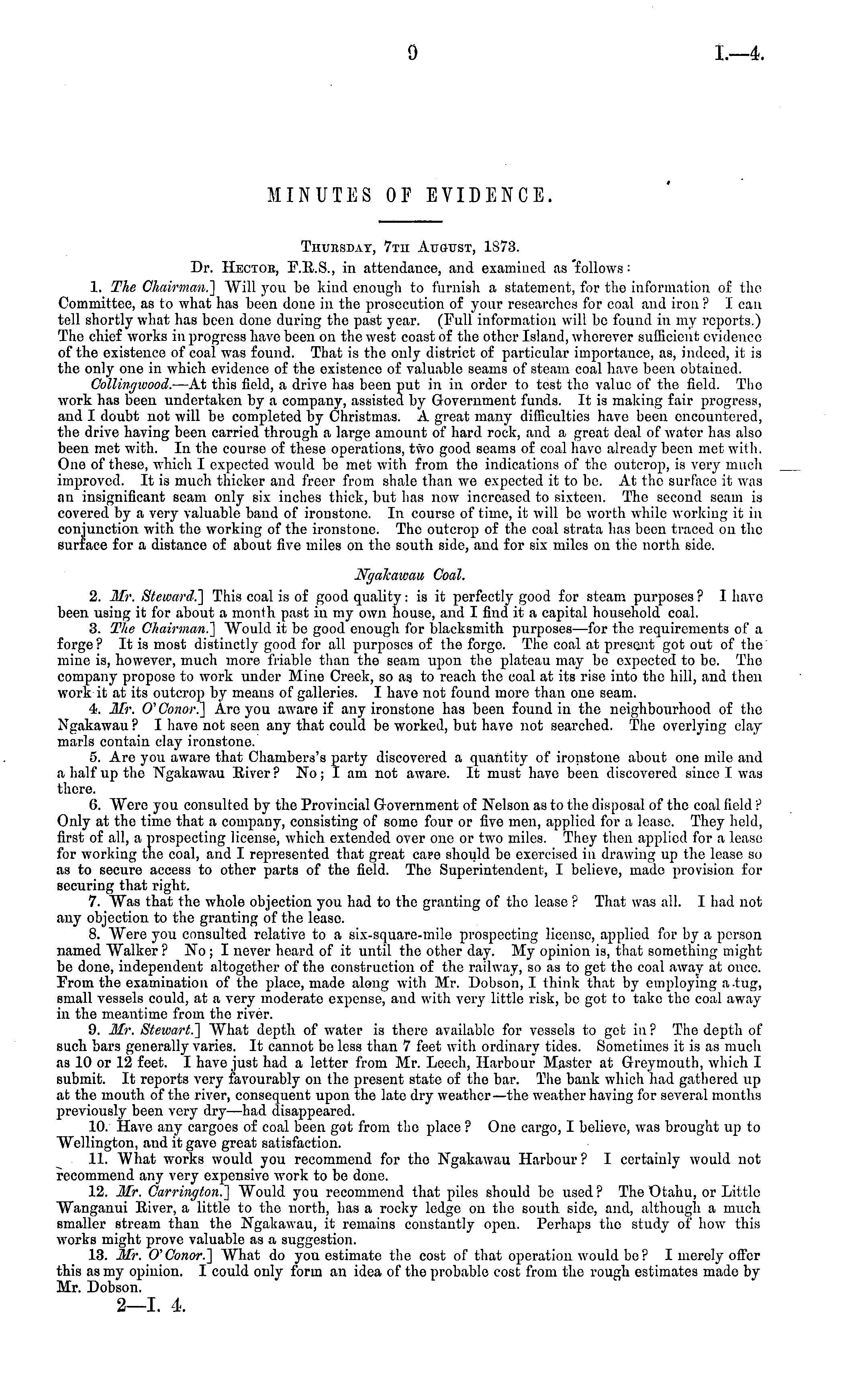 Tiiuhsdat, 7tii August, 1573. Dr. Hectob, F.E.S., in attendance, and examined as 'follows: 1. The Chairman.'] Will you be kind enough to furnish a statement, for the information of the Committee, as to what has been done in the prosecution of your researches for coal and iron ? I can tell shortly what has been done during the past year. (Full information will be found in my reports.) The chief works in progress have been on the west coast of the other Island, wherever sufficient evidence of the existence of coal was found. That is the only district of particular importance, as, indeed, it is the only one in which evidence of the existence of valuable seams of steam coal have been obtained. Collins/wood. —At this field, a drive has boon put in in order to test the value of the field. The work has been undertaken by a company, assisted by Government funds. It is making fair progress, and I doubt not will be completed by Christmas. A great many difficulties have been encountered, the drive having been carried through a large amount of hard rock, and a great deal of water has also been met with. In the course of these operations, two good seams of coal have already been met with. One of these, which I expected would bo met with from the indications of the outcrop, is very much improved. It is much thicker and freer from shale than we expected it to be. At the surface it was an insignificant scam only six inches thick, but has now increased to sixteen. The second seam is covered by a very valuable band of iroustone. In course of time, it will bo worth while working it in conjunction with the working of the ironstone. The outcrop of the coal strata has been traced on the surface for a distance of about five miles on the south side, and for six miles on the north side. Ngalcawau Coal. 2. Mr, Steward.'] This coal is of good quality: is it perfectly good for steam purposes ? I have been using it for about a month past in my own house, and I find it a capital household coal. 3. The Chairman.'] Would it bo good enough for blacksmith purposes —for the requirements of a forge? It is most distinctly good for all purposes of the forgo. The coal at present got out of the mine is, however, much more friable than the seam upon the plateau may be expected to bo. The company propose to work under Mine Creek, so as to reach the coal at its rise into the hill, and then work it at its outcrop by means of galleries. I have not found more than one seam. 4. Mr. o'Conor.] Are you aware if any ironstone has been found in the neighbourhood of the Xgakawau ? I have not seen any that could bo worked, but have not searched. The overlying clay marls contain clay ironstone. 5. Are you aware that Chambers's party discovered a quantity of ironstone about one mile and a half up the Ngakawau River? No; I am not aware. It must have been discovered since I was there. 6. Were you consulted by the Provincial Government of Nelson as to the disposal of the coal field ? Only at the time that a company, consisting of some four or five men, applied for a lease. They held, first of all, a prospecting license, which extended over one or two miles. They then applied for a lease for working the coal, and I represented that great caro should be exercised in drawing up the lease so as to secure access to other parts of the field. The Superintendent, I believe, made provision for securing that right. 7. Was that the whole objection you had to the granting of the lease ? That was all. I had not any objection to the granting of the lease. 8. Were you consulted relative to a six-square-mile prospecting license, applied for by a person named Walker ? No ; I never heard of it until the other day. My opinion is, that something might be done, independent altogether of the construction of the railway, so as to get the coal away at once. From the examination of the place, made along with Mr. Dobson, I think that by employing a.tug, small vessels could, at a very moderate expense, and with very little risk, be got to take the coal away in the meantime from the river. 9. Mr. Stewart.] What depth of water is there available for vessels to got in ? The depth of such bars generally varies. It cannot bo less than 7 feet with ordinary tides. Sometimes it is as much as 10 or 12 feet. I have just had a letter from Mr. Leech, Harbour Master at Greymouth, which I submit. It reports very favourably on the present state of the bar. The bank which had gathered up at the mouth of the river, consequent upon the late dry weather—the weather having for several months previously been very dry —had disappeared. 10. Have any cargoes of coal been got from the place ? One cargo, I believe, was brought up to Wellington, and it gave great satisfaction. 11. What works would you recommend for the Ngakawau Harbour ? I certainly would not recommend any very expensive work to be done. 12. Mr. Carringlon.] Would you recommend that piles should bo used? The Otahu, or Little Wanganui River, a little to the north, has a rocky ledge on the south side, and, although a much smaller stream than the Ngakawau, it remains constantly open. Perhaps the study of how this works might prove valuable as a suggestion. 13. Mr. O'Conor.] What do you estimate the cost of that operation would be? I merely offer this as my opinion. I could only form an idea of the probable cost from the rough estimates made by Mr. Dobson. 2—l. d...
