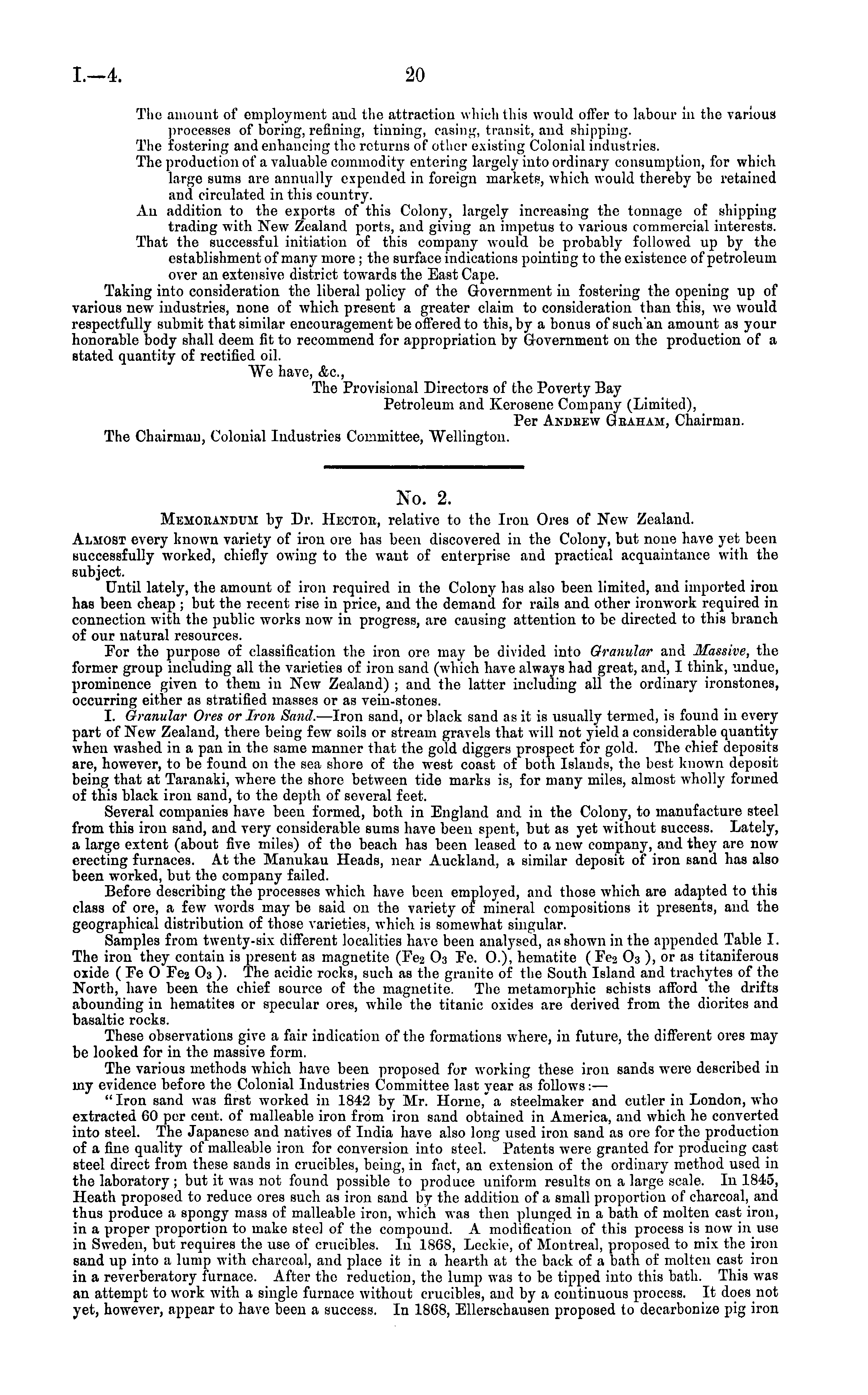 Xo. 2. Memorandum by Dr. Hector, relative to the Iron Ores of New Zealand. Almost every known variety of iron ore lias been discovered in the Colony, but none have yet been successfully worked, chiefly owing to the want of enterprise and practical acquaintance with the subject. Until lately, the amount of iron required in the Colony has also been limited, and imported iron has been cheap ; but the recent rise in price, and the demand for rails and other ironwork required in connection with the public works now in progress, are causing attention to be directed to this branch of our natural resources. For the purpose of classification the iron ore may be divided into Granular and Massive, the former group including all the varieties of iron sand (which have always had great, and, I think, undue, prominence given to them in New Zealand) ; and the latter including all the ordinary ironstones, occurring either as stratified masses or as vein-stones. I. Granular Ores or Iron Sand. —lron sand, or black sand as it is usually termed, is found in every part of New Zealand, there being few soils or stream gravels that will not yield a considerable quantity when washed in a pan in the same manner that the gold diggers prospect for gold. The chief deposits are, however, to be found on the sea shore of the west coast of both Islands, the best known deposit being that at Taranaki, where the shore between tide marks is. for many miles, almost wholly formed of this black iron sand, to the depth of several feet. Several companies have been formed, both in England and in the Colony, to manufacture steel from this iron sand, and very considerable suras have been spent, but as yet without success. Lately, a large extent (about five miles) of the beach has been leased to a new company, and they are now erecting furnaces. At the Manukau Heads, near Auckland, a similar deposit of iron sand has also been worked, but the company failed. Before describing the processes which have been employed, and those which are adapted to this class of ore, a few words may be said on the variety of mineral compositions it presents, and the geographical distribution of those varieties, which is somewhat singular. Samples from twenty-six different localities have been analysed, as shown in the appended Table I. The iron they contain is present as magnetite (Fe2 O3 Fe. 0.), hematite (Fea O3 ), or as titaniferous oxide (Fe 0 Fe2 O3 ). The acidic rocks, such as the granite of the South Island and trachytes of the North, have been the chief source of the magnetite. The metamorphic schists afford the drifts abounding in hematites or specular ores, while the titanic oxides are derived from the diorites and basaltic rocks. These observations give a fair indication of the formations where, in future, the different ores may be looked for in the massive form. The various methods which have been proposed for working these iron sands were described in my evidence before the Colonial Industries Committee last year as follows: — "Iron sand was first worked in 1842 by Mr. Home, a steelmaker and cutler in London, who extracted 60 per cent, of malleable iron from iron sand obtained in America, and which he converted into steel. The Japanese and natives of India have also long used iron sand as ore for the production of a fine quality of malleable iron for conversion into steel. Patents were granted for producing cast steel direct from these sands in crucibles, being, in fact, an extension of the ordinary method used in the laboratory ; but it was not found possible to produce uniform results on a large scale. In 1845, Heath proposed to reduce ores such as iron sand by the addition of a small proportion of charcoal, and thus produce a spongy mass of malleable iron, which was then plunged in a bath of molten cast iron, in a proper proportion to make steel of the compound. A modification of this process is now in use in Sweden, but requires the use of crucibles. In 1868, Leckie, of Montreal, proposed to mix the iron sand up into a lump with charcoal, and place it in a hearth at the back of a bath of molten cast iron in a reverberatory furnace. After the reduction, the lump was to be tipped into this bath. This was an attempt to work with a single furnace without crucibles, and by a continuous process. It does not yet, however, appear to have been a success. In 1868, Ellerschausen proposed to decarbonize pig iron