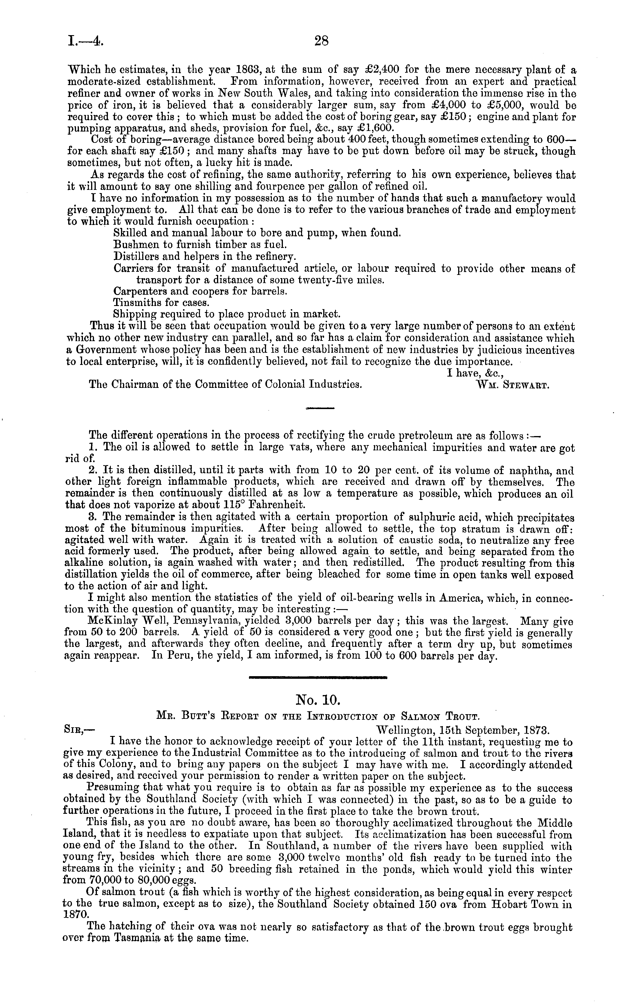 "Which he estimates, in the year 18G3, at the sum of say £2,400 for the mere necessary plant of a moderate-sized establishment. Prom information, however, received from an expert and practical refiner and owner of works in New South Wales, and taking into consideration the immense rise in the price of iron, it is believed that a considerably larger sum, say from £4,000 to £5,000, would be required to cover this ; to which must be added the cost of boring gear, say £150 ; engine and plant for pumping apparatus, and sheds, provision for fuel, &c, say £I,GOO. Cost of boring—average distance bored being about 400 feet, though sometimes extending to GOO— for each shaft say £150 ; and many shafts may have to be put down before oil may be struck, though sometimes, but not often, a lucky hit is made. As regards the cost of refining, the same authority, referring to his own experience, believes that it will amount to say one shilling and fourpence per gallon of refined oil. I have no information in my possession as to the number of hands that such a manufactory would give employment to. All that can be done is to refer to the various branches of trade and employment to which it would furnish occupation : Skilled and manual labour to bore and pump, when found. Bushmen to furnish timber as fuel. Distillers and helpers in the refinery. Carriers for transit of manufactured article, or labour required to provide other means of transport for a distance of some twenty-five miles. Carpenters and coopers for barrels. Tinsmiths for cases. Shipping required to place product in market. Thus it will be seen that occupation would be given to a very large number of persons to an extent which no other new industry can parallel, and so far has a claim for consideration and assistance which a Government whose policy has been and is the establishment of new industries by judicious incentives to local enterprise, will, it is confidently believed, not fail to recognize the due importance. I have, &c, The Chairman of the Committee of Colonial Industries. Wm. Stewabt.