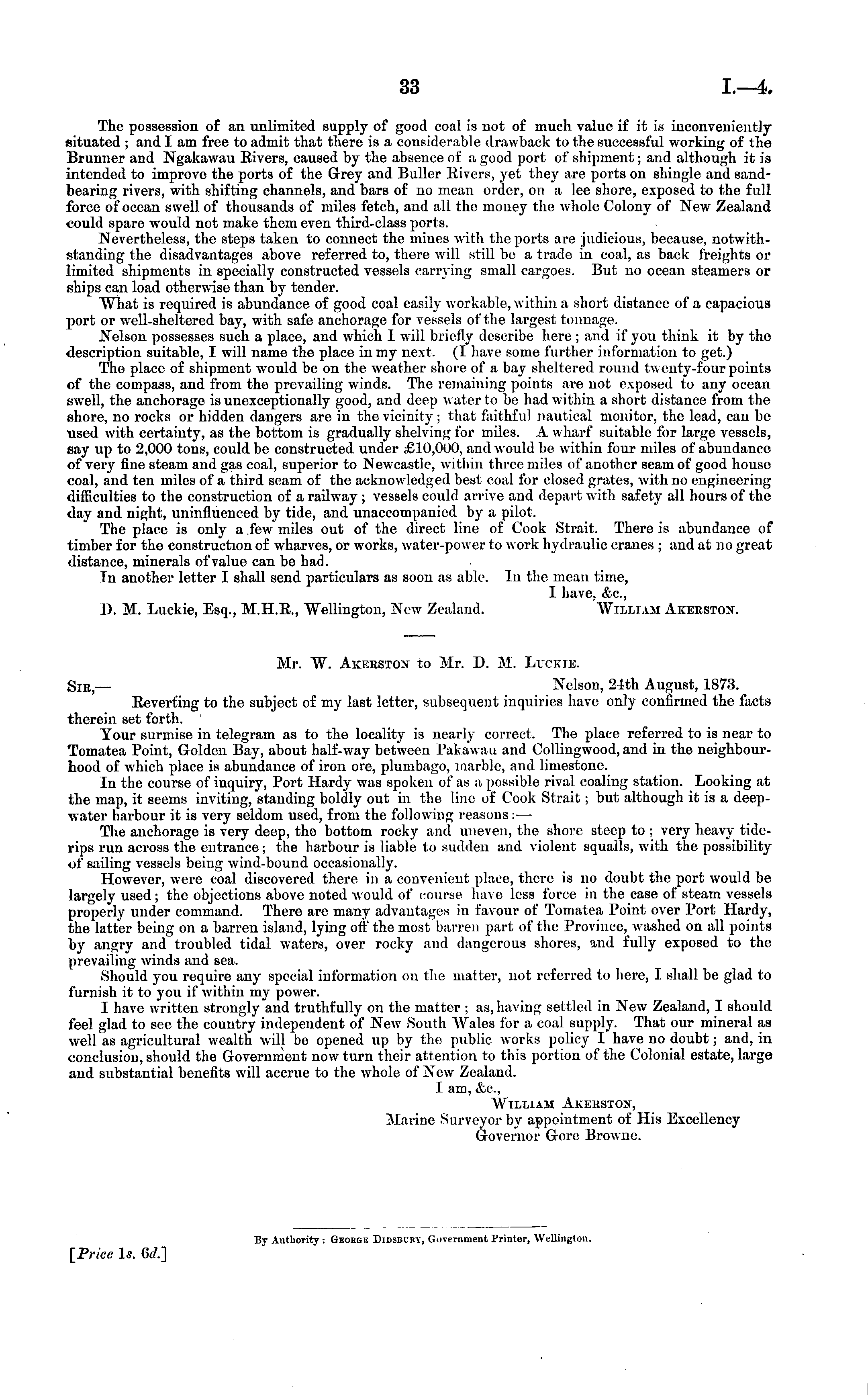 Mr. W. Akeeston to Mr. D. M. Li tckie. Sic,— Nelson, 24th August, 1873. Reverting to the subject of my last letter, subsequent inquiries have only confirmed the facts therein set forth. Your surmise in telegram as to the locality is nearly correct. The place referred to is near to Tomatea Point, Golden Bay, about half-way between Pakawau and Collingwood, and iv the neighbourhood of which place is abundance of iron ore, plumbago, marble, and limestone. In the course of inquiry, Port Hardy was spoken of as a possible rival coaling station. Looking at the map, it seems inviting, standing boldly out in the line of Cook Strait; but although it is a deepwater harbour it is very seldom used, from the following reasons :■ — The anchorage is very deep, the bottom rocky and uneven, the shore steep to ; very heavy tiderips run across the entrance; the harbour is liable to sudden and violent squalls, with the possibility of sailing vessels being wind-bound occasionally. However, were coal discovered there in a convenient place, there is no doubt the port would be largely used ; the objections above noted would of course have less force in the case of steam vessels properly under command. There are many advantages in favour of Tomatea Point over Port Hardy, the latter being on a barren island, lying off the most barren part of the Province, washed on all points by angry and troubled tidal waters, over rocky and dangerous shores, and fully exposed to the prevailing winds and sea. .Should you require any special information on the matter, not referred to here, I shall be glad to furnish it to yovi if within my power. I have written strongly and truthfully on the matter ; as, having settled in New Zealand, I should feel glad to see the country independent of New South "Wales for a coal supply. That our mineral as well as agricultural wealth will be opened up by the public works policy I have no doubt; and, in conclusion, should the Government now turn their attention to this portion of the Colonial estate, large and substantial benefits will accrue to the whole of New Zealand. I am, &c, William Akekstojt, Marine Surveyor by appointment of His Excellency Governor Gore Browne.