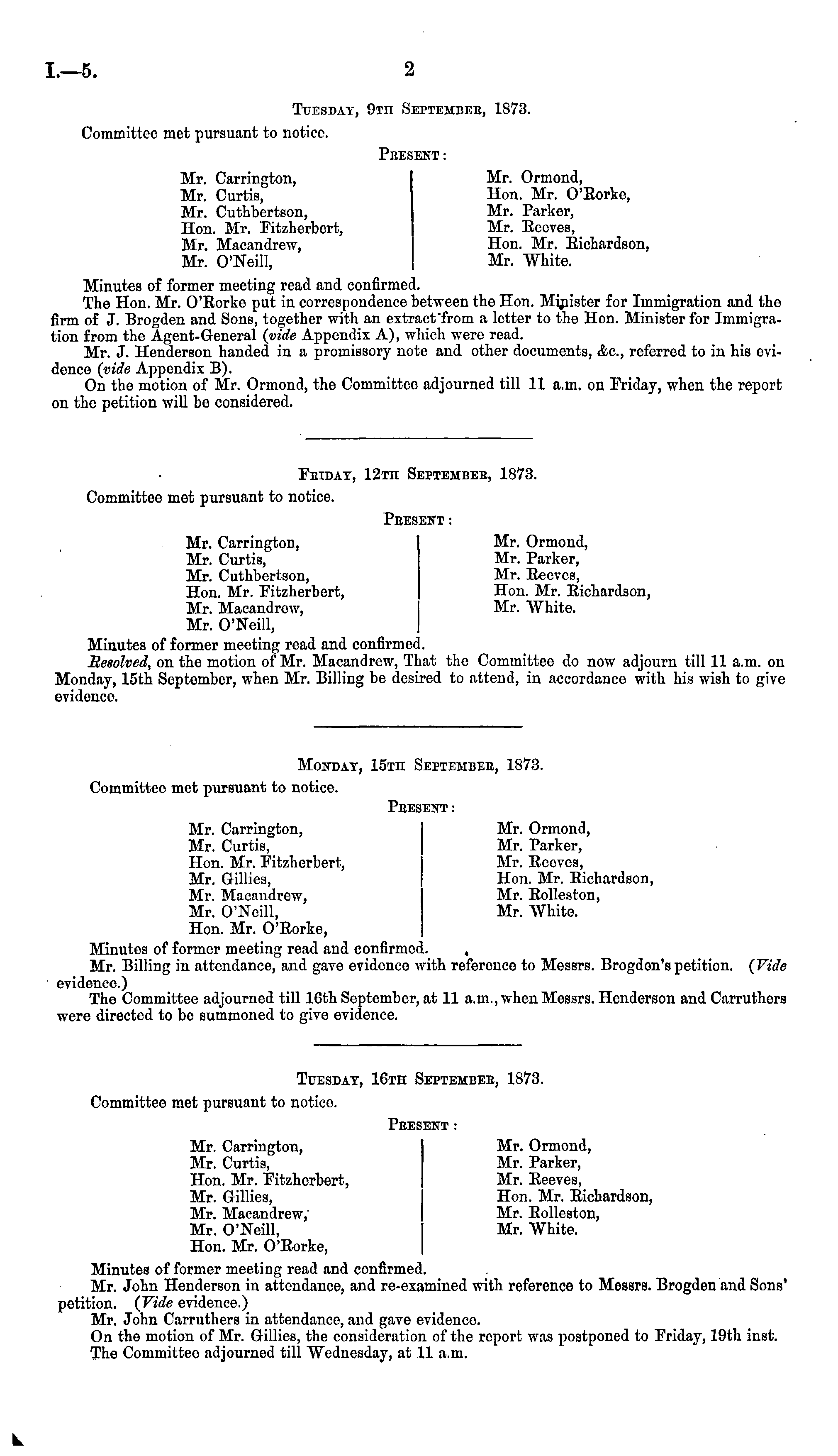 Monday, 15th September, 1873. Committee met pursuant to notice. Peesent: Mr. Carrington, Mr. Ormond, Mr. Curtis, Mr. Parker, Hon. Mr. Fitzhcrbert, Mr. Reeves, Mr. Gillies, Hon. Mr. Richardson, Mr. Macandrew, Mr. Rolleston, Mr. O'Neill, Mr. White. Hon. Mr. O'Rorko, Minutes of former meeting read and confirmed. Mr. Billing in attendance, and gavo cvidonco with referenco to Messrs. Brogdon's petition. (Vide evidence.) The Committee adjourned till 16th September, at 11 a.m., when Messrs. Henderson and Carruthers were directed to be summoned to give evidence.
