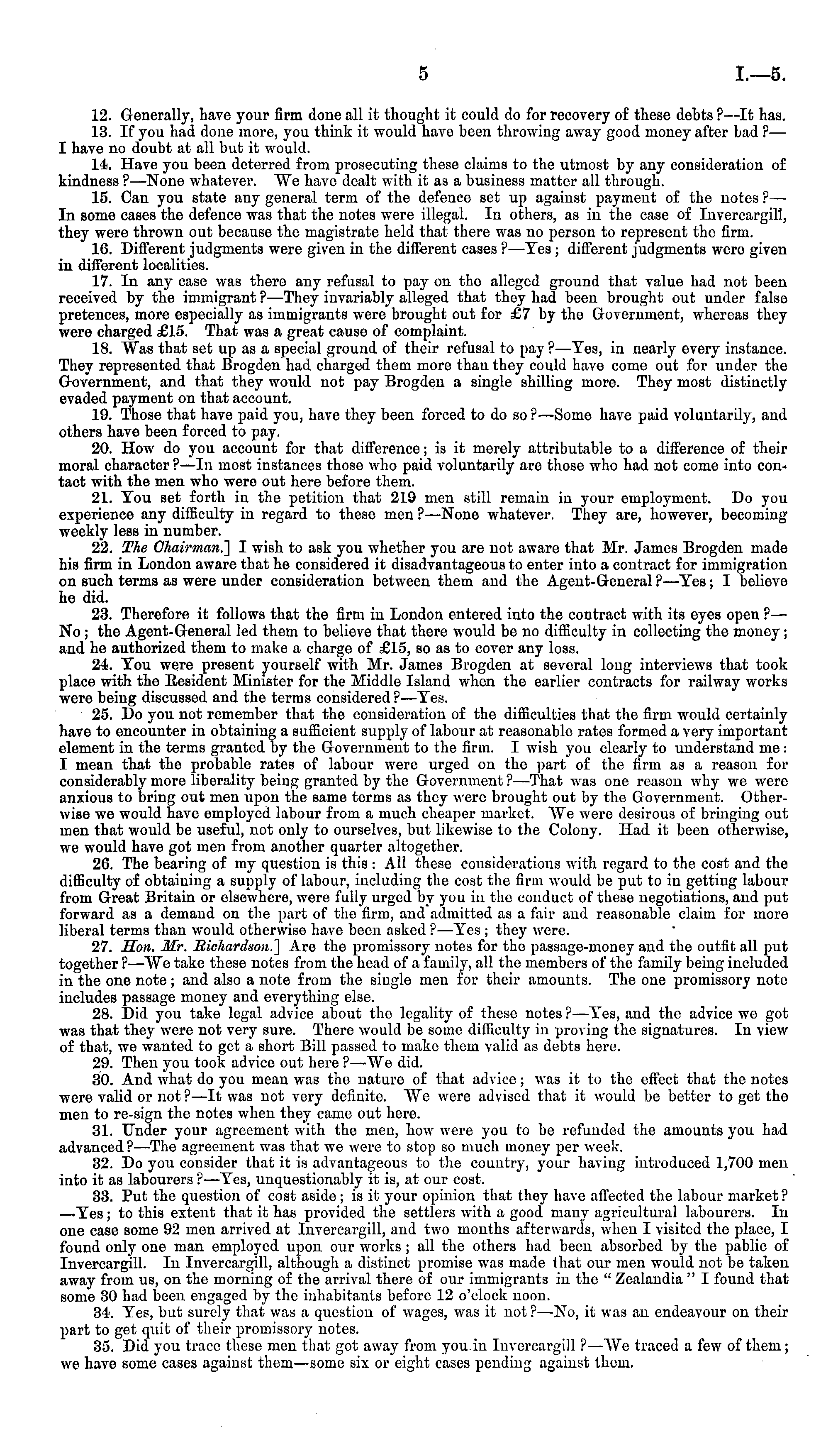 12. Generally, have your firm done all it thought it could do for recovery of these debts ? —lt has. 13. If you had done more, you think it would have been throwing away good money after bad ? — I have no doubt at all but it would. li. Have you been deterred from prosecuting these claims to the utmost by any consideration of kindness ?—None whatever. Wo have dealt with it as a business matter all through. 15. Can you state any general term of the defence set up against payment of the notes ?— In some cases the defence was that the notes were illegal. In others, as in the case of Invercargill, they were thrown out because the magistrate held that there was no person to represent the firm. 16. Different judgments were given in the different cases ? —Yes; different judgments were given in different localities. 17. In any case was there any refusal to pay on the alleged ground that value had not been received by the immigrant ? —They invariably alleged that they had been brought out under false pretences, more especially as immigrants were brought out for £7 by the Government, whereas they were charged £15. That was a great cause of complaint. 18. Was that set up as a special ground of their refusal to pay ? —Yes, in nearly every instance. They represented that Brogden had charged them more than they could have come out for under the Government, and that they would not pay Brogden a single shilling more. They most distinctly evaded payment on that account. 19. Those that have paid you, have they been forced to do so ?—Some have paid voluntarily, and others have been forced to pay. 20. How do you account for that difference; is it merely attributable to a difference of their moral character ? —ln most instances those who paid voluntarily are those who had not come into contact with the men who were out here before them. 21. You set forth in the petition that 219 men still remain in your employment. Do you experience any difficulty in regard to these men ? —None whatever. They are, however, becoming weekly less in number. 22. The Chairman.'] I wish to ask you whether you arc not aware that Mr. James Brogden made his firm in London aware that he considered it disadvantageous to enter into a contract for immigration on such terms as were under consideration between them and the Agent-General?—Yes; I believe he did. 23. Therefore it follows that the firm in London entered into the contract with its eyes open ? — No ; the Agent-General led them to believe that there would bo no difficulty in collecting the money; and he authorized them to make a charge of £15, so as to cover any loss. 2i. You were present yourself with Mr. James Brogden at several long interviews that took place with the Resident Minister for the Middle Island when the earlier contracts for railway works were being discussed and the terms considered ?—Yes. 25. Do you not remember that the consideration of the difficulties that the firm would certainly have to encounter in obtaining a sufficient supply of labour at reasonable rates formed a very important element in the terms granted by the Government to the firm. I wish you clearly to understand me: I mean that the probable rates of labour were urged on the part of the firm as a reason for considerably more liberality being granted by the Government ? —That was one reason why we were anxious to bring out men uj)on the same terms as they were brought out by the Government. Otherwise we would have employed labour from a much cheaper market. Wo were desirous of bringing out men that would be useful, not only to ourselves, but likewise to the Colony. Had it been otherwise, we would have got men from another quarter altogether. 26. The bearing of my question is this : All these considerations with regard to the cost and the difficulty of obtaining a supply of labour, including the cost the firm would be put to in getting labour from Great Britain or elsewhere, were fully urged by you in the conduct of these negotiations, and put forward as a demand on the part of the firm, and admitted as a fair and reasonable claim for more liberal terms than would otherwise have been asked ? —Yes ; they were. 27. Son. Mr. liicJiarchon.] Aro the promissory notes for the passage-money and the outfit all put together ? —We take these notes from the head of a family, all the members of the family being included in the one note; and also a note from the single meu for their amounts. The one promissory note includes passage money and everything else. 28. Did you take legal advice about the legality of these notes ?—Yes, and the advice we got was that they were not very sure. There would be some difficulty in proving the signatures. In view of that, we wanted to get a short Bill passed to make them valid as debts here. 29. Then you took advice out here ? —We did. 30. And what do you mean was the nature of that advice; was it to the effect that the notes were valid or not ? —lt was not very definite. We were advised that it would be better to get the men to re-sign the notes when they came out here. 31. Under your agreement with the men, how were you to be refunded the amounts you had advanced? —The agreement was that we were to stop so much money per week. 32. Do you consider that it is advantageous to the country, your having introduced 1,700 men into it as labourers ?—Yes, unquestionably it is, at our cost. 33. Put the question of cost aside ; is it your opinion that they have affected the labour market? —'Yes; to this extent that it has provided the settlers with a good many agricultural labourers. In one case some 92 men arrived at Invercargill, and two months afterwards, when I visited the place, I found only one man employed upon our works; all the others had been absorbed by the pablic of Invercargill. In Invercargill, although a distinct promise was made that our men would not be taken away from us, on the morning of the arrival there of our immigrants 