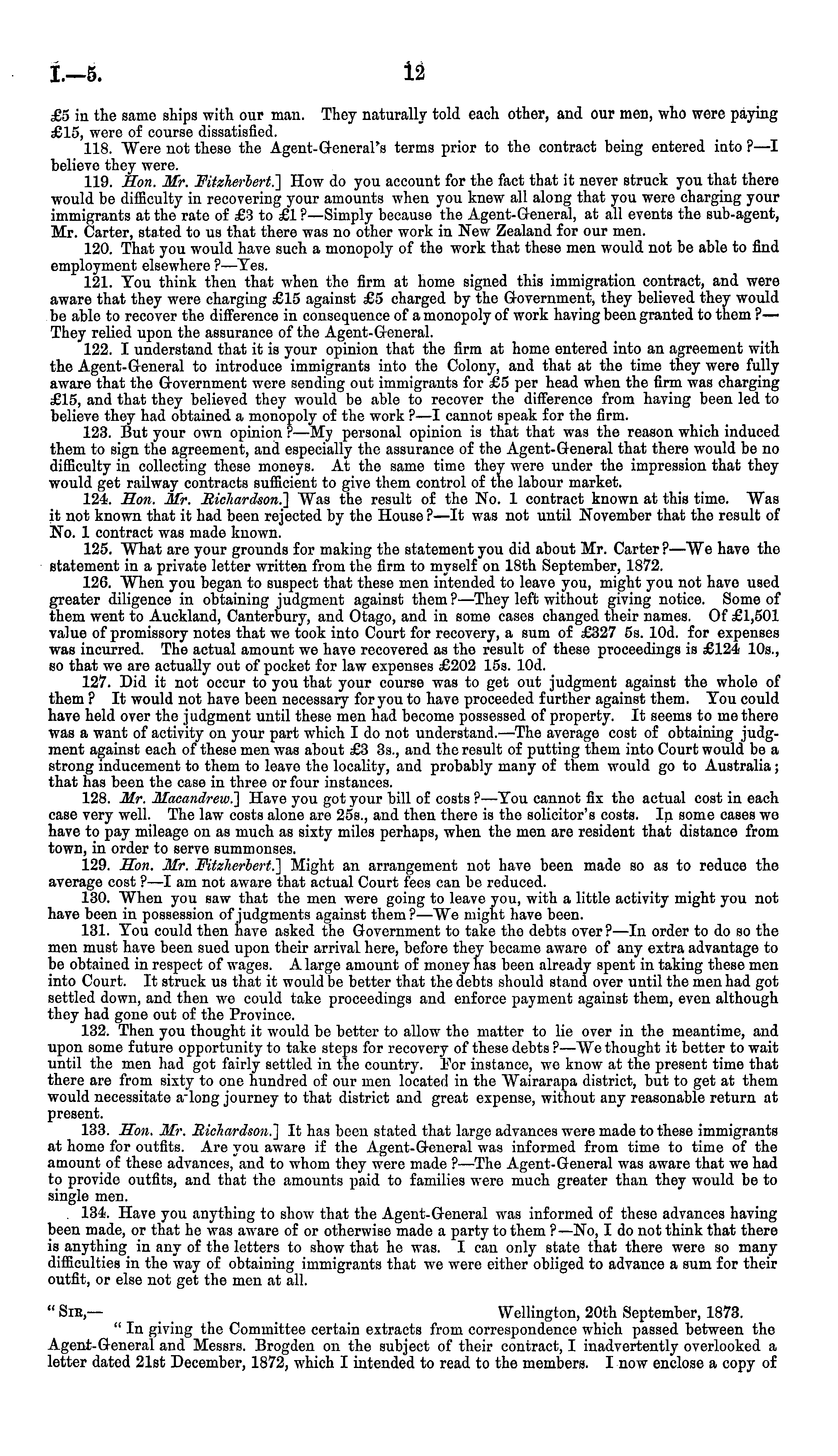 £5 in the same ships with our man. They naturally told each other, and our men, who were paying £15, were of course dissatisfied. 118. Were not these the Agent-General's terms prior to the contract being entered into ? —I believe they were. 119. Hon. Mr. Fitxherbert.] How do you account for the fact that it never struck you that there would be difficulty in recovering your amounts when you knew all along that you were charging your immigrants at the rate of £3 to £1 ?—Simply because the Agent-General, at all events the sub-agent, Mr. Carter, stated to us that there was no other work in New Zealand for our men. 120. That you would have such a monopoly of the work that these men would not be able to find employment elsewhere ? —Tes. 121. You think then that when the firm at home signed this immigration contract, and were aware that they were charging £15 against £5 charged by the Government, they believed they would be able to recover the difference in consequence of a monopoly of work having been granted to them ? — They relied upon the assurance of the Agent-General. 122. I understand that it is your opinion that the firm at home entered into an agreement with the Agent-General to introduce immigrants into the Colony, and that at the time they were fully aware that the Government were sending out immigrants for £5 per head when the firm was charging £15, and that they believed they would be able to recover the difference from having been led to believe they had obtained a monopoly of the work ?—I cannot speak for the firm. 123. But your own opinion ?—My personal opinion is that that was the reason which induced them to sign the agreement, and especially the assurance of the Agent-General that there would be no difficulty in collecting these moneys. At the same time they were under the impression that they would get railway contracts sufficient to give them control of the labour market. 124. Hon. Mr. Richardson.] Was the result of the No. 1 contract known at this time. Was it not known that it had been rejected by the House ?—lt was not until November that the result of No. 1 contract was made known. 125. What are your grounds for making tho statement you did about Mr. Carter?—We have the statement in a private letter written from the firm to myself on 18th September, 1872. 126. When you began to suspect that these men intended to leave you, might you not have used greater diligence in obtaining judgment against them ? —They left without giving notice. Some of them went to Auckland, Canterbury, and Otago, and in some cases changed their names. Of £1,501 value of promissory notes that we took into Court for recovery, a sum of £327 ss. lOd. for expenses was incurred. The actual amount we have recovered as the result of these proceedings is £124 10s., so that we are actually out of pocket for law expenses £202 15s. lOd. 127. Did it not occur to you that your course was to get out judgment against the whole of them ? It would not have been necessary for you to have proceeded further against them. Tou could have held over the judgment until these men had become possessed of property. It seems to me there was a want of activity on your part which I do not understand. —The average cost of obtaining judgment against each of these men was about £3 35., and the result of putting them into Court would bo a strong inducement to them to leave the locality, and probably many of them would go to Australia; that has been the case in three or four instances. 128. Mr. Macandrew.~\ Have you got your bill of costs ? —Tou cannot fix the actual cost in each case very well. The law costs alone are 255., and then there is the solicitor's costs. In some cases we have to pay mileage on as much as sixty miles perhaps, when the men are resident that distance from town, in order to serve summonses. 129. Hon. Mr. ffltzlierbert.] Might an arrangement not have been made so as to reduce the average cost ? —I am not aware that actual Court fees can bo reduced. 130. When you saw that the men were going to leave you, with a little activity might you not have been in possession of judgments against them? —We might have been. 131. Tou could then have asked the Government to take the debts over? —In order to do so the men must have been sued upon their arrival here, before they became aware of any extra advantage to be obtained in respect of wages. A large amount of money has been already spent in taking these men into Court. It struck us that it would bo better that the debts should stand over until the men had got settled down, and then we could take proceedings and enforce payment against them, even although they had gone out of the Province. 132. Then you thought it would be better to allow the matter to lie over in the meantime, and upon some future opportunity to take steps for recovery of these debts ?—We thought it better to wait until the men had got fairly settled in the country. For instance, we know at the present time that there are from sixty to one hundred of our men located in the Wairarapa district, but to get at them would necessitate along journey to that district and great expense, without any reasonable return at present. 133. Hon. Mr. Rieliardson.~\ It has been stated that large advances were made to these immigrants at home for outfits. Are you aware if the Agent-General was informed from time to time of the amount of these advances, and to whom they were made ? —The Agent-General was aware that we had to provide outfits, and that the amounts paid to families were much greater than they would be to single men. . 134. Have you anything to show that the Agent-General was informed of these advances having been made, or that he was aware of or otherwise made a party to them ?—No, I do not think that there is anything in any of the letters to show that he was. I can only state that there were so many difficulties in the way of obtaining immigrants that we were ei
