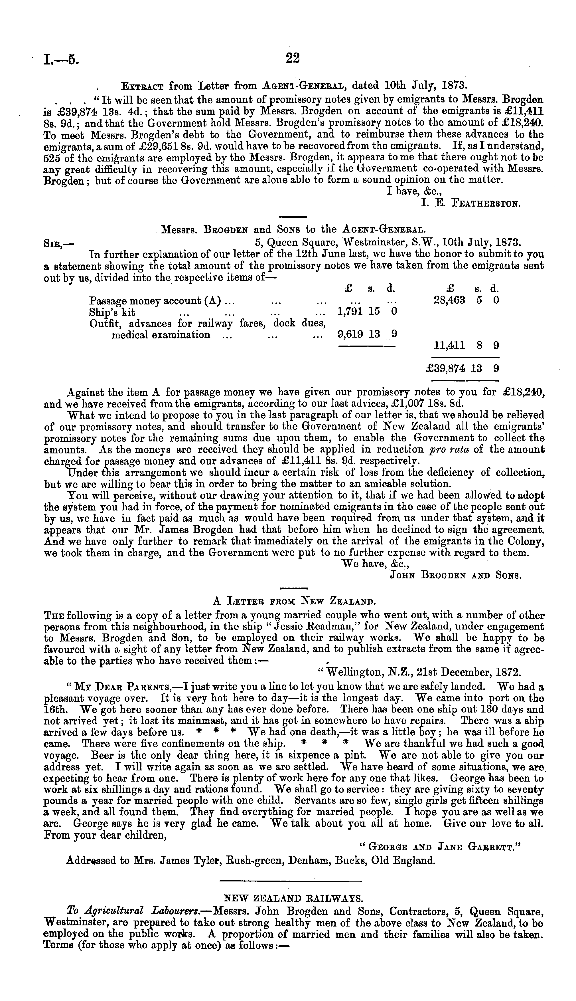 Extbact from Letter from Ageni-General, dated 10th July, 1873. . . . "It will be seen that the amount of promissory notes given by emigrants to Messrs. Brogden is £39,874 13s. 4d.; that the sum paid by Messrs. Brogden on account of the emigrants is £11,411 Bs. 9d.; and that the Government hold Messrs. Brogden's promissory notes to the amount of £18,240. To meet Messrs. Brogdon's debt to the Government, and to reimburse them these advances to the emigrants, a sum of £29,651 Bs. 9d. would have to be recovered from the emigrants. If, as I understand, 525 of the emigrants are employed by the Messrs. Brogden, it appears to me that there ought not to be any great difficulty in recovering this amount, especially if the Government co-operated with Messrs. Brogden; but of course the Government are alone able to form a sound opinion on the matter. I have, &c, I. E. Feathebston. Messrs. Brogden and Soys to the Agent-General. Sib,— 5, Queen Square, Westminster, S.W., 10th July, 1873. In further explanation of our letter of the 12th June last, we have the honor to submit to you a statement showing the total amount of the promissory notes we have taken from the emigrants sent out by us, divided into the respective items of— £ s. d. £ s. d. Passage money account (A) ... ... ... ... ... 28,463 5 0 Ship's kit ... ... ... ... 1,791 15 0 Outfit, advances for railway fares, dock dues, medical examination ... ... ... 9,019 13 9 -— 11,411 8 9 £39,874 13 9 Against the item A for passage money we have given our promissory notes to you for £18,240, and we have received from the emigrants, according to our last advices, £1,007 18s. Bd. What we intend to propose to you in the last paragraph of our letter is, that we should be relieved of our promissory notes, and should transfer to the G-overnment of New Zealand all the emigrants' promissory notes for the remaining sums due upon them, to enable the Government to collect the amounts. As the moneys are received they should be applied in reduction pro rata of the amount charged for passage money and our advances of £11,411 Bs. 9d. respectively. Under this arrangement we should incur a certain risk of loss from the deficiency of collection, but we are willing to bear this in order to bring the matter to an amicable solution. You will perceive, without our drawing your attention to it, that if we had been allowed to adopt the system you had in force, of the payment for nominated emigrants in the case of the people sent out by us, we have in fact paid as much as would have been required from us under that system, and it appears that our Mr. James Brogden had that before him when he declined to sign the agreement. And we have only further to remark that immediately on the arrival of the emigrants in the Colony, we took them in charge, and the Government were put to no further expense with regard to them. We have, &c, John Beogden and Sons. A Lettee from New Zealand. The following is a copy of a letter from a young married couple who went out, with a number of other persons from this neighbourhood, in the ship "Jessie Headman," for New Zealand, under engagement to Messrs. Brogden and Son, to be employed on their railway works. We shall bo happy to be favoured with a sight of any letter from New Zealand, and to publish extracts from the same if agreeable to the parties who have received them:— " Wellington, N.Z., 21st December, 1572. "Mr Deae Paeents, —I just write you a line to let you know that we are safely landed. We had a pleasant voyage over. It is very hot here to day —it is the longest day. We came into port on the 16th. We got here sooner than any has ever done before. There has been one ship out 130 days and not arrived yet; it lost its mainmast, and it has got in somewhere to have repairs. There was a ship arrived a few days before us. # * * We had one death, —it was a little boy; he was ill before he came. There were five confinements on the ship. * * * We are thankful we had such a good voyage. Beer is the only dear thing here, it is sixpence a pint. We are not able to give you our address yet. I will write again as soon as we are settled. We have heard of some situations, we are expecting to hear from one. There is plenty of work here for any one that likes. George has been to work at six shillings a day and rations found. We shall go to service : they are giving sixty to seventy pounds a year for married people with one child. Servants are so few, single girls get fifteen shillings a week, and all found them. They find everything for married people. I hope you are as well as we are. George says he is very glad he came. We talk about you all at home. Give our love to all. Prom your dear children, " Geoege and Jane Gaekett." Addressed to Mrs. James Tyler, Eush-green, Denham, Bucks, Old England. NEW ZEALAND RAILWAYS. To Agricultural Labourers. —Messrs. John Brogden and Sons, Contractors, 5, Queen Square, Westminster, are prepared to take out strong healthy men of the above class to New Zealand, to be employed on the public works. A proportion of married men and their families will also be taken. Terms (for those who apply at once) as follows: —