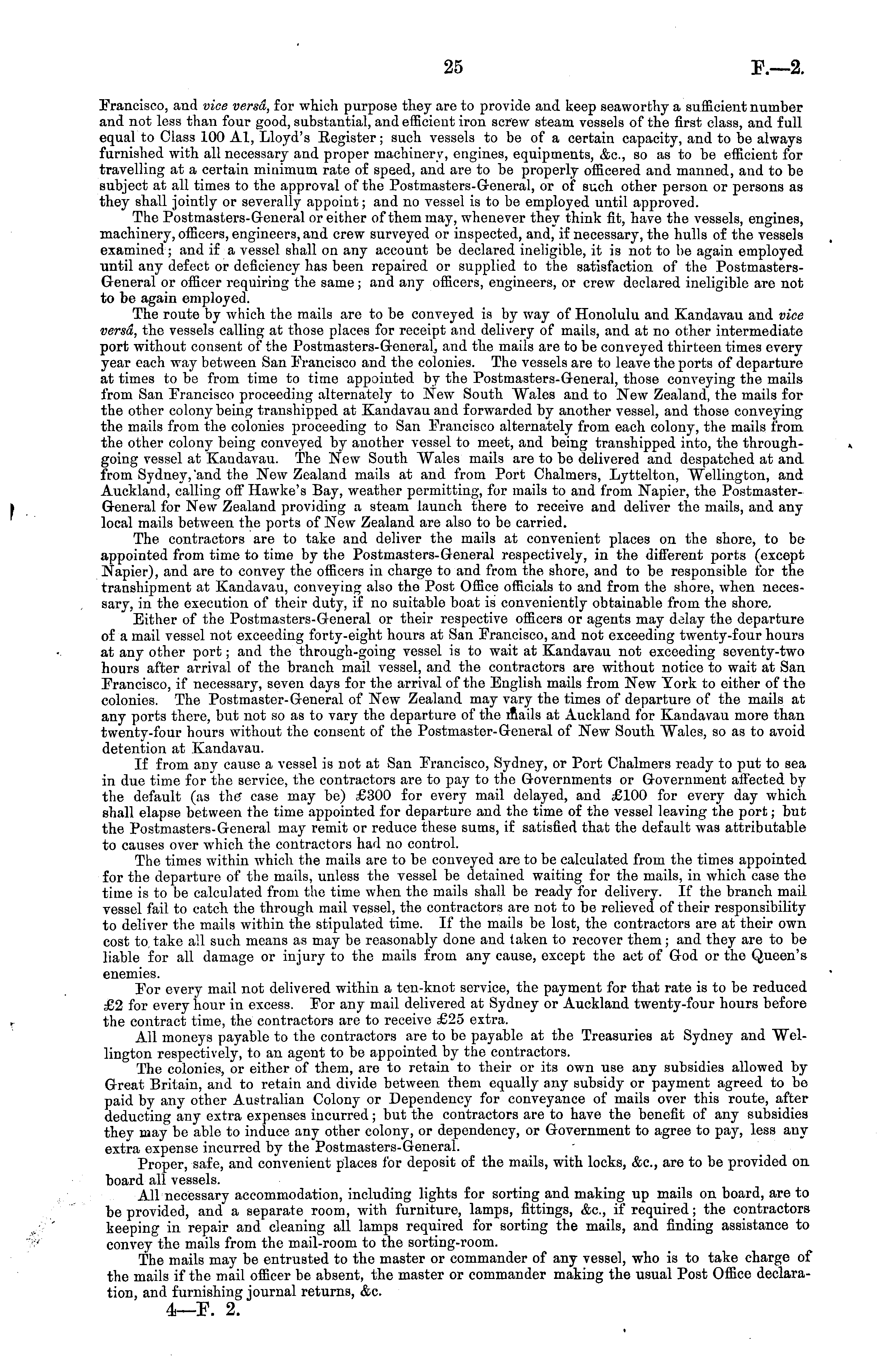 [Francisco, and vice versa, for which purpose they are to provide and keep seaworthy a sufficient number and not less than four good, substantial, and efficient iron screw steam vessels of the first class, and full equal to Class 100 Al, Lloyd's Eegister; such vessels to be of a certain capacity, and to be always furnished with all necessary and proper machinery, engines, equipments, &c, so as to be efficient for travelling at a certain minimum rate of speed, and are to be properly officered and manned, and to be subject at all times to the approval of the Postmasters-General, or of such other person or persons as they shall jointly or severally appoint; and no vessel is to be employed until approved. The Postmasters-General or either of them may, whenever they think fit, have the vessels, engines, machinery, officers, engineers, and crew surveyed or inspected, and, if necessary, the hulls of the vessels examined; and if a vessel shall on any account be declared ineligible, it is not to be again employed until any defect or deficiency has been repaired or supplied to the satisfaction of the PostmastersGeneral or officer requiring the same; and any officers, engineers, or crew declared ineligible are not to be again employed. The route by which the mails are to be conveyed is by way of Honolulu and Kandavau and vice versa, the vessels calling at those places for receipt and delivery of mails, and at no other intermediate port without consent of the Postmasters-General, and the mails are to be conveyed thirteen times every year each way between San Francisco and the colonies. The vessels are to leave the ports of departure at times to be from time to time appointed by the Postmasters-General, those conveying the mails from San Francisco proceeding alternately to New South Wales and to New Zealand, the mails for the other colony being transhipped at Kandavau and forwarded by another vessel, and those conveying the mails from the colonies proceeding to San Francisco alternately from each colony, the mails from, the other colony being conveyed by another vessel to meet, and being transhipped into, the throughgoing vessel at Kandavau. The New South Wales mails are to be delivered and despatched at and. from Sydney, and the New Zealand mails at and from Port Chalmers, Lyttelton, Wellington, and Auckland, calling off Hawke's Bay, weather permitting, for mails to and from Napier, the PostmasterGeneral for New Zealand providing a steam launch there to receive and deliver the mails, and any local mails between the ports of New Zealand are also to be carried. The contractors are to take and deliver the mails at convenient places on the shore, to be appointed from time to time by the Postmasters-General respectively, in the different ports (except Napier), and are to convey the officers in charge to and from the shore, and to be responsible for the transhipment at Kandavau, conveying also the Post Office officials to and from the shore, when necessary, in the execution of their duty, if no suitable boat is conveniently obtainable from the shore. Either of the Postmasters-General or their respective officers or agents may delay the departure of a mail vessel not exceeding forty-eight hours at San Francisco, and not exceeding twenty-four hours at any other port; and the through-going vessel is to wait at Kandavau not exceeding seventy-two hours after arrival of the branch mail vessel, and the contractors are without notice to wait at San Francisco, if necessary, seven days for the arrival of the English mails from New York to either of the colonies. The Postmaster-General of New Zealand may vary the times of departure of the mails at any ports there, but not so as to vary the departure of the mails at Auckland for Kandavau more than twenty-four hours without the consent of the Postmaster-General of New South Wales, so as to avoid detention at Kandavau. If from any cause a vessel is not at San Francisco, Sydney, or Port Chalmers ready to put to sea in due time for "the service, the contractors are to pay to the Governments or Government affected by the default (as the case may be) £300 for every mail delayed, and £100 for every day which shall elapse between the time appointed for departure and the time of the vessel leaving the port; but the Postmasters-General may remit or reduce these sums, if satisfied, that the default was attributable to causes over which the contractors had no control. The times within which the mails are to be conveyed are to be calculated from the times appointed for the departure of the mails, unless the vessel be detained waiting for the mails, in which case the time is to be calculated from the time when the mails shall be ready for delivery. If the branch mail vessel fail to catch the through mail vessel, the contractors are not to be relieved of their responsibility to deliver the mails within the stipulated time. If the mails be lost, the contractors are at their own cost to take all such means as may be reasonably done and taken to recover them; and they are to be liable for all damage or injury to the mails from any cause, except the act of God or the Queen's enemies. For every mail not delivered within a ten-knot service, the payment for that rate is to be reduced £2 for every hour in excess. For any mail delivered at Sydney or Auckland twenty-four hours before the contract time, the contractors are to receive £25 extra. All moneys payable to the contractors are to be payable at the Treasuries at Sydney and Wellington respectively, to an agent to be appointed by the contractors. The colonies, or either of them, are to retain to their or its own use any subsidies allowed by Great Britain, and to retain and divide between them equally any subsidy or payment agreed to be paid by any other Australian Colony or Dependency for conveyance of mails over this route, after deducting any extra expenses incurred; but the contractors are to have the benefit of any subsidies the