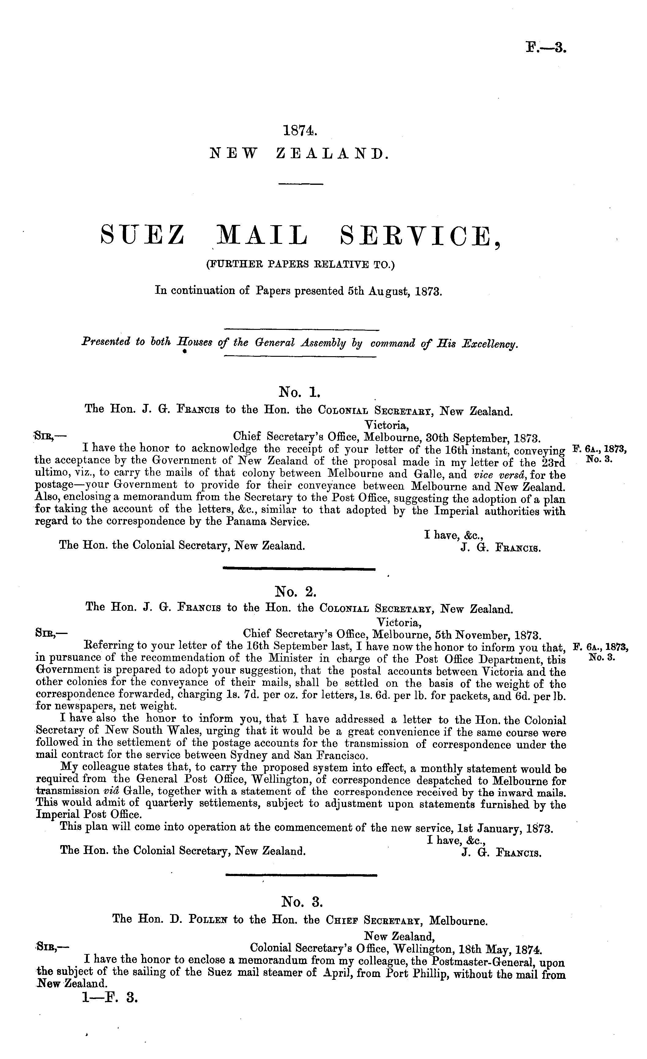 No. 1. The Hon. J. G. Fbancis to the Hon. the Colonial Seceetaet, New Zealand. Victoria, Sib, — Chief Secretary's Office, Melbourne, 30th September, 1873. I have the honor to acknowledge the receipt of your letter of the 16th instant, conveying the acceptance by the Government of New Zealand of the proposal made in my letter of the 23rd ultimo, viz., to carry the mails of that colony between Melbourne and Galle, and vice versa, for the postage—your Government to provide for their conveyance between Melbourne and New Zealand. Also, enclosing a memorandum from the Secretary to the Post Office, suggesting the adoption of a plan for taking the account of the letters, &c, similar to that adopted by the Imperial authorities with regard to the correspondence by the Panama Service. I have, &c, The Hon. the Colonial Secretary, New Zealand. J. G. Feancis.
