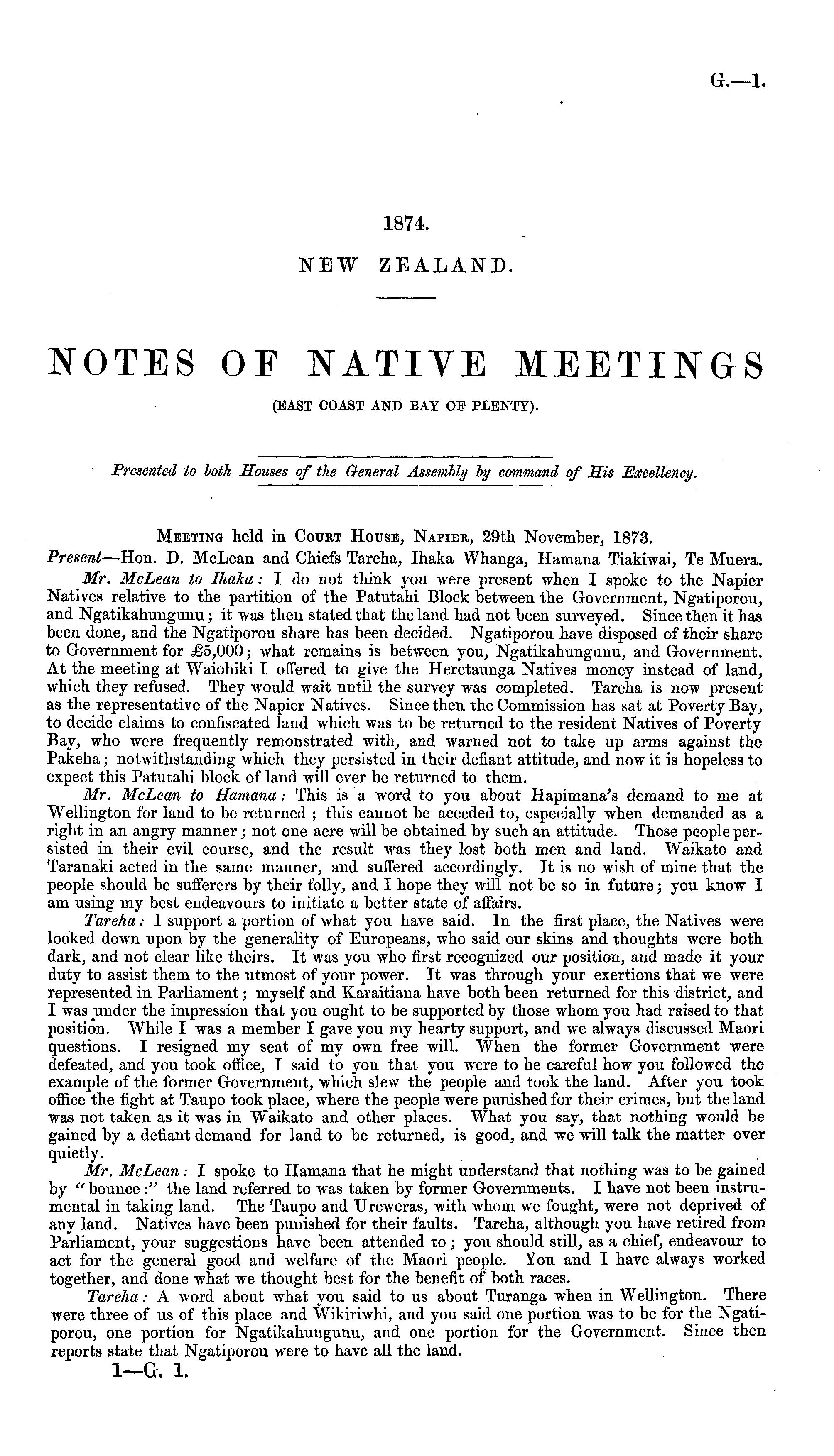 Meeting held in Court House, Napier, 29th November, 1873. Present —Hon. D. McLean and Chiefs Tareha, Ihaka Whanga, Hamana Tiakiwai, Te Muera. Mr. McLean to Ihaka : I do not think you were present when I spoke to the Napier Natives relative to the partition of the Patutahi Block between the Government, Ngatiporou, and Ngatikahungunu ; it was then stated that the land had not been surveyed. Since then it has been done, and the Ngatiporou share has been decided. Ngatiporou have disposed of their share to Government for £5,000; what remains is between you, Ngatikahungunu, and Government. At the meeting at Waiohiki I offered to give the Heretaunga Natives money instead of land, which they refused. They would wait until the survey was completed. Tareha is now present as the representative of the Napier Natives. Since then the Commission has sat at Poverty Bay, to decide claims to confiscated land which was to be returned to the resident Natives of Poverty Bay, who were frequently remonstrated with, and warned not to take up arms against the Pakeha; notwithstanding which they persisted in their defiant attitude, and now it is hopeless to expect this Patutahi block of land will ever be returned to them. Mr. McLean to Hamana : This is a word to you about Hapimana's demand to me at Wellington for land to be returned ; this cannot be acceded to, especially when demanded as a right in an angry manner; not one acre will be obtained by such an attitude. Those people persisted in their evil course, and the result was they lost both men and land. Waikato and Taranaki acted in the same manner, and suffered accordingly. It is no wish of mine that the people should be sufferers by their folly, and I hope they will not be so in future; you know I am using my best endeavours to initiate a better state of affairs. Tareha: I support a portion of what you have said. In the first place, the Natives were looked down upon by the generality of Europeans, who said our skins and thoughts were both dark, and not clear like theirs. It was you who first recognized our position, and made it your duty to assist them to the utmost of your power. It was through your exertions that we were represented in Parliament; myself and Karaitiana have both been returned for this district, and I was under the impression that you ought to be supported by those whom you had raised to that position. While I was a member I gave you my hearty support, and we always discussed Maori questions. I resigned my scat of my own free will. When the former Government were defeated, and you took office, I said to you that you were to be careful how you followed the example of the former Government, which slew the people and took the land. After you took office the fight at Taupo took place, where the people were punished for their crimes, but the land was not taken as it was in Waikato and other places. What you say, that nothing would be gained by a defiant demand for land to be returned, is good, and we will talk the matter over quietly. Mr. McLean: I spoke to Hamana that he might understand that nothing was to be gained by " bounce :" the land referred to was taken by former Governments. I have not been instrumental in taking land. The Taupo and Ureweras, with whom we fought, were not deprived of any land. Natives have been punished for their faults. Tareha, although you have retired from Parliament, your suggestions have been attended to; you should still, as a chief, endeavour to act for the general good and welfare of the Maori people. You and I have always worked together, and done what we thought best for the benefit of both races. Tareha: A word about what you said to us about Turanga when in Wellington. There were three of us of this place and Wikiriwhi, and you said one portion was to be for the Ngatiporou, one portion for Ngatikahungunu, and one portion for the Government. Since then reports state that Ngatiporou were to have all the land. I—G. 1.