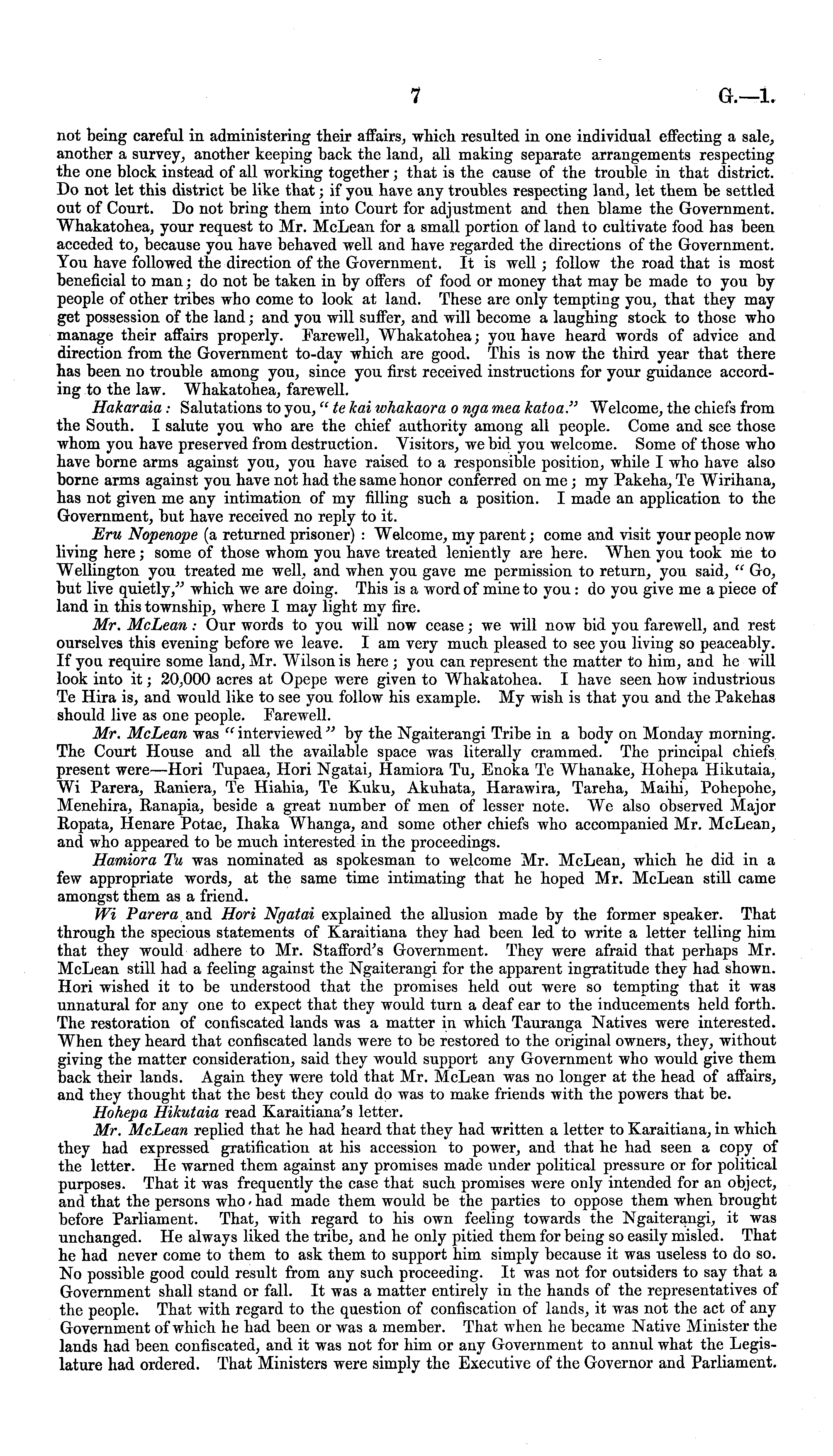 not being careful in administering their affairs, which resulted in one individual effecting a sale, another a survey, another keeping back the land, all making separate arrangements respecting the one block instead of all working together; that is the cause of the trouble in that district. Do not let this district be like that ; if you have any troubles respecting land, let them be settled out of Court. Do not bring them into Court for adjustment and then blame the Government. Whakatohea, your request to Mr. McLean for a small portion of land to cultivate food has been acceded to, because you have behaved well and have regarded the directions of the Government. You have followed the direction of the Government. It is well; follow the road that is most beneficial to man; do not be taken in by offers of food or money that may be made to you by people of other tribes who come to look at land. These are only tempting you, that they may get possession of the land; and you will suffer, and will become a laughing stock to those who manage their affairs properly. Farewell, Whakatohea; you have heard words of advice and direction from the Government to-day which are good. This is now the third year that there has been no trouble among you, since you first received instructions for your guidance according to the law. Whakatohea, farewell.