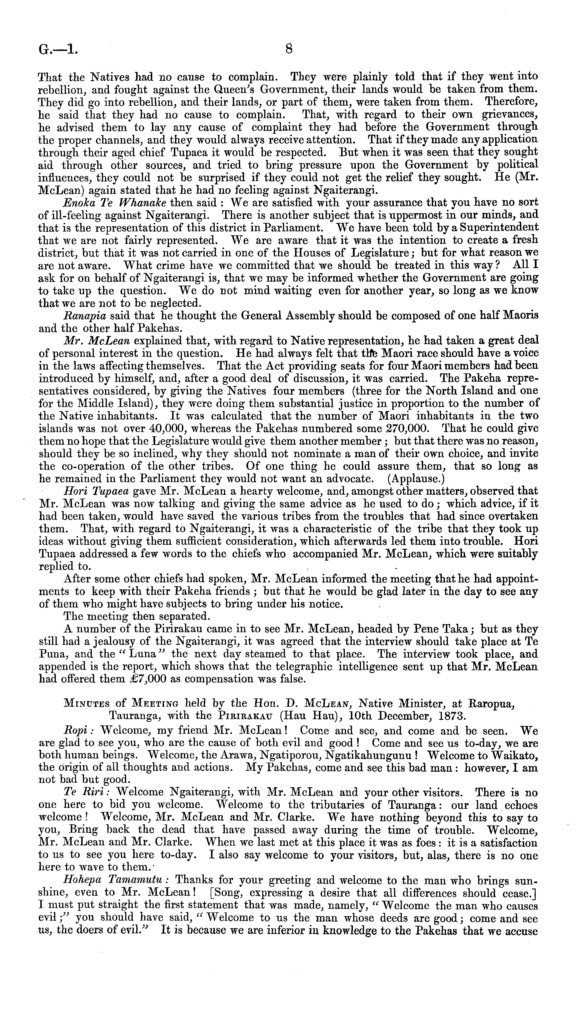 That the Natives had no cause to complain. They were plainly told that if they went into rebellion, and fought against the Queen's Government, their lands would be taken from them. They did go into rebellion, and their lands, or part of them, were taken from them. Therefore, he said that they had no cause to complain. That, with regard to their own grievances, he advised them to lay any cause of complaint they had before the Government through the proper channels, and they would always receive attention. That if they made any application through their aged chief Tupaea it would be respected. But when it was seen that they sought aid through other sources, and tried to bring pressure upon the Government by political influences, they could not be surprised if they could not get the relief they sought. He (Mr. McLean) again stated that he had no feeling against Ngaiterangi. Enoka Te Whanake then said : We are satisfied with your assurance that you have no sort of ill-feeling against Ngaiterangi. There is another subject that is uppermost in our minds, and that is the representation of this district in Parliament. We have been told by a Superintendent that we are not fairly represented. We are aware that it was the intention to create a fresh district, but that it was not carried in one of the Houses of Legislature ; but for what reason we are not aware. What crime have we committed that we should be treated in this way ? All I ask for on behalf of Ngaiterangi is, that we may be informed whether the Government are going to take up the question. We do not mind waiting even for another year, so long as we know that we are not to be neglected. Ranapia said that he thought the General Assembly should be composed of one half Maoris and the other half Pakehas. Mr. McLean explained that, with regard to Native representation, he had taken a great deal of personal interest in the question. He had always felt that the Maori race should have a voice in the laws affecting themselves. That the Act providing seats for four Maori members had been introduced by himself, and, after a good deal of discussion, it was carried. The Pakeha representatives considered, by giving the Natives four members (three for the North Island and one for the Middle Island), they were doing them substantial justice in proportion to the number of the Native inhabitants. It was calculated that the number of Maori inhabitants in the two islands was not over 40,000, whereas the Pakehas numbered some 270,000. That he could give them no hope that the Legislature would give them another member; but that there was no reason, should they be so inclined, why they should not nominate a man of their own choice, and invite the co-operation of the other tribes. Of one thing he could assure them, that so long as he remained in the Parliament they would not want an advocate. (Applause.) Hori Tupaea gave Mr. McLean a hearty welcome, and, amongst other matters, observed that Mr. McLean was now talking and giving the same advice as he used to do; which advice, if it had been taken, would have saved the various tribes from the troubles that had since overtaken them. That, with regard to Ngaiterangi, it was a characteristic of the tribe that they took up ideas without giving them sufficient consideration, which afterwards led them into trouble. Hori Tupaea addressed a few words to the chiefs who accompanied Mr. McLean, which were suitably replied to. After some other chiefs had spoken, Mr. McLean informed the meeting that he had appointments to keep with their Pakeha friends ; but that he would be glad later in the day to see any of them who might have subjects to bring under his notice. The meeting then separated. A number of the Pirirakau came in to see Mr. McLean, headed by Pene Taka; but as they still had a jealousy of the Ngaiterangi, it was agreed that the interview should take place at Te Puna, and the "Luna" the next day steamed to that place. The interview took place, and appended is the report, which shows that the telegraphic intelligence sent up that Mr. McLean had offered them £7,000 as compensation was false. Minutes of Meeting held by the Hon. D. McLean, Native Minister, at Raropua, Tauranga, with the Pirirakau (Hau Hau), 10th December, 1873. Ropi: Welcome, my friend Mr. McLean! Come and see, and come and be seen. We are glad to see you, who are the cause of both evil and good ! Come and see us to-day, we are both human beings. Welcome, the Arawa, Ngatiporou, Ngatikahungunu ! Welcome to Waikato, the origin of all thoughts and actions. My Pakehas, come and see this bad man : however, lam not bad but good. Te Riri: Welcome Ngaiterangi, with Mr. McLean and your other visitors. There is no one here to bid you welcome. Welcome to the tributaries of Tauranga: our land echoes welcome ! Welcome, Mr. McLean and Mr. Clarke. We have nothing beyond this to say to you, Bring back the dead that have passed away during the time of trouble. Welcome, Mr. McLean and Mr. Clarke. When we last met at this place it was as foes : it is a satisfaction to us to see you here to-day. I also say welcome to your visitors, but, alas, there is no one here to wave to them." Hohepa Tamamutu : Thanks for your greeting and welcome to the man who brings sunshine, even to Mr. McLean! [Song, expressing a desire that all differences should cease.] I must put straight the first statement that was made, namely, " Welcome the man who causes evil ;" you should have said, " Welcome to us the man whose deeds are good; come and see us, the doers of evil.' I It is because we are inferior in knowledge to the Pakehas that we accuse