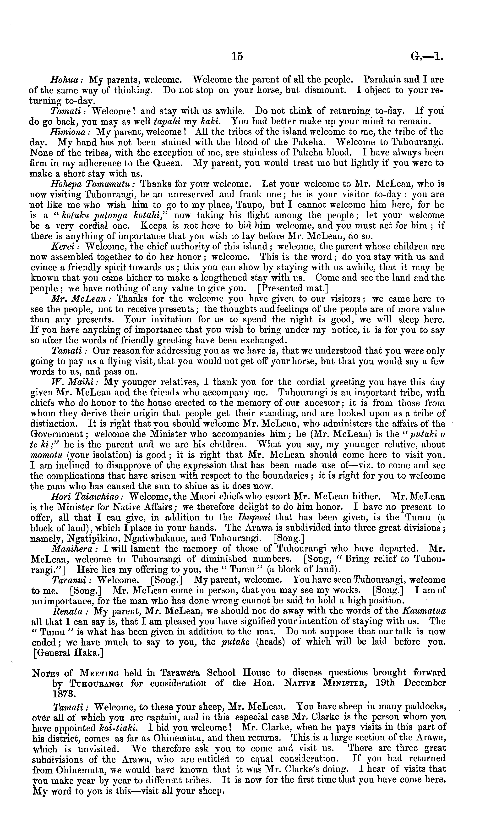 Hohua: My parents, welcome. Welcome the parent of all the people. Parakaia and I are of the same way of thinking. Do not stop on your horse, but dismount. I object to your returning to-day. Tamati: Welcome ! and stay with us awhile. Do not think of returning to-day. If you do go back, you may as well tapahi my kaki. You had better make up your mind to remain. Himiona : My parent, welcome ! All the tribes of the island welcome to me, the tribe of the day. My hand has not been stained with the blood of the Pakeha. Welcome to Tuhourangi. None of the tribes, with the exception of me, are stainless of Pakeha blood. I have always been firm in my adherence to the Queen. My parent, you would treat me but lightly if you were to make a short stay with us. Hohepa Tamamutu: Thanks for your welcome. Let your welcome to Mr. McLean, who is now visiting Tuhourangi, be an unreserved and frank one; he is your visitor to-day : you are not like me who wish him to go to my place, Taupo, but I cannot welcome him here, for he is a " kotuku putanga kotahi," now taking his flight among the people; let your welcome be a very cordial one. Keepa is not here to bid him welcome, and you must act for him ; if there is anything of importance that you wish to lay before Mr. McLean, do so. Kerei: Welcome, the chief authority of this island; welcome, the parent whose children are now assembled together to do her honor; welcome. This is the word ; do you stay with us and evince a friendly spirit towards us; this you can show by staying with us awhile, that it may be known that you came hither to make a lengthened stay with us. Come and see the land and the people; we have nothing of any value to give you. [Presented mat.] Mr. McLean : Thanks for the welcome you have given to our visitors; we came here to see the people, not to receive presents; the thoughts and feelings of the people are of more value than any presents. Your invitation for us to spend the night is good, we will sleep here. If you have anything of importance that you wish to bring under my notice, it is for you to say so after the words of friendly greeting have been exchanged. Tamati: Our reason for addressing you as we have is, that we understood that you were only going to pay us a flying visit, that you would not get off your horse, but that you would say a few words to us, and pass on. TV. Maihi: My younger relatives, I thank you for the cordial greeting you have this day given Mr. McLean and the friends who accompany me. Tuhourangi is an important tribe, with chiefs who do honor to the house erected to the memory of our ancestor; it is from those from whom they derive their origin that people get their standing, and are looked upon as a tribe of distinction. It is right that you should welcome Mr. McLean, who administers the affairs of the Government; welcome the Minister who accompanies him; he (Mr. McLean) is the "putaki o te ki;" he is the parent and we are his children. What you say, my younger relative, about momotu (your isolation) is good; it is right that Mr. McLean should come here to visit you. I am inclined to disapprove of the expression that has been made use of—viz. to come and see the complications that have arisen with respect to the boundaries; it is right for you to welcome the man who has caused the sun to shine as it does now. Hori Taiawhiao: Welcome, the Maori chiefs who escort Mr. McLean hither. Mr. McLean is the Minister for Native Affairs; we therefore delight to do him honor. I have no present to offer, all that I can give, in addition to the Ihupuni that has been given, is the Tumu (a block of land), which I place in your hands. The Arawa is subdivided into three great divisions; namely, Ngatipikiao, Ngatiwhakaue, and Tuhourangi. [Song.] Manihera: I will lament the memory of those of Tuhourangi who have departed. Mr. McLean, welcome to Tuhourangi of diminished numbers. [Song, " Bring relief to Tuhourangi."] Here lies my offering to you, the " Tumu "(a block of land). Taranui: Welcome. [Song.] My parent, welcome. You have seen Tuhourangi, welcome to me. [Song.] Mr. McLean come in person, that you may see my works. [Song.] lam of no importance, for the man who has done wrong cannot be said to hold a high position. Renata : My parent, Mr. McLean, we should not do away with the words of the Kaumatua all that I can say is, that lam pleased you have signified your intention of staying with us. The " Tumu "is what has been given in addition to the mat. Do not suppose that our talk is now ended; we have much to say to you, the putake (heads) of which will be laid before you. [General Haka.] Notes of Meeting held in Tarawera School House to discuss questions brought forward by TtfHouRANGi for consideration of the Hon. Native Minister, 19th December 1873. Tamati: Welcome, to these your sheep, Mr. McLean. You have sheep in many paddocks, OVer all of which you are captain, and in this especial case Mr. Clarke is the person whom you have appointed kai-tiaki. I bid you welcome! Mr. Clarke, when he pays visits in this part of his district, comes as far as Ohinemutu, and then returns. This is a large section of the Arawa, which is unvisited. We therefore ask you to come and visit us. There are three great subdivisions of the Arawa, who are entitled to equal consideration. If you had returned from Ohinemutu, we would have known that it was Mr. Clarke's doing. I hear of visits that you make year by year to different tribes. It is now for the first time that you have come here. My word to you is this—visit all your sheep.