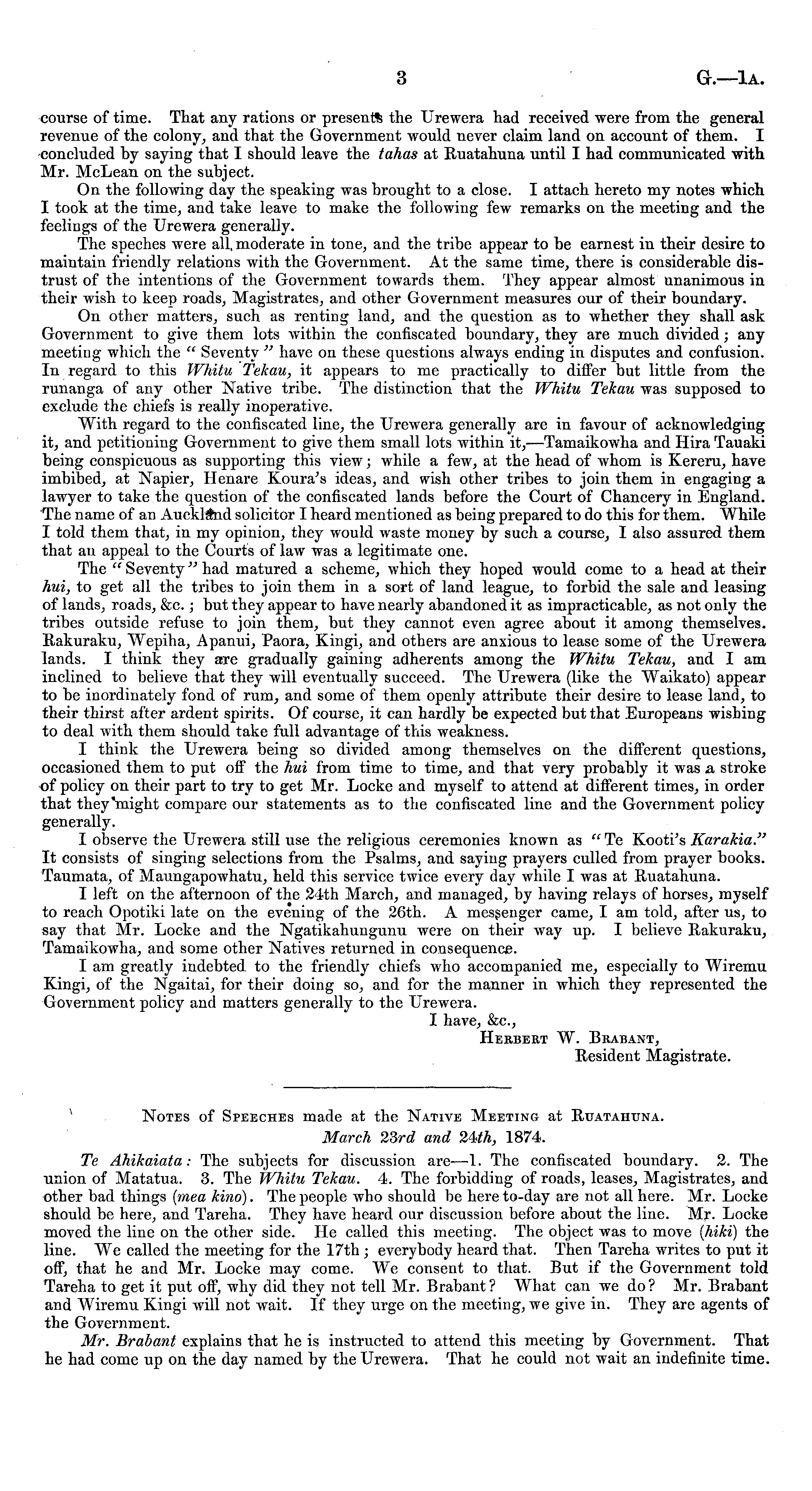 Notes of Speeches made at the Native Meeting at Kuatahuna. March 23rd and 24th, 1874. Te Ahikaiata: The subjects for discussion are- —1. The confiscated boundary. 2. The union of Matatua. 3. The Whitu Tekau. 4. The forbidding of roads, leases. Magistrates, and other bad things (mea kino). The people who should be here to-day are not all here. Mr. Locke should be here, and Tareha. They have heard our discussion before about the line. Mr. Locke moved the line on the other side. He called this meeting. The object was to move (hiki) the line. We called the meeting for the 17th ; everybody heard that. Then Tareha writes to put it off, that he and Mr. Locke may come. We consent to that. But if the Government told Tareha to get it put off, why did they not tell Mr. Brabant? What can we do? Mr. Brabant and Wiremu Kingi will not wait. If they urge on the meeting, we give in. They are agents of the Government. Mr. Brabant explains that he is instructed to attend this meeting by Government. That he had come up on the day named by the Urewera. That he could not wait an indefinite time.