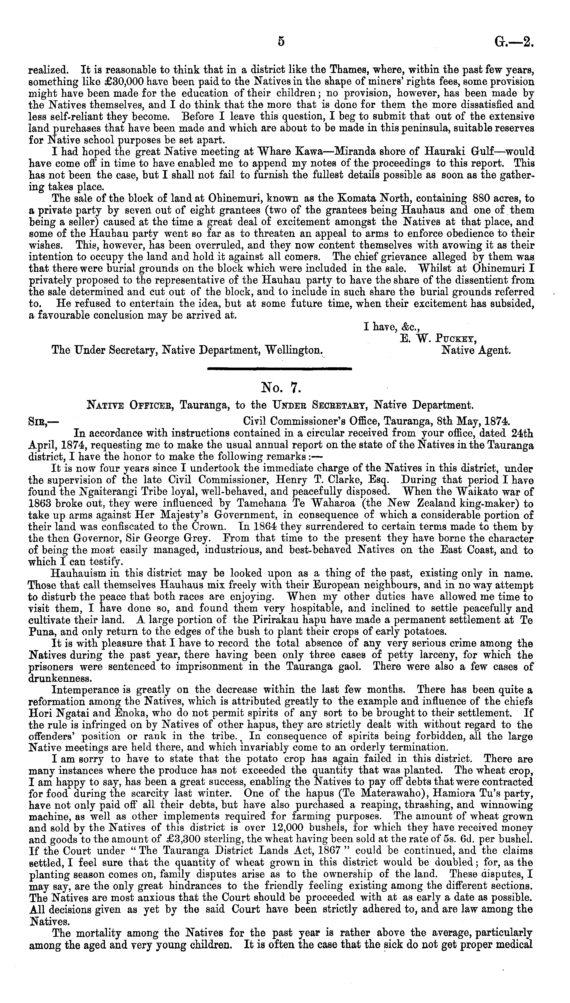 No. 7. Natiye Offices, Tauranga, to the Undee Seceetaet, Native Department. Sib, — Civil Commissioner's Office, Tauranga, Bth May, 1874. In accordance with instructions contained in a circular received from your office, dated 24th April, 1874, requesting me to make the usual annual report on the state of the Natives in the Tauranga district, I have the honor to make the following remarks: — It is now four years since I undertook the immediate charge of the Natives in this district, under the supervision of the late Civil Commissioner, Henry T. Clarke, Esq. During that period I have found the Ngaiterangi Tribe loyal, well-behaved, and peacefully disposed. When the Waikato war of 1863 broke out, they were influenced by Tamchana Te Waharoa (the New Zealand king-maker) to take up arms against Her Majesty's Government, in consequence of which a considerable portion of their land was confiscated to the Crown. In 1864 they surrendered to certain terms made to them by the then Governor, Sir George Grey. From that time to the present they have borne the character of being the most easily managed, industrious, and best-behaved Natives on the East Coast, and to which I can testify. Hauhauism in this district may be looked upon as a thing of the past, existing only in name. Those that call themselves Hauhaus mix freely with their European neighbours, and in no way attempt to disturb the peace that both races are enjoying. When my other duties have allowed me time to visit them, I have done so, and found them very hospitable, and inclined to settle peacefully and cultivate their land. A large portion of the Pirirakau hapu have made a permanent settlement at Te Puna, and only return to the edges of the bush to plant their crops of early potatoes. It is with pleasure that I have to record the total absence of any very serious crime among the Natives during the past year, there having been only three cases of petty larceny, for which the prisoners were sentenced to imprisonment in the Tauranga gaol. There were also a few cases of drunkenness. Intemperance is greatly on the decrease within the last few months. There has been quite a reformation among the Natives, which is attributed greatly to the example and influence of the chiefs Hori Ngatai and Enoka, who do not permit spirits of any sort to be brought to their settlement. If the rule is infringed on by Natives of other hapus, they are strictly dealt with without regard to the offenders' position or rank in the tribe., In consequence of spirits being forbidden, all the large Native meetings are held there, and which invariably come to an orderly termination. lam sorry to have to state that the potato crop has again failed in this district. There are many instances where the produce has not exceeded the quantity that was planted. The wheat crop, I am happy to say, has been a great success, enabling the Natives to pay off debts that were contracted for food during the scarcity last winter. One of the hapus (Te Materawaho), Hamiora Tu's party, have not only paid off all their debts, but have also purchased a reaping, thrashing, and winnowing machine, as well as other implements required for farming purposes. The amount of wheat grown and sold by the Natives of this district is over 12,000 bushels, for which they have received money and goods to the amount of £3,300 sterling, the wheat having been sold at the rate of ss. 6d. per bushel. If the Court under " The Tauranga District Lands Act, 1867 " could be continued, and the claims settled, I feel sure that the quantity of wheat grown in this district would be doubled; for, as the planting season comes on, family disputes arise as to the ownership of the land. These disputes, I may say, are the only great hindrances to the friendly feeling existing among the different sections. The Natives are most anxious that the Court should be proceeded with at as early a date as possible. All decisions given as yet by the said Court have been strictly adhered to, and are law among the Natives. The mortality among the Natives for the past year is rather above the average, particularly among the aged and very young children. It is often the case that the sick do not get proper medical