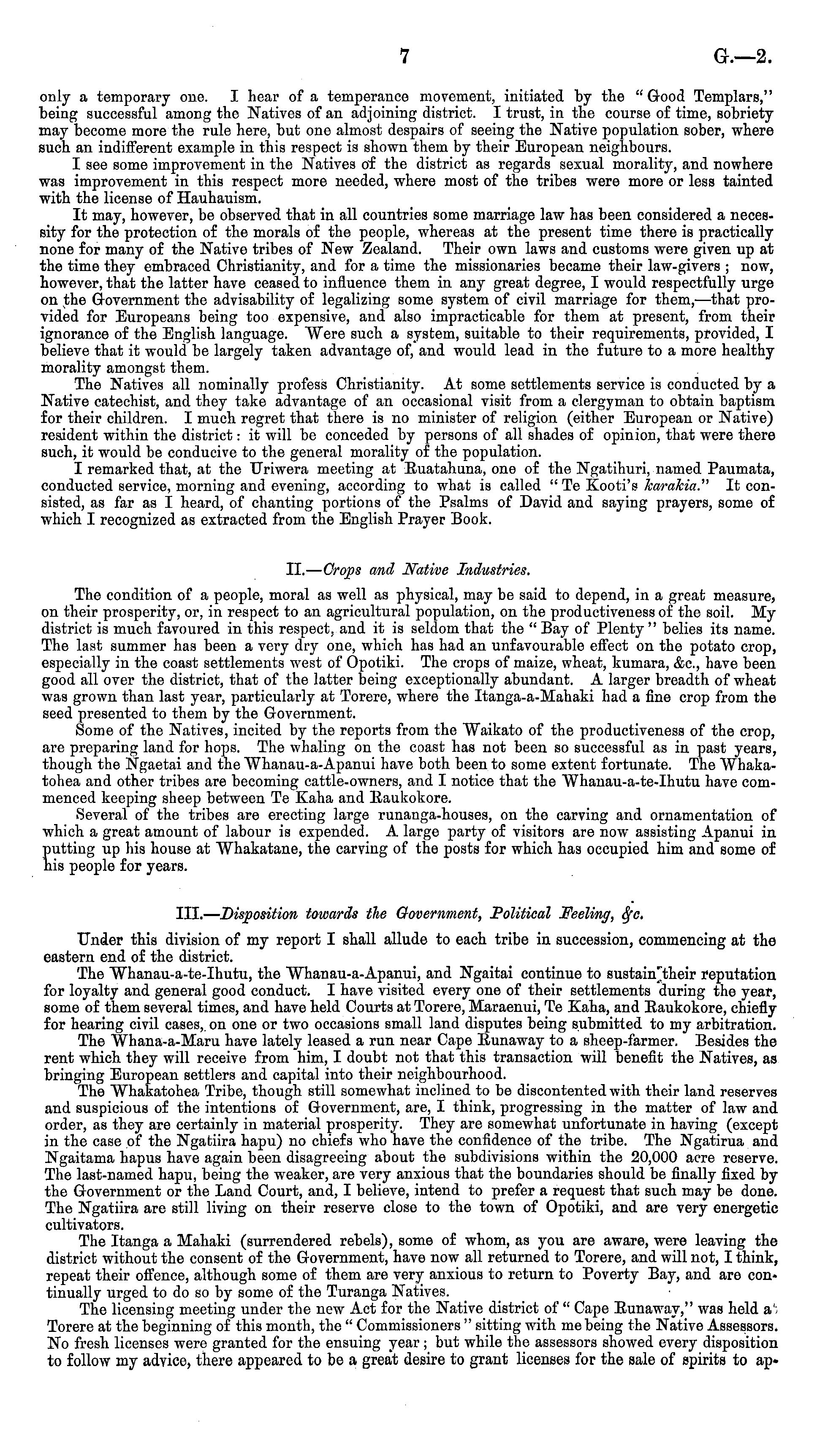 only a temporary one. I hear of a temperance movement, initiated by the " Good Templars," being successful among the Natives of an adjoining district. I trust, in the course of time, sobriety may become more the rule here, but one almost despairs of seeing the Native population sober, where such an indifferent example in this respect is shown them by their European neighbours. I see some improvement in the Natives of the district as regards sexual morality, and nowhere was improvement in this respect more needed, where most of the tribes were more or less tainted with the license of Hauhauism. It may, however, be observed that in all countries some marriage law has been considered a necessity for the protection of the morals of the people, whereas at the present time there is practically none for many of the Native tribes of New Zealand. Their own laws and customs were given up at the time they embraced Christianity, and for a time the missionaries became their law-givers ; now, however, that the latter have ceased to influence them in any great degree, I would respectfully urge on the Government the advisability of legalizing some system of civil marriage for them, —that provided for Europeans being too expensive, and also impracticable for them at present, from their ignorance of the English language. Were such a system, suitable to their requirements, provided, I believe that it would be largely taken advantage of, and would lead in the future to a more healthy morality amongst them. The Natives all nominally profess Christianity. At some settlements service is conducted by a Native catechist, and they take advantage of an occasional visit from a clergyman to obtain baptism for their children. I much regret that there is no minister of religion (either European or Native) resident within the district: it will be conceded by persons of all shades of opinion, that were there such, it would be conducive to the general morality of the population. I remarked that, at the Uriwera meeting at Ruatahuna, one of the Ngatihuri, named Paumata, conducted service, morning and evening, according to what is called "Te Kooti's karakia." It consisted, as far as I heard, of chanting portions of the Psalms of David and saying prayers, some of which I recognized as extracted from the English Prayer Book. ll.— Crops and Native Industries. The condition of a people, moral as well as physical, may be said to depend, in a great measure, on their prosperity, or, in respect to an agricultural population, on the productiveness of the soil. My district is much favoured in this respect, and it is seldom that the " Bay of Plenty " belies its name. The last summer has been a very dry one, which has had an unfavourable eifect on the potato crop, especially in the coast settlements west of Opotiki. The crops of maize, wheat, kumara, &c, have been good all over the district, that of the latter being exceptionally abundant. A larger breadth of wheat was grown than last year, particularly at Torere, where the Itanga-a-Mahaki had a fine crop from the seed presented to them by the Government. Some of the Natives, incited by the reports from the Waikato of the productiveness of the crop, are preparing land for hops. The whaling on the coast has not been so successful as in past years, though the Ngaetai and the Whanau-a-Apanui have both been to some extent fortunate. The Whakatohea and other tribes are becoming cattle-owners, and I notice that the Whanau-a-te-Ihutu have commenced keeping sheep between Te Kaha and Raukokore. Several of the tribes are erecting large runanga-houses, on the carving and ornamentation of which a great amount of labour is expended. A large party of visitors are now assisting Apanui in putting up his house at Whakatane, the carving of the posts for which has occupied him and some of his people for years. lll.— Disposition towards the Government, Political Feeling, Sfc, Under this division of my report I shall allude to each tribe in succession, commencing at the eastern end of the district. The Whanau-a-te-Ihutu, the "Whanau-a-Apanui, and Ngaitai continue to sustain'their reputation for loyalty and general good conduct. I have visited every one of their settlements during the year, some of them several times, and have held Courts at Torere, Maraenui, Te Kaha, and Eaukokore, chiefly for hearing civil cases, on one or two occasions small land disputes being submitted to my arbitration. The Whana-a-Maru have lately leased a run near Cape Runaway to a sheep-farmer. Besides the rent which they will receive from him, I doubt not that this transaction will benefit the Natives, aa bringing European settlers and capital into their neighbourhood. The Whakatohea Tribe, though still somewhat inclined to be discontented with their land reserves and suspicious of the intentions of Government, are, I think, progressing in the matter of law and order, as they are certainly in material prosperity. They are somewhat unfortunate in having (except in the case of the Ngabiira hapu) no chiefs who have the confidence of the tribe. The Ngatirua and Ngaitama hapus have again been disagreeing about the subdivisions within the 20,000 acre reserve. The last-named hapu, being the weaker, are very anxious that the boundaries should be finally fixed by the Government or the Land Court, and, I believe, intend to prefer a request that such may be done. The Ngatiira are still living on their reserve close to the town of Opotiki, and are very energetic cultivators. The Itanga a Mahaki (surrendered rebels), some of whom, as you are aware, were leaving the district without the consent of the Government, have now all returned to Torere, and will not, I think, repeat their offence, although some of them are very anxious to return to Poverty Bay, and are continually urged to do so by some of the Turanga Natives. The licensing meeting under the new Act for the Native district of " Cape Runaway," was held a': Torere at the beginning 