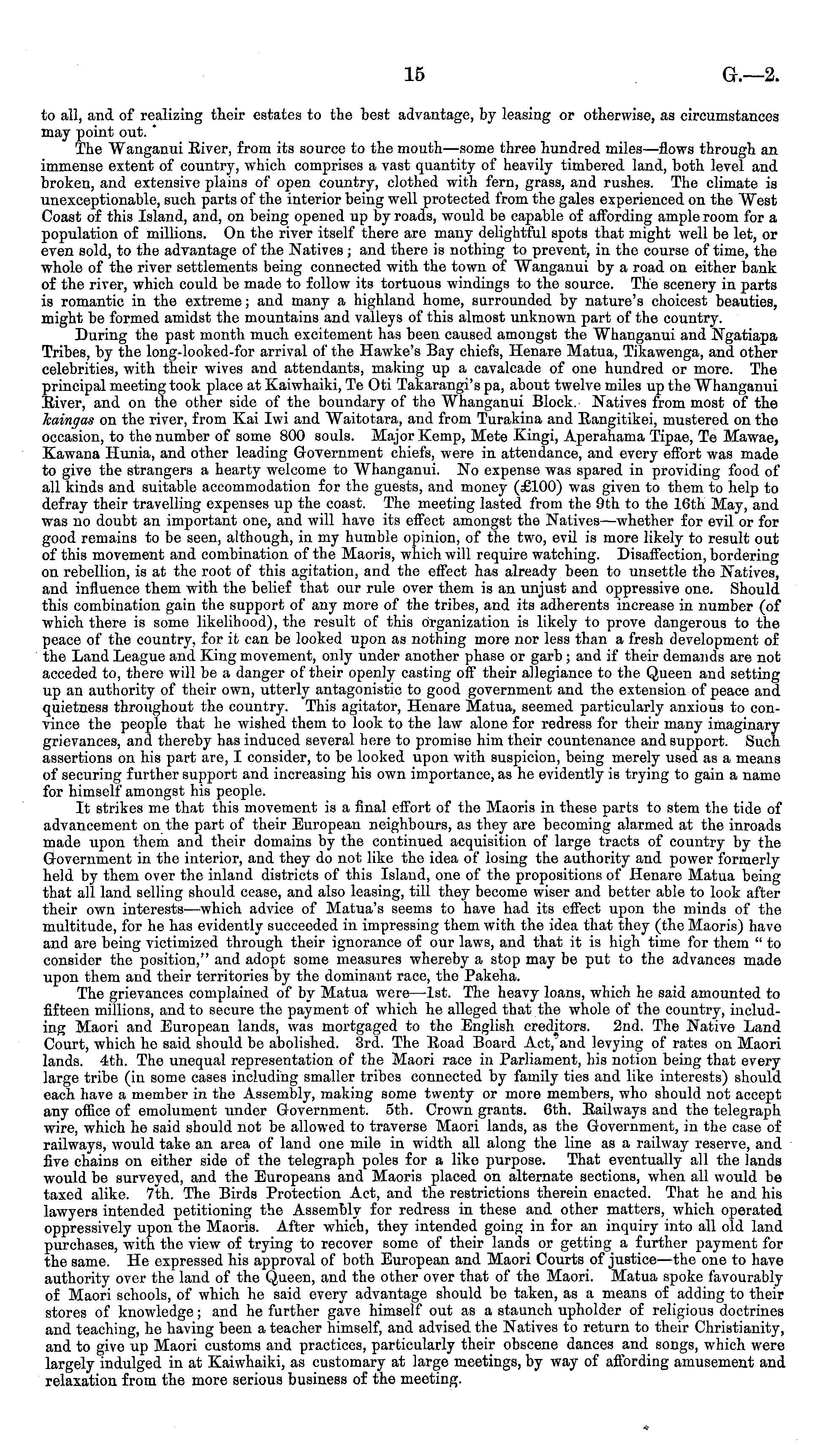 to all, and of realizing their estates to the best advantage, by leasing or otherwise, as circumstances may point out. ' The Wanganui Eiver, from its source to the mouth—some three hundred miles—flows through an immense extent of country, which comprises a vast quantity of heavily timbered land, both level aud broken, and extensive plains of open country, clothed with fern, grass, and rushes. The climate is unexceptionable, such parts of the interior being well protected from the gales experienced on the West Coast of this Island, and, on being opened up by roads, would be capable of affording ample room for a population of millions. On the river itself there are many delightful spots that might well be let, or even sold, to the advantage of the Natives; and there is nothing to prevent, iv the course of time, the whole of the river settlements being connected with the town of Wanganui by a road on either bank of the river, which could be made to follow its tortuous windings to the source. The scenery in parts is romantic iv the extreme; and many a highland home, surrounded by nature's choicest beauties, might be formed amidst the mountains and valleys of this almost unknown part of the country. During the past month much excitement has been caused amongst the Whanganui and Ngatiapa Tribes, by the long-looked-for arrival of the Hawke's Bay chiefs, Henare Matua, Tikawenga, and other celebrities, with their wives and attendants, making up a cavalcade of one hundred or more. The principal meeting took place at Kaiwhaiki, Te Oti Takarangi's pa, about twelve miles up the Whanganui Eiver, and on the other side of the boundary of the Whanganui Block. Natives from most of the kaingas on the river, from Kai Iwi and Waitotara, and from Turakina and Eangitikei, mustered ou the occasion, to the number of some 800 souls. Major Kemp, Mete Kingi, Aperahama Tipae, Te Mawae, Kawana Hunia, and other leading Government chiefs, were iv attendance, and every effort was made to give the strangers a hearty welcome to Whanganui. No expense was spared in providing food of all kinds and suitable accommodation for the guests, and money (£100) was given to them to help to defray their travelling expenses up the coast. The meeting lasted from the 9th to the 16th May, and was no doubt an important one, and will have its effect amongst the Natives—whether for evil or for good remains to be seen, although, in my humble opinion, of the two, evil is more likely to result out of this movement and combination of the Maoris, which will require watching. Disaffection, bordering on rebellion, is at the root of this agitation, and the effect has already been to unsettle the Natives, and influence them with the belief that our rule over them is an unjust and oppressive one. Should this combination gain the support of any more of the tribes, and its adherents increase in number (of which there is some likelihood), the result of this organization is likely to prove dangerous to the peace of the country, for it can be looked upon as nothing more nor less than a fresh development of the Land League and King movement, only under another phase or garb ; and if their demands are not acceded to, there will be a danger of their openly casting off their allegiance to the Queen and setting up an authority of their own, utterly antagonistic to good government and the extension of peace and quietness throughout the country. This agitator, Henare Matua, seemed particularly anxious to convince the people that he wished them to look to the law alone for redress for their many imaginary grievances, and thereby has induced several here to promise him their countenance and support. Such assertions on his part are, I consider, to be looked upon with suspicion, being merely used as a means of securing further support and increasing his own importance, as he evidently is trying to gain a name for himself amongst his people. It strikes me that this movement is a final effort of the Maoris in these parts to stem the tide of advancement on the part of their European neighbours, as they are becoming alarmed at the inroads made upon them and their domains by the continued acquisition of large tracts of country by the Government in the interior, and they do not like the idea of losing the authority and power formerly held by them over the inland districts of this Island, one of the propositions of Henare Matua being that all land selling should cease, and also leasing, till they become wiser and better able to look after their own interests —which advice of Matua's seems to have had its effect upon the minds of tho multitude, for he has evidently succeeded in impressing them with the idea that they (the Maoris) have aud are being victimized through their ignorance of our laws, and that it is high time for them " to consider the position," and adopt some measures whereby a stop may be put to the advances made upon them and their territories by the dominant race, the Pakeha. The grievances complained of by Matua were —Ist. The heavy loans, which he said amounted to fifteen millions, and to secure the payment of which he alleged that the whole of the country, including Maori and European lands, was mortgaged to the English creditors. 2nd. The Native Land Court, which he said should be abolished. 3rd. The Eoad Board Act, and levying of rates on Maori lands. 4th. The unequal representation of the Maori race in Parliament, his notion being that every large tribe (in some cases including smaller tribes connected by family ties and like interests) should each have a member in the Assembly, making some twenty or more members, who should not accept any office of emolument under Government. sth. Crown grants. 6th. Eailways and the telegraph wire, which he said should not be allowed to traverse Maori lands, as the Government, in the case of railways, would take an area of land one mile in width all along the line as a railway reserve, and five chains on eit