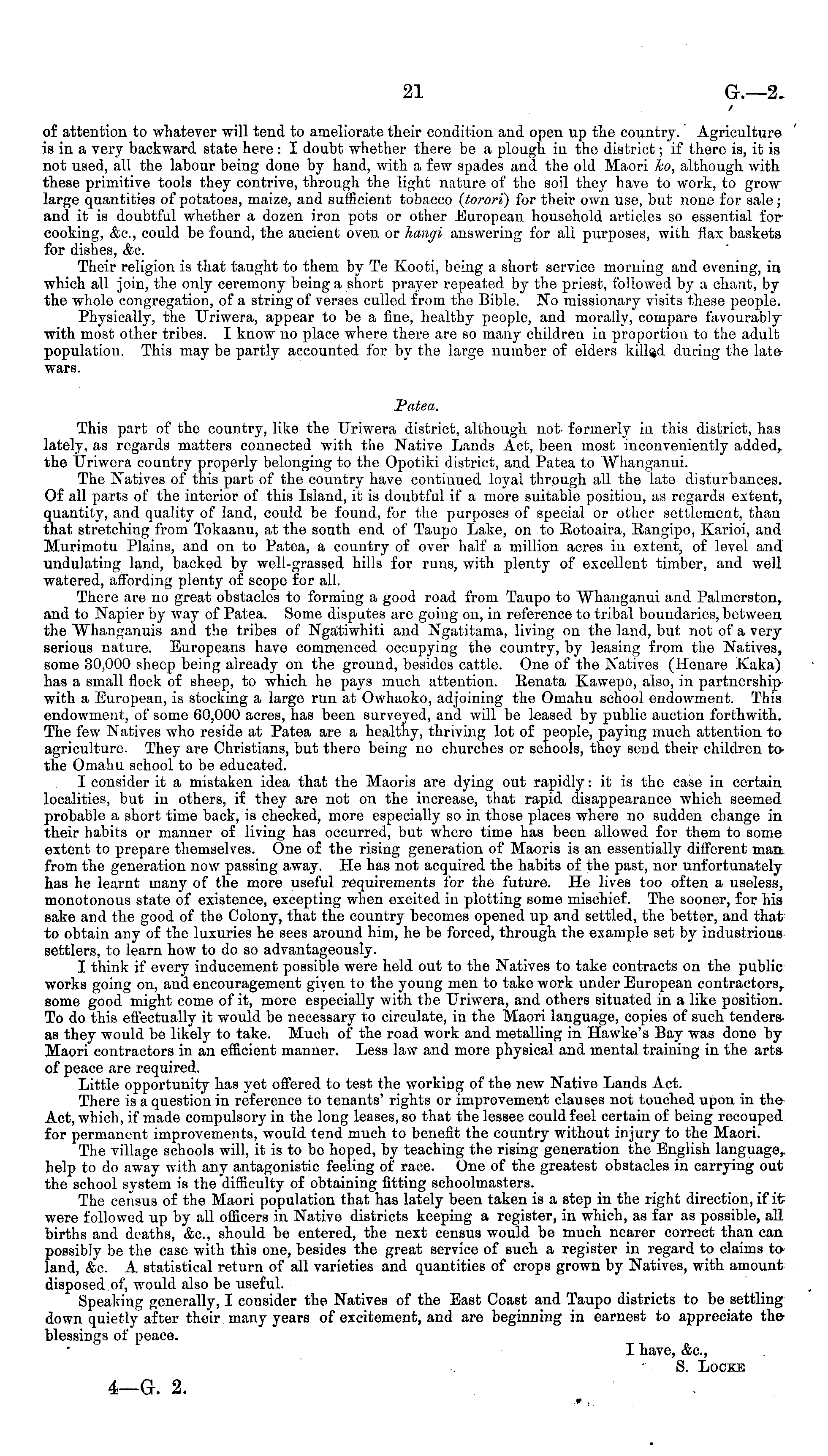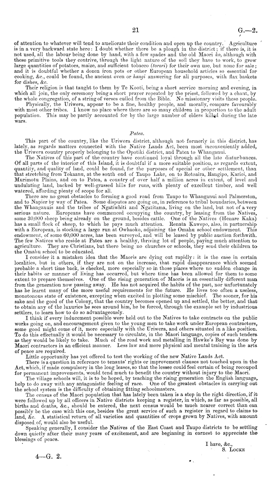 of attention to whatever will tend to ameliorate their condition and open up the country. Agriculture is in a very backward state here : I doubt whether there be a plough in the district; if there is, it is not used, all the labour being done by hand, with a few spades and the old Maori ho, although with these primitive tools they contrive, through the light nature of the soil they have to work, to grow large quantities of potatoes, maize, and sufficient tobacco (torori) for their own use, but none for sale; and it is doubtful whether a dozen iron pots or other European household articles so essential for cooking, &c, could be found, the ancient oven or hangi answering for all purposes, with flax baskets for dishes, &c. Their religion is that taught to them by Te Kooti, being a short service morning and evening, in which all join, the only ceremony being a short prayer repeated by the priest, followed by a chant, by the whole congregation, of a string of verses culled from the Bible. No missionary visits these people. Physically, the Uriwera, appear to be a fine, healthy people, and morally, compare favourably with most other tribes. I know no place where there are so many children in proportion to the adult population. This may be partly accounted for by the large number of elders killed during the late wars. Patea. This part of the country, like the Uriwera district, although not formerly in this district, has lately, as regards matters connected with the Native Lands Act, been most inconveniently added, the Uriwera country properly belonging to the Opotiki district, and Patea to Whanganui. The Natives of this part of the country have continued loyal through all the late disturbances. Of all parts of the interior of this Island, it is doubtful if a more suitable position, as regards extent, quantity, and quality of land, could be found, for the purposes of special or other settlement, than that stretching from Tokaanu, at the south end of Taupo Lake, on to Rotoaira, Eangipo, Karioi, and Murimotu Plains, and on to Patea, a country of over half a million acres in extent, of level and undulating land, backed by well-grassed hills for runs, with plenty of excellent timber, and well watered, affording plenty of scope for all. There are no great obstacles to forming a good road from Taupo to Whanganui and Palmerston, and to Napier by way of Patea. Some disputes are going on, in reference to tribal boundaries, between the Whanganuia and the tribes of Ngatiwhiti and Ngatitama, living on the land, but not of a very serious nature. Europeans have commenced occupying the country, by leasing from the Natives, some 30,000 sheep being already on the ground, besides cattle. One of the Natives (Henare Kaka) has a small flock of sheep, to which he pays much attention. Eenata Kawepo, also, in partnership with a European, is stocking a large run at Owhaoko, adjoining the Omahu school endowment. This endowment, of some 60,000 acres, has been surveyed, and will be leased by public auction forthwith. The few Natives who reside at Patea are a healthy, thriving lot of people, paying much attention to agriculture. They are Christians, but there being no churches or schools, they send their children tothe Omahu school to be educated. I consider it a mistaken idea that the Maoris are dying out rapidly: it is the case in certain localities, but in others, if they are not on the increase, that rapid disappearance which seemed probable a short time back, is checked, more especially so in those places where no sudden change in their habits or manner of living has occurred, but where time has been allowed for them to some extent to prepare themselves. One of the rising generation of Maoris is an essentially different man from the generation now passing away. He has not acquired the habits of the past, nor unfortunately has he learnt many of the more useful requirements for the future. He lives too often a useless, monotonous state of existence, excepting when excited in plotting some mischief. The sooner, for his sake and the good of the Colony, that the country becomes opened up and settled, the better, and that to obtain any of the luxuries he sees around him, he be forced, through the example set by industrious settlers, to learn how to do so advantageously. I think if every inducement possible were held out to the Natives to take contracts on the public works going on, and encouragement given to the young men to take work under European contractors, some good might come of it, more especially with the Uriwera, and others situated in a like position. To do this effectually it would be necessary to circulate, in the Maori language, copies of such tenders as they would be likely to take. Much of the road work and metalling in Hawke's Bay was done by Maori contractors in an efficient manner. Less law and more physical and mental training in the arts of peace are required. Little opportunity has yet offered to test the working of the new Native Lands Act. There is a question in reference to tenants' rights or improvement clauses not touched upon in the Act, which, if made compulsory in the long leases, so that the lessee could feel certain of being recouped for permanent improvements, would tend much to benefit the country without injury to the Maori. The village schools will, it is to be hoped, by teaching the rising generation the English language,, help to do away with any antagonistic feeling of race. One of the greatest obstacles in carrying out the school system is the difficulty of obtaining fitting schoolmasters. The census of the Maori population that has lately been taken is a step in the right direction, if it were followed up by all officers in Native districts keeping a register, in which, as far as possible, all births and deaths, &c, should be entered, the next census would be much nearer correct than can possibly be the case with this one, besides the great service of such a register in regard to claim