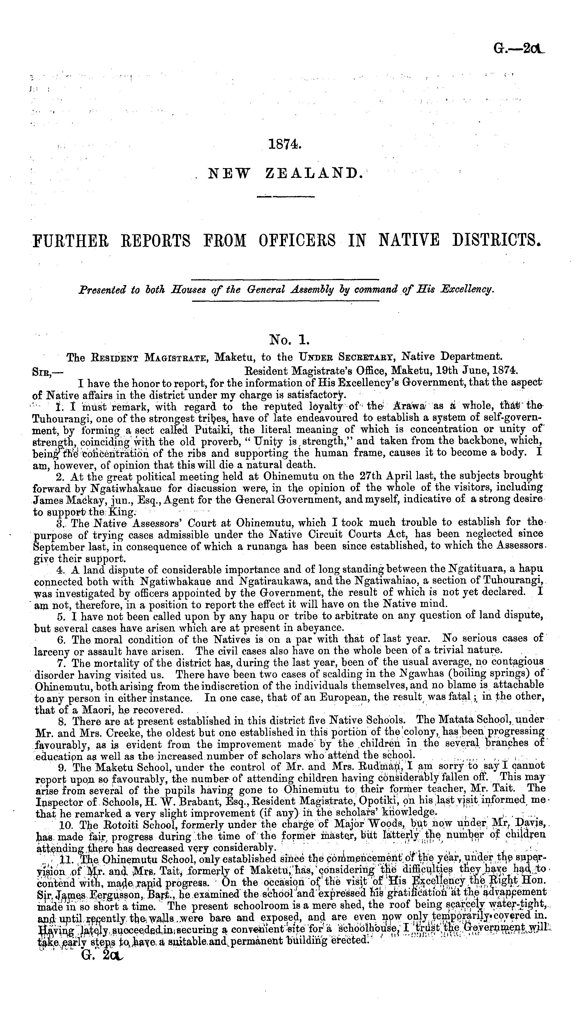 No. 1. The Eesident Magistrate, Maketu, to the Under Secretary, Native Department. Sir, — Eesident Magistrate's Office, Maketu, 19th June, 1874. I have the honor to report, for the information of His Excellency's Government, that the aspect of Native affairs in the district under my charge is satisfactory. 1. I must remark, with regard to the reputed loyalty of the Arawa as a whole, that the Tuhourangi, one of the strongest tribes, have of late endeavoured to establish a system of self-govern-ment, by forming a sect called Putaiki, the literal meaning of which is concentration or unity of' strength, coinciding with the old proverb, " Unity is strength," and taken from the backbone, which, being^th'e concentration of the ribs and supporting the human frame, causes it to become a body. I am, however, of opinion that this will die a natural death. 2. At the great political meeting held at Ohinemutu on the 27th April last, the subjects brought forward by Ngatiwhakaue for discussion were, in the opinion of the whole of the visitors, including James Mackay, jun., Esq., Agent for the General Government, and myself, indicative of a strong desire to support' the King. 3. The Native Assessors' Court at Ohinemutu, which I took much trouble to establish for the purpose of trying cases admissible under the Native Circuit Courts Act, has been neglected since September last, in consequence of which a runanga has been since established, to which the Assessors give their support. 4. A land dispute of considerable importance and of long standing between the Ngatituara, a hapu connected both with Ngatiwhakaue and Ngatiraukawa, and the Ngatiwahiao, a section of Tuhourangi, was investigated by officers appointed by the Government, the result of which is not yet declared. I am not, therefore, in a position to report the effect it will have on the Native mind. 5. I have not been called upon by any hapu or tribe to arbitrate on any question of land dispute, but several cases have arisen which are at present in abeyance. 6. The moral condition of the Natives is on a par with that of last year. No serious cases of larceny or assault have arisen. The civil cases also have on the whole been of a trivial nature. 7. The mortality of the district has, during the last year, been of the usual average, no contagious disorder having visited us. There have been two cases of scalding in the Ngawhas (boiling springs) of Ohinemutu, both arising from the indiscretion of the individuals themselves, and no blame is attachable to any person in either instance. In one case, that of an European, the result was fatal; in the other, that of a Maori, he recovered. 8. There are at present established in this district five Native Schools. The Matata School, under Mr. and Mrs. Creeke, the oldest but one established in this portion of the colony, has been progressing favourably, as is evident from the improvement made by the children in the several branches of education as well as the increased number of scholars who attend the school. 9. The Maketu School, under the control of Mr. and Mrs. Budmari, I am sorry to say I cannot report upon so favourably, the number of attending children having considerably fallen off. This may arise from several of the pupils having gone to Ohinemutu to their former teacher, Mr. Tait. The Inspector of Schools, H. W. Brabant, Esq.,Eesident Magistrate, Opotiki, on his last visit informed me that he remarked a very slight improvement (if any) in the scholars' knowledge. _ 10. The Eotoiti School, formerly under the charge of Major Woods, but now under Mr, Davis, has made fair progress during the time of the former master, but latterly the number of children attending there has decreased very considerably. v -: - 11. The Ohinemutu School, only established since the commencement of the year, under the supervision of Hr. and Mrs. Tait, formerly of Maketu.'nas, considering the difficulties they have had to contend with, made rapid progress. On the occasion of the visit of'His Excellency the Eight Hon. Sir James Eergusson, Bart., he examined the school and expressed his gratification at the advapcement made in so short a time. The present schoolroom is a mere shed, the roof being scarcely water-tight, and until recently the walls.were bare and exposed, and are even now only temporarily.covered in. Having laie,ly suoceeded.in: securing a convenient-site for a schoolhbu'sej I/trust/the Government, will take early steps ta.haye.a suitable andpermanent building erected.' Gr. 20L