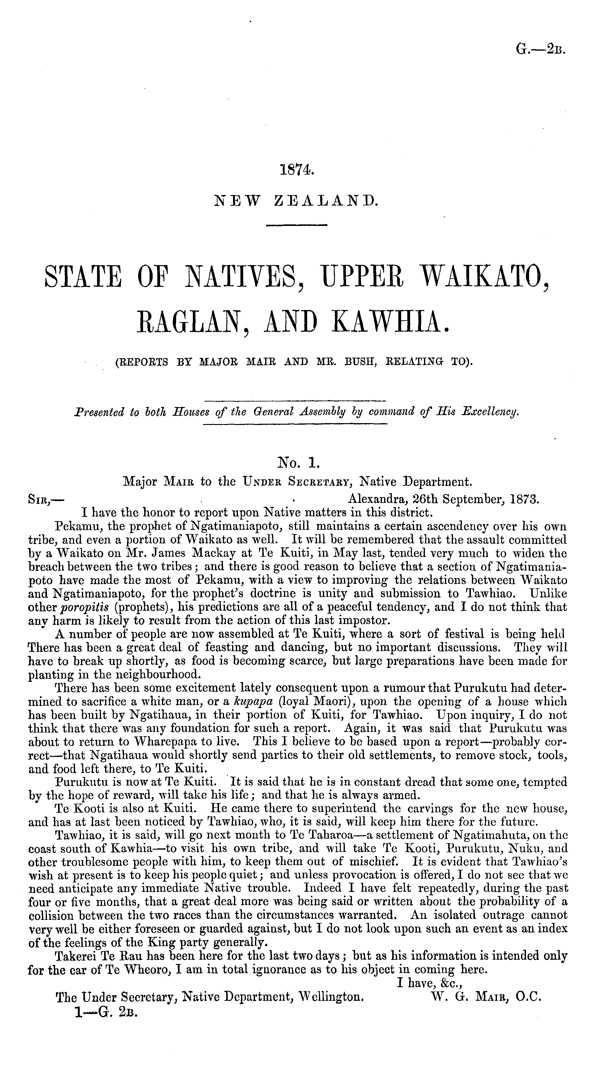 STATE OF NATIVES, UPPER WAIKATO, RAGLAN, AND KAWHIA. (REPORTS BY MAJOR MAIR AND MR. BUSH, RELATING TO).