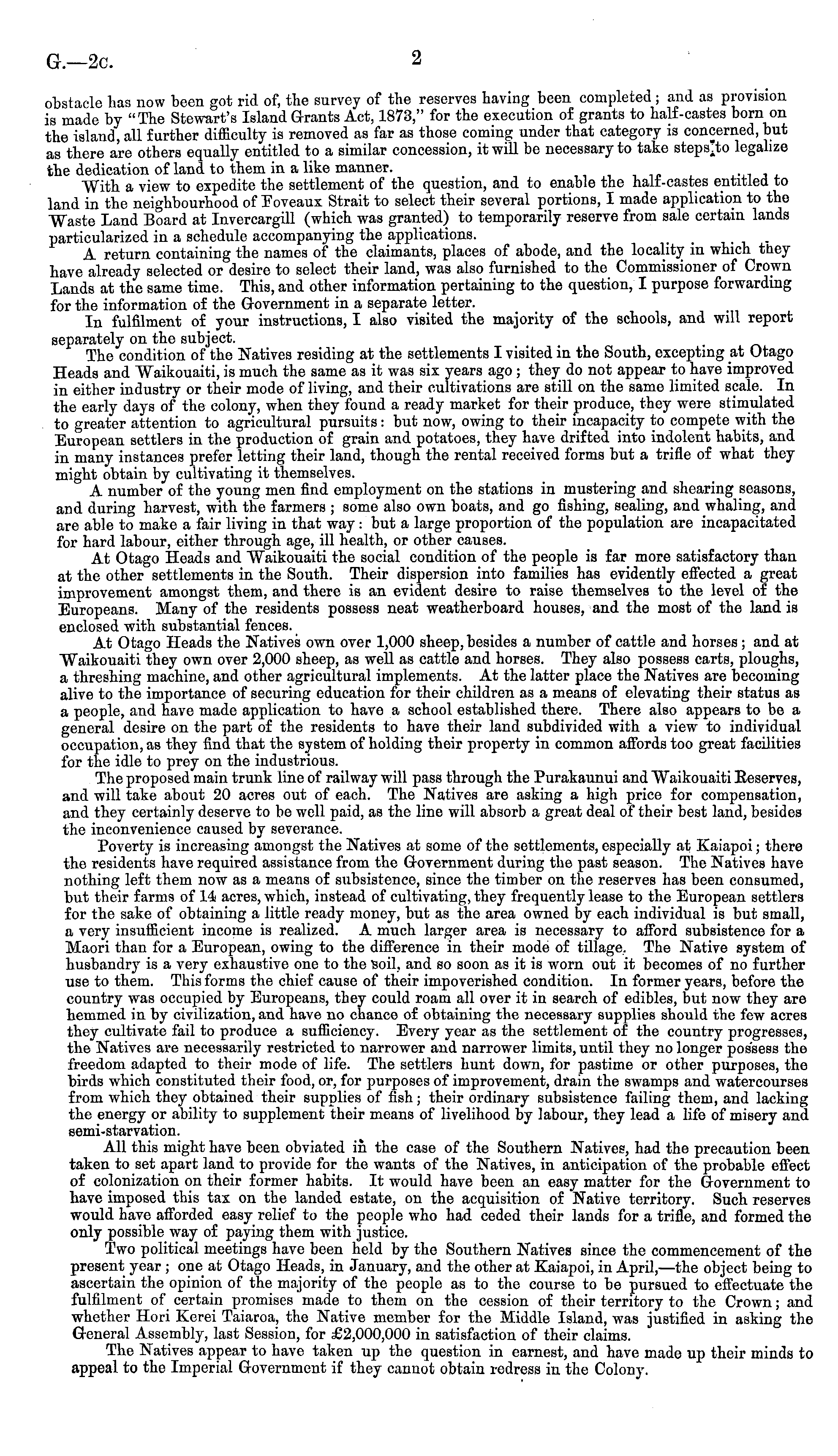 obstacle has now been got rid of, the survey of the reserves having been completed; and as provision is made by "The Stewart's Island Grants Act, 1873," for the execution of grants to half-castes born on the island, all further difficulty is removed as far as those coming under that category is concerned, but as there are others equally entitled to a similar concession, it will be necessary to take steps^to legalize the dedication of land to them in a like manner. With a view to expedite the settlement of the question, and to enable the half-castes entitled to land in the neighbourhood of Foveaux Strait to select their several portions, I made application to the "Waste Land Board at Invercargill (which was granted) to temporarily reserve from sale certain lands particularized in a schedule accompanying the applications. _ A return containing the names of the claimants, places of abode, and the locality in which they have already selected or desire to select their land, was also furnished to the Commissioner of Crown Lands at the same time. This, and other information pertaining to the question, I purpose forwarding for the information of the Government in a separate letter. In fulfilment of your instructions, I also visited the majority of the schools, and will report separately on the subject. The condition of the Natives residing at the settlements I visited in the South, excepting at Otago Heads and Waikouaiti, is much the same as it was six years ago ; they do not appear to have improved in either industry or their mode of living, and their cultivations are still on the same limited scale. In the early days of the colony, when they found a ready market for their produce, they were stimulated to greater attention to agricultural pursuits: but now, owing to their incapacity to compete with the European settlers in the production of grain and potatoes, they have drifted into indolent habits, and in many instances prefer letting their land, though the rental received forms but a trifle of what they might obtain by cultivating it themselves. A number of the young men find employment on the stations in mustering and shearing seasons, and during harvest, with the farmers ; some also own boats, and go fishing, sealing, and whaling, and are able to make a fair living in that way : but a large proportion of the population are incapacitated for hard labour, either through age, ill health, or other causes. At Otago Heads and Waikouaiti the social condition of the people is far more satisfactory than at the other settlements in the South. Their dispersion into families has evidently effected a great improvement amongst them, and there is an evident desire to raise themselves to the level of the Europeans. Many of the residents possess neat weatherboard houses, and the most of the land is enclosed with substantial fences. At Otago Heads the Natives own over 1,000 sheep, besides a number of cattle and horses; and at "Waikouaiti they own over 2,000 sheep, as well as cattle and horses. They also possess carts, ploughs, a threshing machine, and other agricultural implements. At the latter place the Natives are becoming alive to the importance of securing education for their children as a means of elevating their status as a people, and have made application to have a school established there. There also appears to be a general desire on the part of the residents to have their land subdivided with a view to individual occupation, as they find that the system of holding their property in common affords too great facilities for the idle to prey on the industrious. The proposed main trunk line of railway will pass through the Purakaunui and Waikouaiti Eeserves, and will take about 20 acres out of each. The Natives are asking a high price for compensation, and they certainly deserve to be well paid, as the line will absorb a great deal of their best land, besides the inconvenience caused by severance. Poverty is increasing amongst the Natives at some of the settlements, especially at Kaiapoi; there the residents have required assistance from the Government during the past season. The Natives have nothing left them now as a means of subsistence, since the timber on the reserves has been consumed, but their farms of 14 acres, which, instead of cultivating, they frequently lease to the European settlers for the sake of obtaining a little ready money, but as the area owned by each individual is but small, a very insufficient income is realized. A much larger area is necessary to afford subsistence for a Maori than for a European, owing to the difference in their mode of tillage. The Native system of husbandry is a very exhaustive one to the soil, and so soon as it is worn out it becomes of no further use to them. This forms the chief cause of their impoverished condition. In former years, before the country was occupied by Europeans, they could roam all over it in search of edibles, but now they are hemmed in by civilization, and have no chance of obtaining the necessary supplies should the few acres they cultivate fail to produce a sufficiency. Every year as the settlement of the country progresses, the Natives are necessarily restricted to narrower and narrower limits, until they no longer possess the freedom adapted to their mode of life. The settlers hunt down, for pastime or other purposes, the birds which constituted their food, or, for purposes of improvement, drain the swamps and watercourses from which they obtained their supplies of fish; their ordinary subsistence failing them, and lacking the energy or ability to supplement their means of livelihood by labour, they lead a life of misery and semi-starvation. All this might have been obviated in the case of the Southern Natives, had the precaution been taken to set apart land to provide for the wants of the Natives, in anticipation of the probable effect of colonization on their former habits. It would have been an easy matter for the Government to h