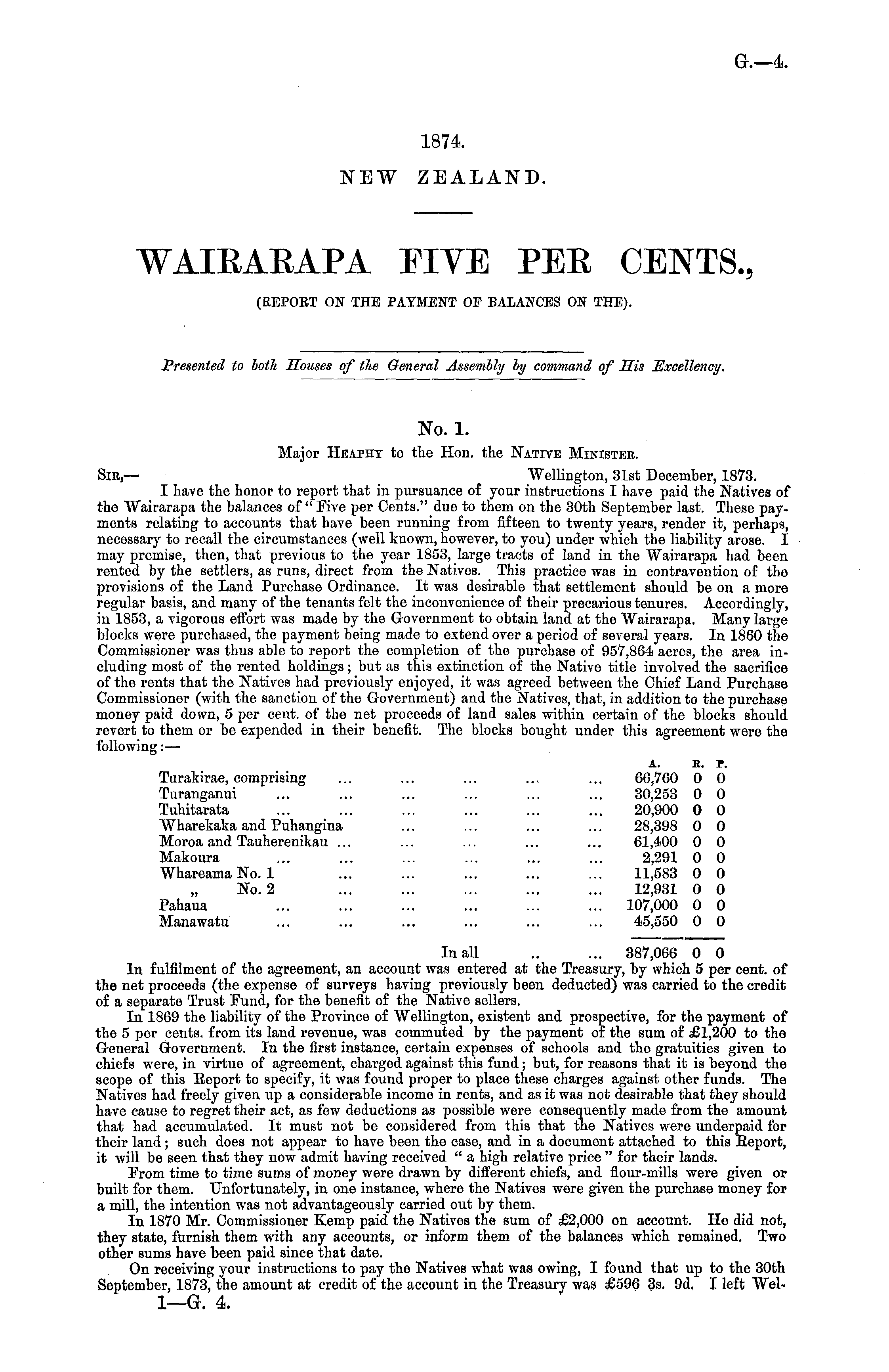 Presented to both Houses of the General Assembly by command of His Excellency. No. 1. Major Heapht to the Hon. the Native Ministeb. Sib,— "Wellington, 31st December, 1873. I have the honor to report that in pursuance of your instructions I have paid the Natives of the Wairarapa the balances of " Five per Cents." due to them on the 30th September last. These payments relating to accounts that have been running from fifteen to twenty years, render it, perhaps, necessary to recall the circumstances (well known, however, to you) under which the liability arose. I may premise, then, that previous to the year 1853, large tracts of land in the Wairarapa had been rented by the settlers, as runs, direct from the Natives. This practice was in contravention of tho provisions of the Land Purchase Ordinance. It was desirable that settlement should be on a more regular basis, and many of the tenants felt the inconvenience of their precarious tenures. Accordingly, in 1853, a vigorous effort was made by the Government to obtain land at the Wairarapa. Many large blocks were purchased, the payment being made to extend over a period of several years. In 1860 the Commissioner was thus able to report the completion of the purchase of 957,864 acres, the area including most of the rented holdings; but as this extinction of the Native title involved the sacrifice of the rents that the Natives had previously enjoyed, it was agreed between the Chief Land Purchase Commissioner (with the sanction of the Government) and the Natives, that, in addition to the purchase money paid down, 5 per cent, of the net proceeds of land sales within certain of the blocks should revert to them or be expended in their benefit. The blocks bought under this agreement were the following:—