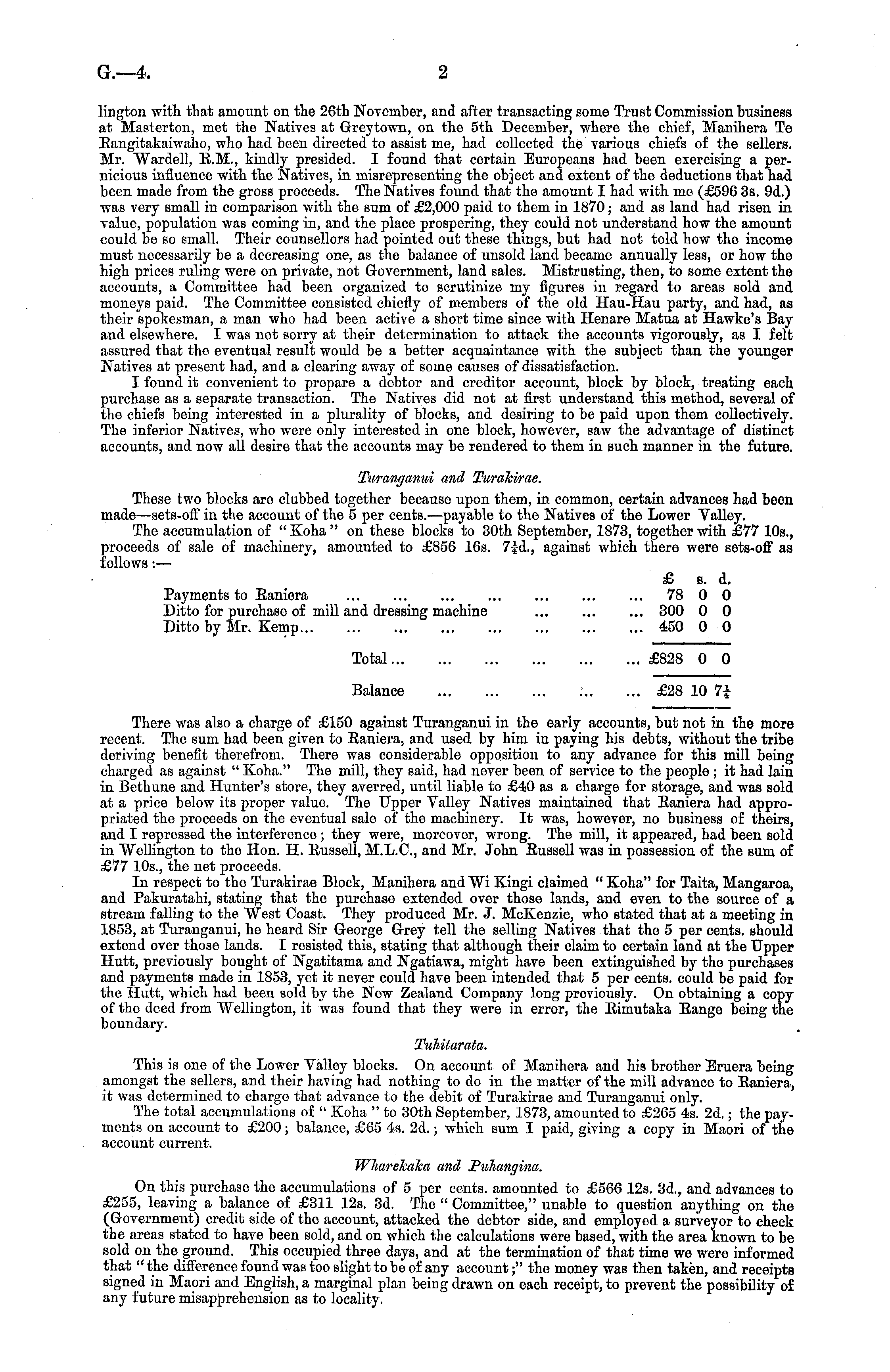 This is one of the Lower Valley blocks. On account of Manihera and his brother Eruera being amongst the sellers, and their having had nothing to do in the matter of the mill advance to Raniera, it was determined to charge that advance to the debit of Turakirae and Turanganui only. The total accumulations of " Koha "to 30th September, 1873, amounted to £265 4s. 2d.; the payments on account to £200; balance, £65 4s. 2d.; which sum I paid, giving a copy in Maori of the account current.
