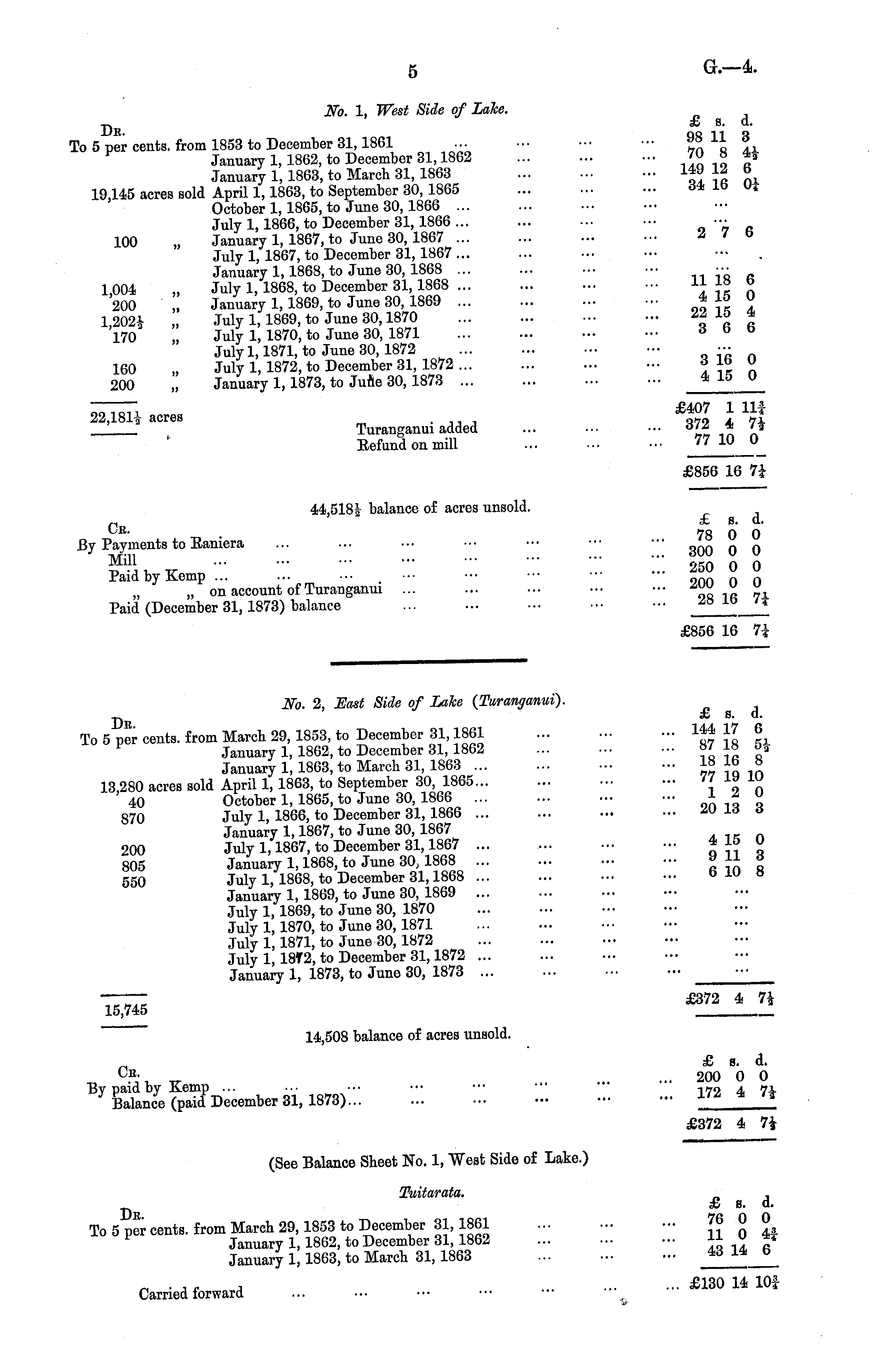 M. 2, Hast Side of Lake (Turanganui). To 5 per cents, from March 29, 1853, to December 31,1861 January 1, 1862, to December 31, 1862 January 1, 1863, to March 31, 1863 ... 13 280 acres sold April 1, 1863, to September 30, 1865... 40 October 1, 1865, to June 30, 1866 870 July 1, 1866, to December 31, 1866 ... January 1,1867, to June 30, 1867 200 July 1,1867, to December 31,1867 ... 805 January 1,1868, to June 30,1868 550 July 1,1868, to December 31,1868 ... January 1, 1869, to June 30, 1869 ... July 1,1869, to June 30, 1870 July 1,1870, to June 30,1871 July 1,1871, to June 30,1872 July 1, 18T2, to December 31,1872 ... January 1, 1873, to June 30, 1873 ... 15,745 £ s. d. ... 144 17 6 ... 87 18 5* ... 18 16 8 ... 77 19 10 12 0 ... 20 13 3 4 15 0 9 11 3 6 10 8 £372 4 7£ 14,508 balance of acres unsold. Ce. BypaidbyKemp ... Balance (paid December 31, 1873)... £ s. d. 200 0 0 ... 172 4 7i £372 4 7£ (See Balance Sheet No. 1, West Side of Lake.) Tuitarata. De To 5 per cents, from March 29,1853 to December 31,1861 January 1,1862, to December 31, 1862 January 1,1863, to March 31,1863 £ s. d. 76 0 0 11 0 4| 43 14 6 Carried forward M ... £130 14 10|