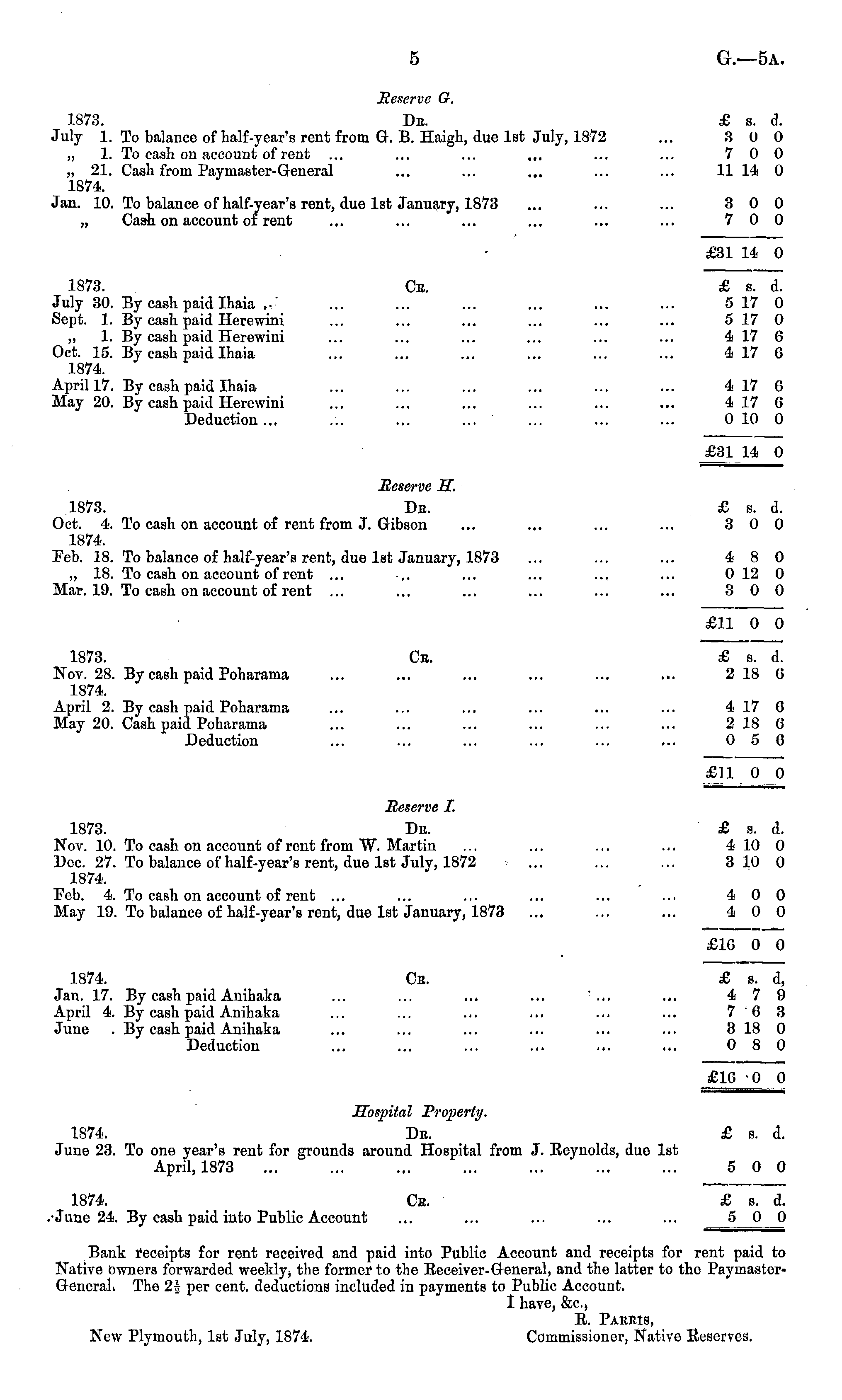 Reserve O. 1873. De. £ s. d. July 1. To balance of half-year's rent from G. B. Haigh, due 1st July, 1872 ... 3 0 0 „ 1. To cash on account of rent ... ... ... ... ... ... 7 0 0 „ 21. Cash from Paymaster-General ... ... ... ... ... 11 14 0 1874. Jan. 10. To balance of half-year's rent, due 1st January, 1873 ... ... ... 3 0 0 „ Cast on account of rent ... ... ... ... ... ... 7 0 0 £31 14 0 1873. Ce. £ s. d. July 30. By cash paid Ihaia ,-■' ... ... ... ... ... ... 5 17 0 Sept. 1. By cash paid Herewini ... ... ... ... ... ... 5 17 0 ,, 1. By cash paid Herewini ... ... ... ... ... ... 4 17 6 Oct. 15. By cash paid Ihaia ... ... ... ... ... ... 4 17 6 1874. April 17. By cash paid Ihaia ... ... ... ... ... ... 4 17 6 May 20. By cash paid Herewini ... ... ... ... ... ... 4 17 G Deduction... ... ... ... ... ... ... 0 10 0 _£31 14 0 Reserve H. 1873. Db. £ s. d. Oct. 4. To cash on account of rent from J. Gibson ... ... ... ... 3 0 0 1874. Feb. 18. To balance of half-year's rent, due 1st January, 1873 ... ... ... 480 ,, 18. To cash on account of rent ... .. ... ... ... ... 0 12 0 Mar. 19. To cash on account of rent ... ... ... ... ... ... 3 0 0 £11 0 0 1873. Ch. £ s. d. Nov. 28. By cash paid Poharama ... ... ... ... ... ... 2 18 (5 1874. April 2. By cash paid Poharama ... ... ... ... ... ... 4 17 6 May 20. Cash paid Poharama ... ... ... ... ... ... 2 18 6 Deduction ... ... ... ... ... ... 0 5 6 £11 0 0 Reserve I. 1873. Dn. £ 8. d. Nov. 10. To cash on account of rent from W. Martin ... ... ... ... 4 10 0 Dec. 27. To balance of half-year's rent, due 1st July, 1872 ... ... ... 3 10 0 1874. Feb. 4. To cash on account of rent ... ... ... ... ... ... 400 May 19. To balance of half-year's rent, due 1st January, 1873 ... ... ... 4 0 0 £16 0 0 1874. Ce. £ s. d, Jan. 17. By cash paid Anihaka ... ... ... ... "... ... 4 7 9 April 4. By cash paid Anihaka ... ... ... ... ... ... 7 6 3 June . By cash paid Anihaka ... ... ... ... ... ... 3 18 0 Deduction ... ... ... ... ... ... 0 8 0 £1G 0 0 Hospital Property, 1874. De. £ s. d. June 23. To one year's rent for grounds around Hospital from J. Reynolds, due 1st April, 1873 ... ... ... ... ... ... ... 5 0 0 1874. Ce. £ s. d. •June 24. By cash paid into Public Account ... ... ... ... ... 500 Bank Receipts for rent received and paid into Public Account and receipts for rent paid to Native owners forwarded weekly; the former to the Receiver-General, and the latter to the PaymasterGeneraL The 2\ per cent, deductions included in payments to Public Account. I have, &c, R. PaeeIS, New Plymouth, 1st July, 1874. Commissioner, Native Reserves.